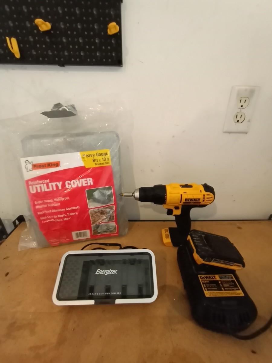 DEWALT 1/2" CORDLESS DRILL MODEL DCD771-ENERGIZER BATTERY CHARGER AND UTILITY COVER HEAVY GAUGE 8X10