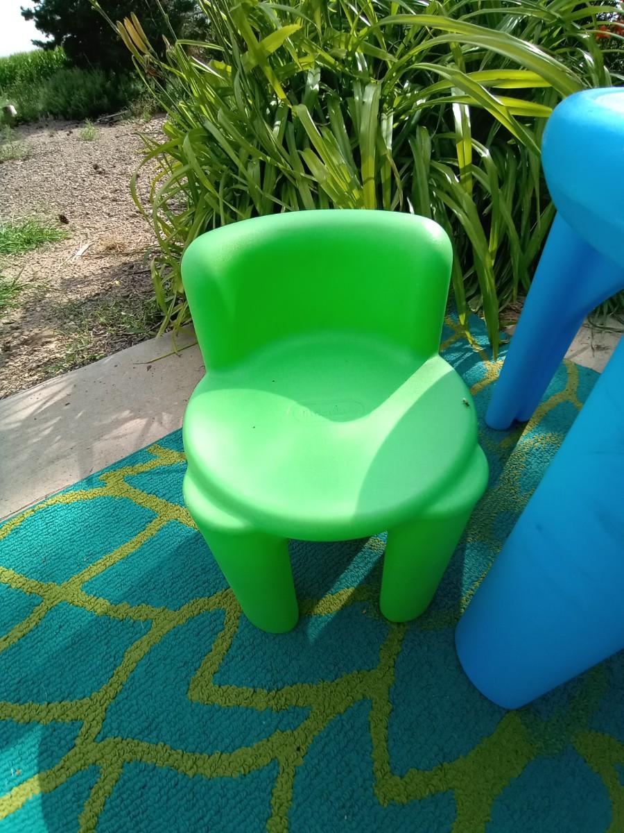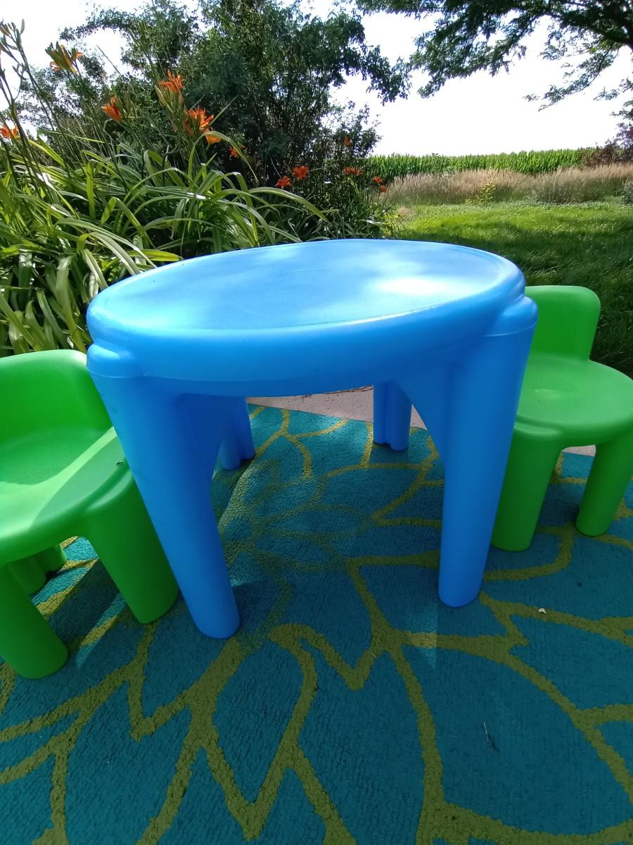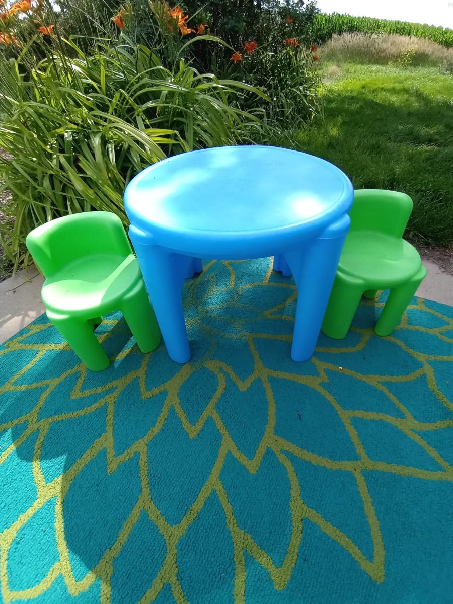 LOT 505 CHILD'S TABLE WITH 2 CHAIRS AND AN OUTDOOR RUG  (G)