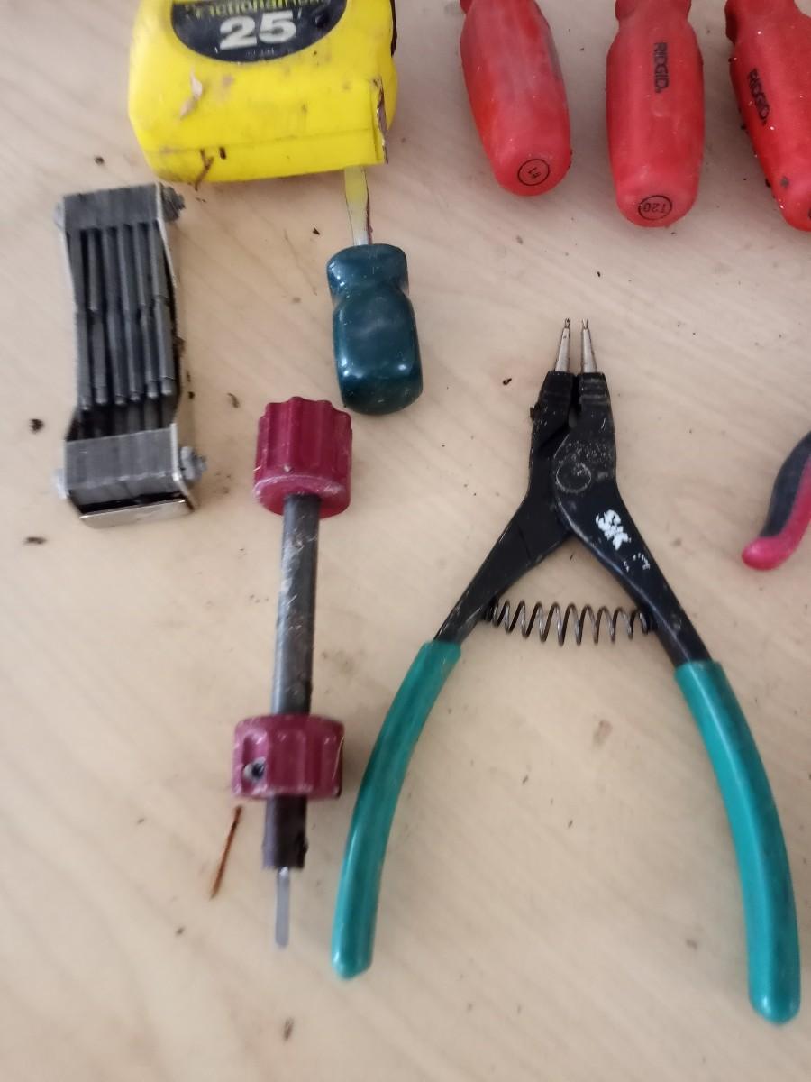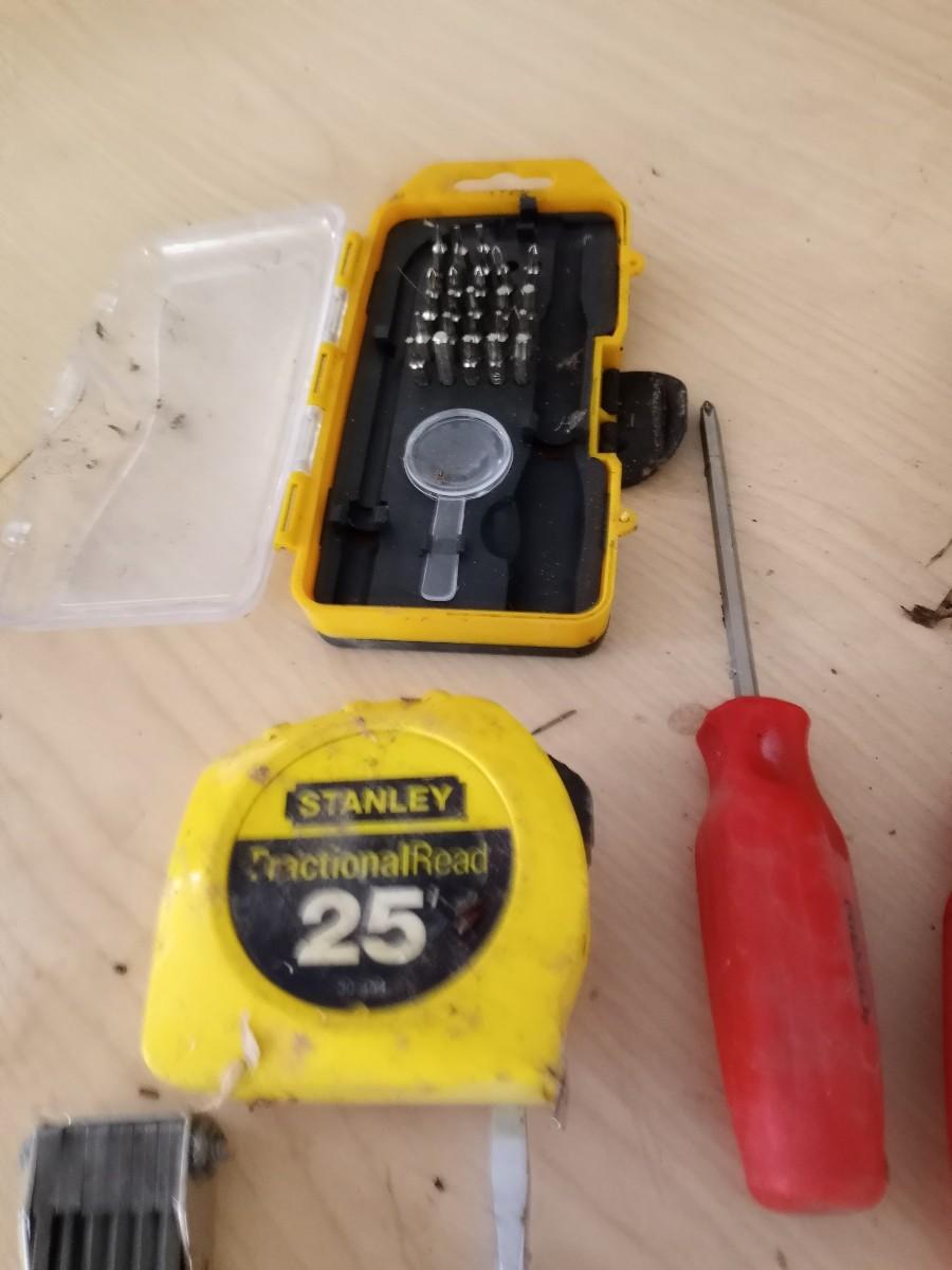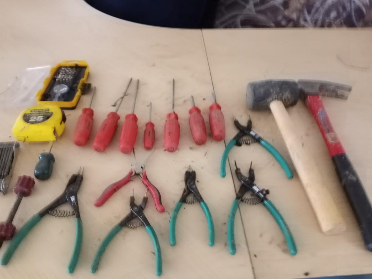 HAND TOOLS-MEASURE TAPE, NEEDLE NOSE PLIERS, SET OF SCREW DRIVERS HAMMER AND MORE