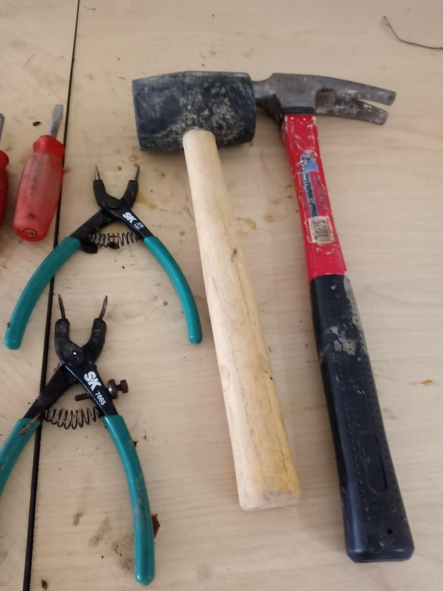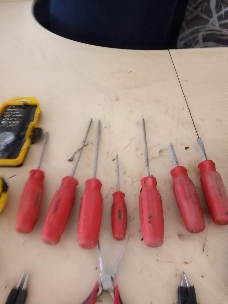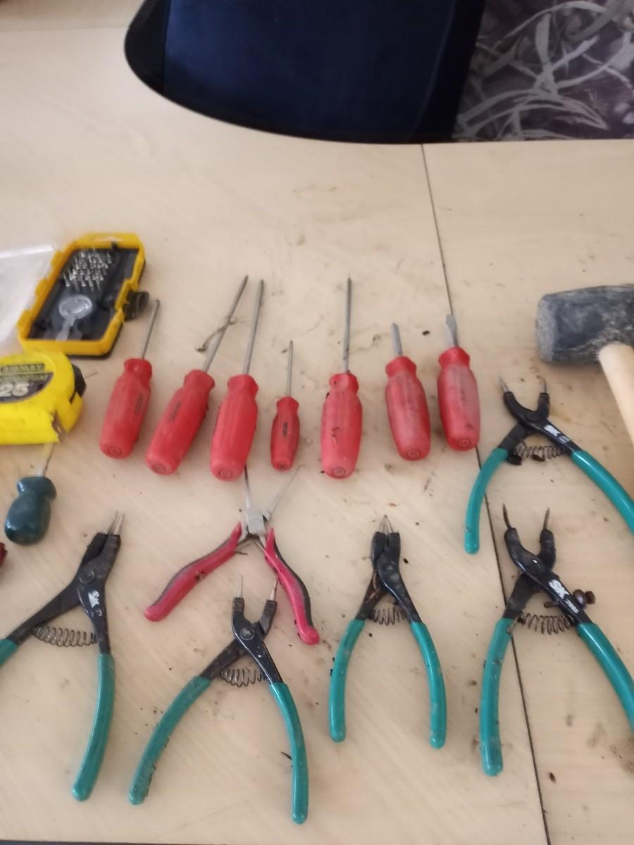 HAND TOOLS-MEASURE TAPE, NEEDLE NOSE PLIERS, SET OF SCREW DRIVERS HAMMER AND MORE