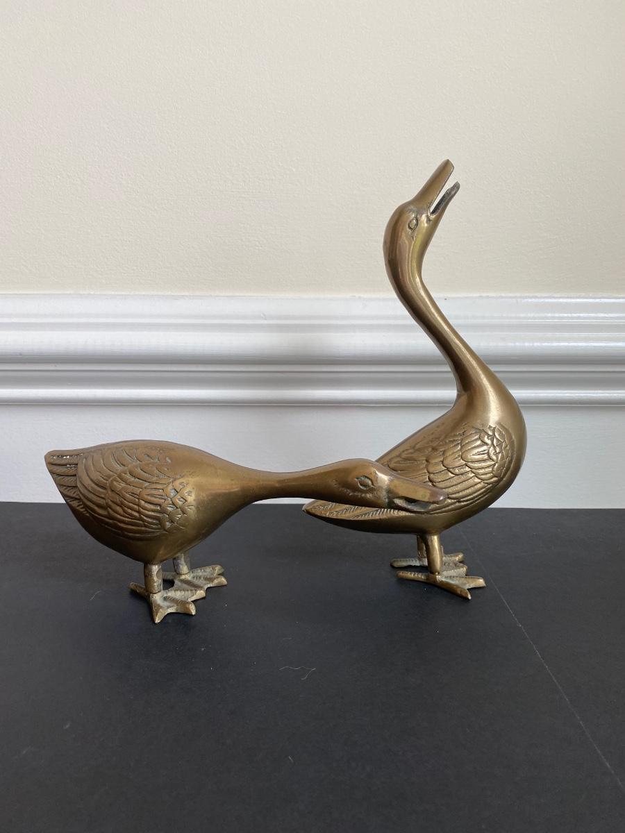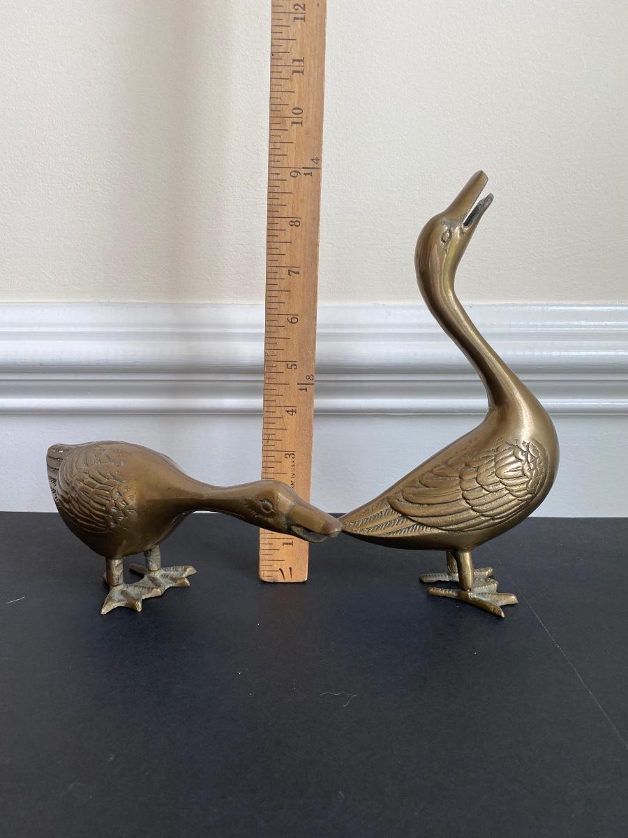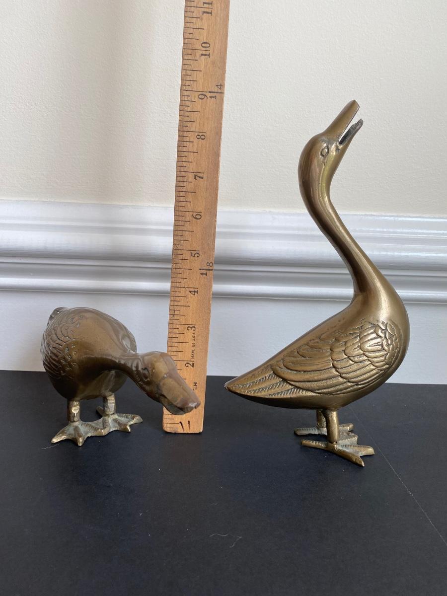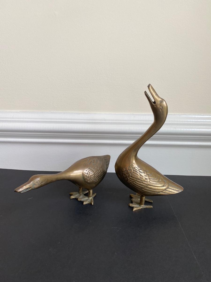 Pair of brass ducks. Please see all pictures as they are the best representation of the items. The pictures show condition, measurements if taken, and what is included in the lot. Due to the large amount that we photograph and the time frame, we are not always able to take measurements. All items unless noted, are pre-owned and have been used. If you purchased furniture, you must bring help. We do not allow one person to carry large furniture out on their own. Bring help, tools and a truck for the safety of our client’s homes, and your personal safety. Any damages that result to the property including walls, and floors due to moving of the furniture will be charged to the buyer. Company policy. Thank you.