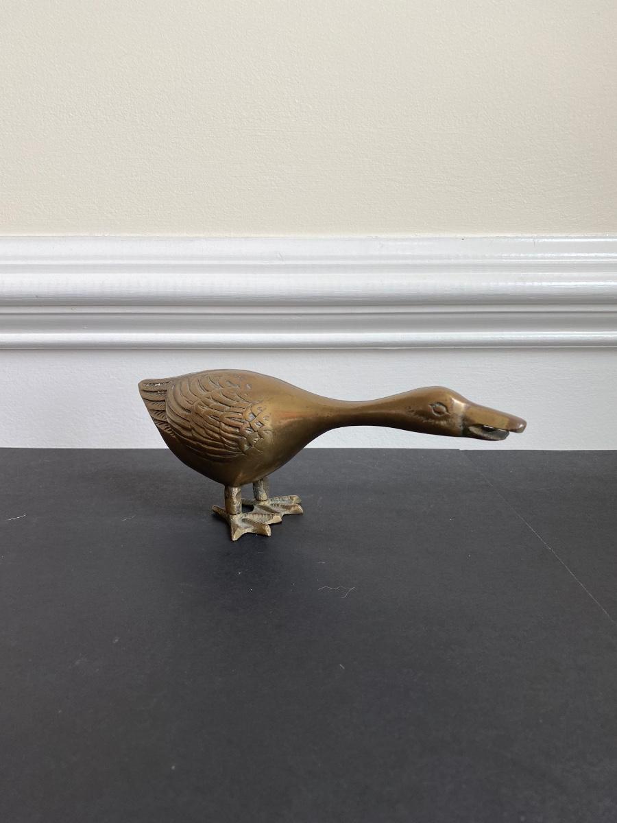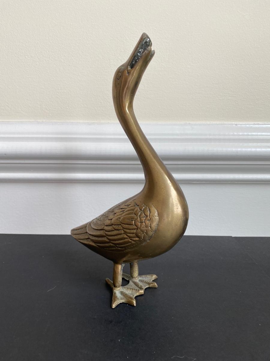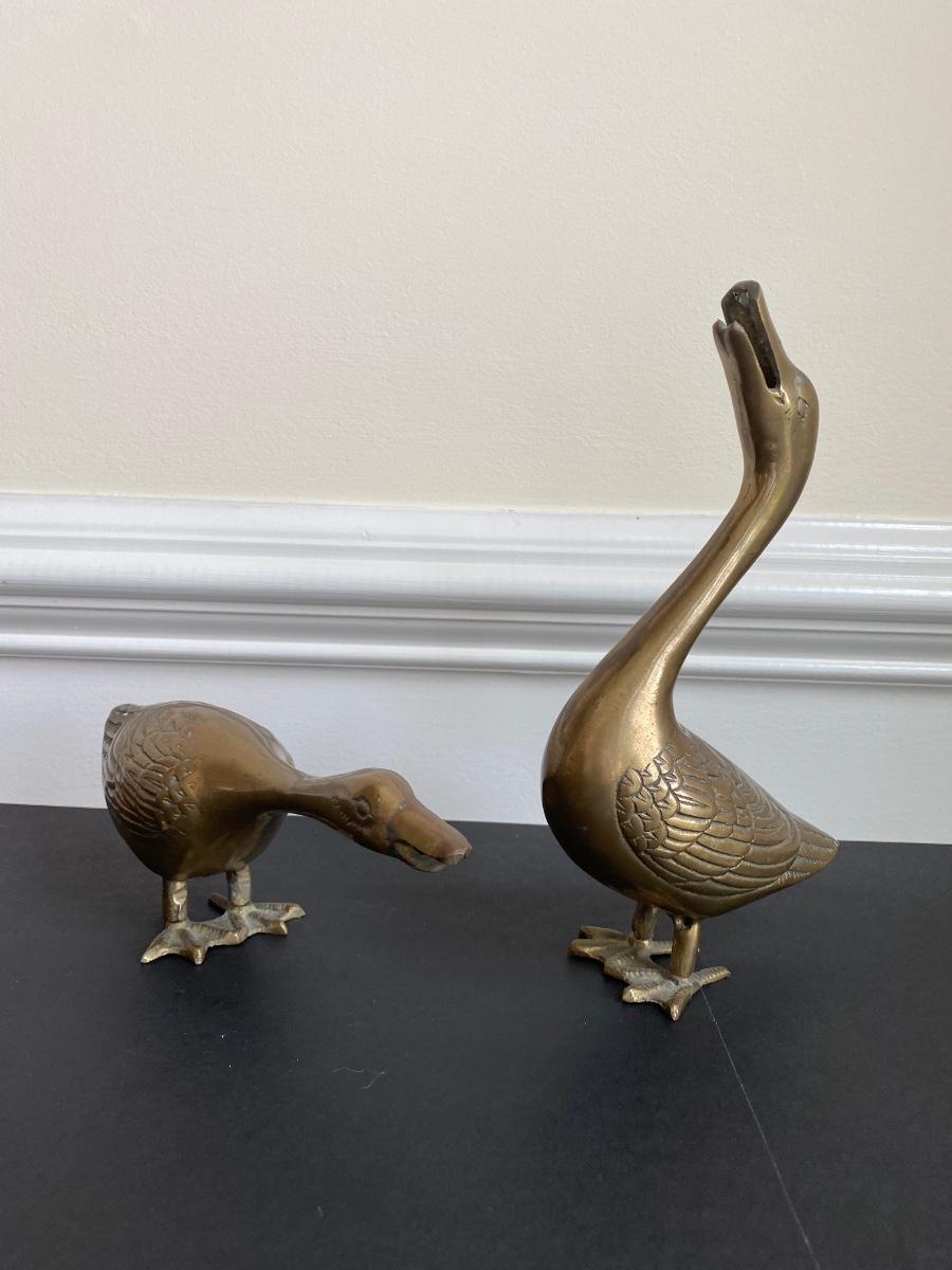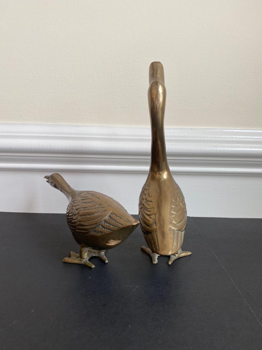 Pair of brass ducks. Please see all pictures as they are the best representation of the items. The pictures show condition, measurements if taken, and what is included in the lot. Due to the large amount that we photograph and the time frame, we are not always able to take measurements. All items unless noted, are pre-owned and have been used. If you purchased furniture, you must bring help. We do not allow one person to carry large furniture out on their own. Bring help, tools and a truck for the safety of our client’s homes, and your personal safety. Any damages that result to the property including walls, and floors due to moving of the furniture will be charged to the buyer. Company policy. Thank you.