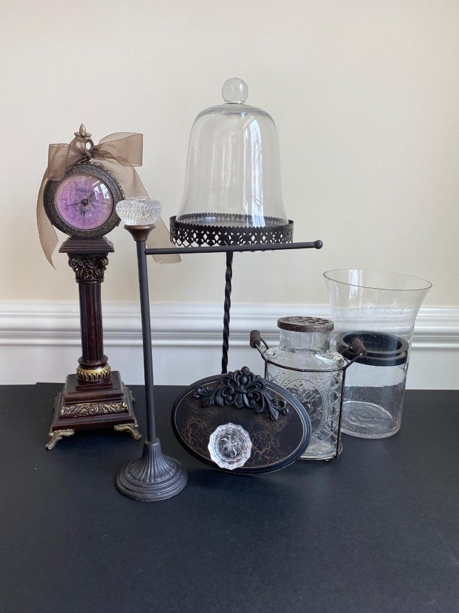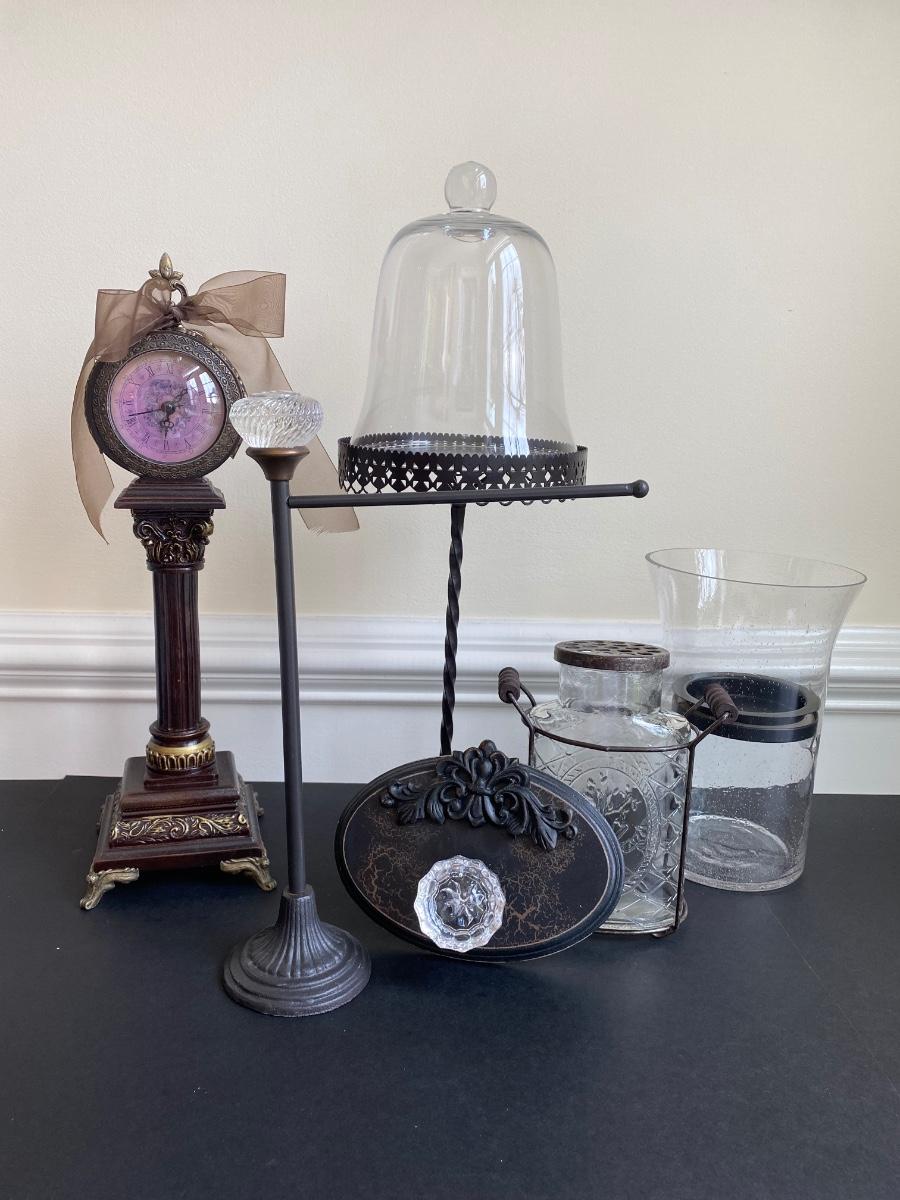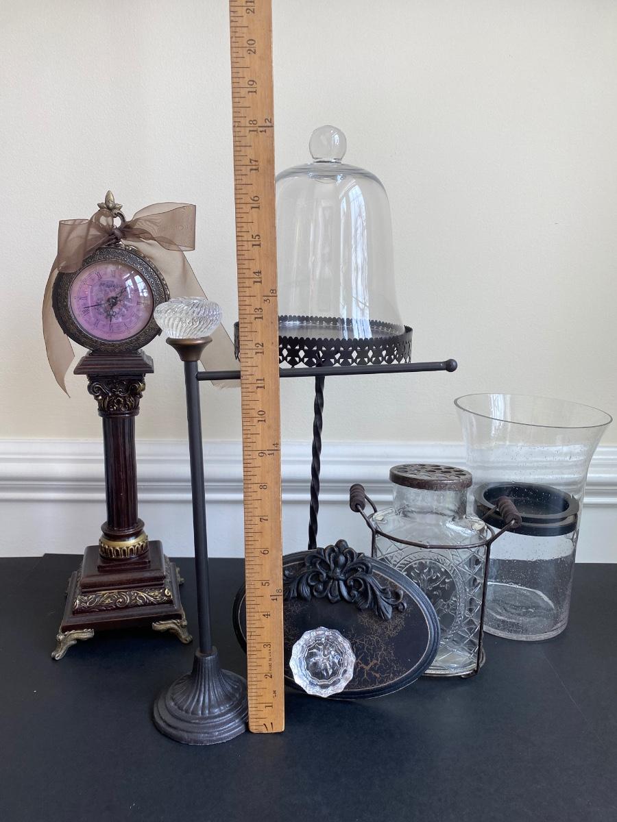 Six pieces of home accent pieces. Candle holder, tea towel or jewelry holder, clock and more. Please see all pictures as they are the best representation of the items. The pictures show condition, measurements if taken, and what is included in the lot. Due to the large amount that we photograph and the time frame, we are not always able to take measurements. All items unless noted, are pre-owned and have been used. If you purchased furniture, you must bring help. We do not allow one person to carry large furniture out on their own. Bring help, tools and a truck for the safety of our client’s homes, and your personal safety. Any damages that result to the property including walls, and floors due to moving of the furniture will be charged to the buyer. Company policy. Thank you.