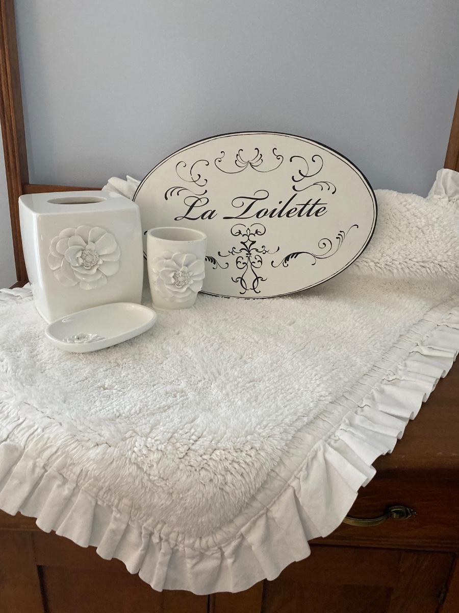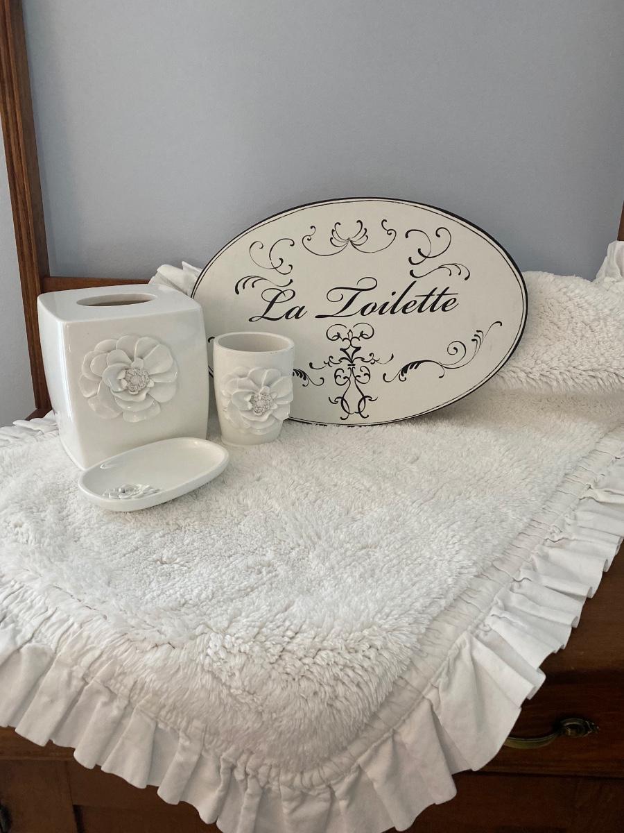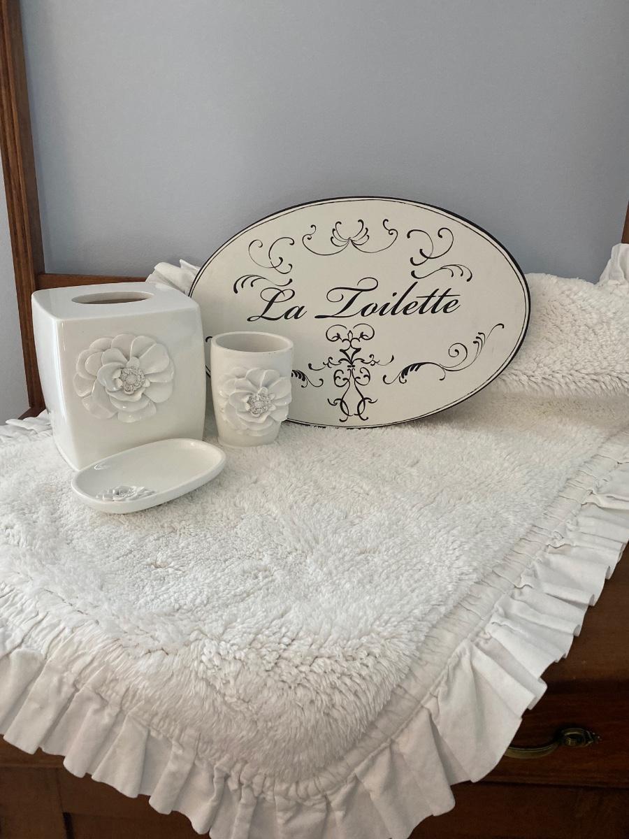 Five piece white powder room decor. Sign, bath mat, tissue box cover, soap dish and sink cup. Please see all pictures as they are the best representation of the items. The pictures show condition, measurements if taken, and what is included in the lot. Due to the large amount that we photograph and the time frame, we are not always able to take measurements. All items unless noted, are pre-owned and have been used. If you purchased furniture, you must bring help. We do not allow one person to carry large furniture out on their own. Bring help, tools and a truck for the safety of our client’s homes, and your personal safety. Any damages that result to the property including walls, and floors due to moving of the furniture will be charged to the buyer. Company policy. Thank you.