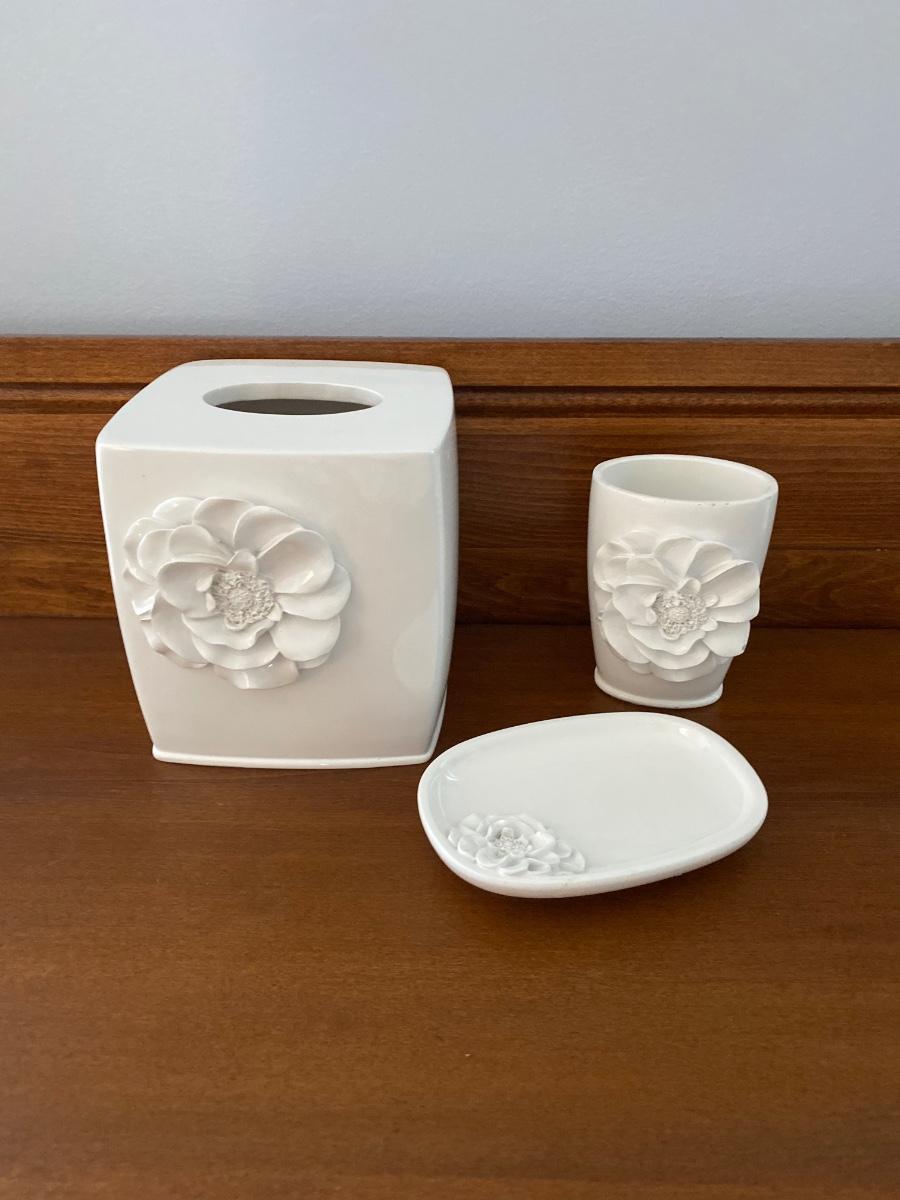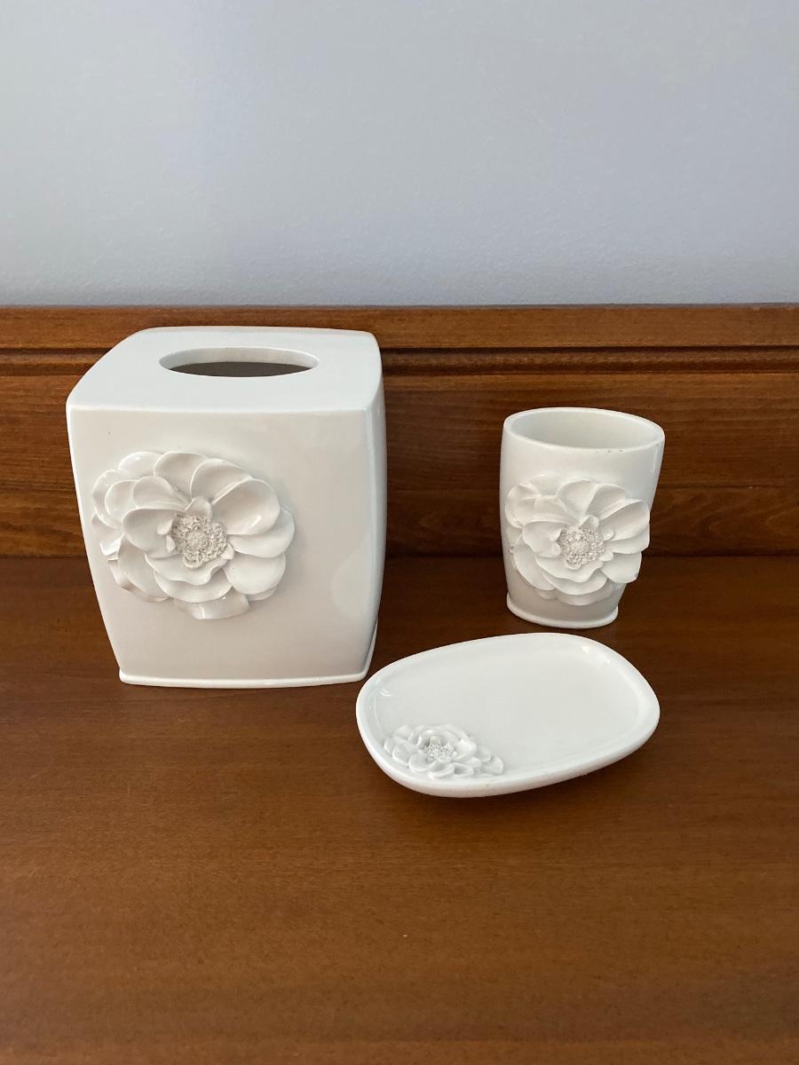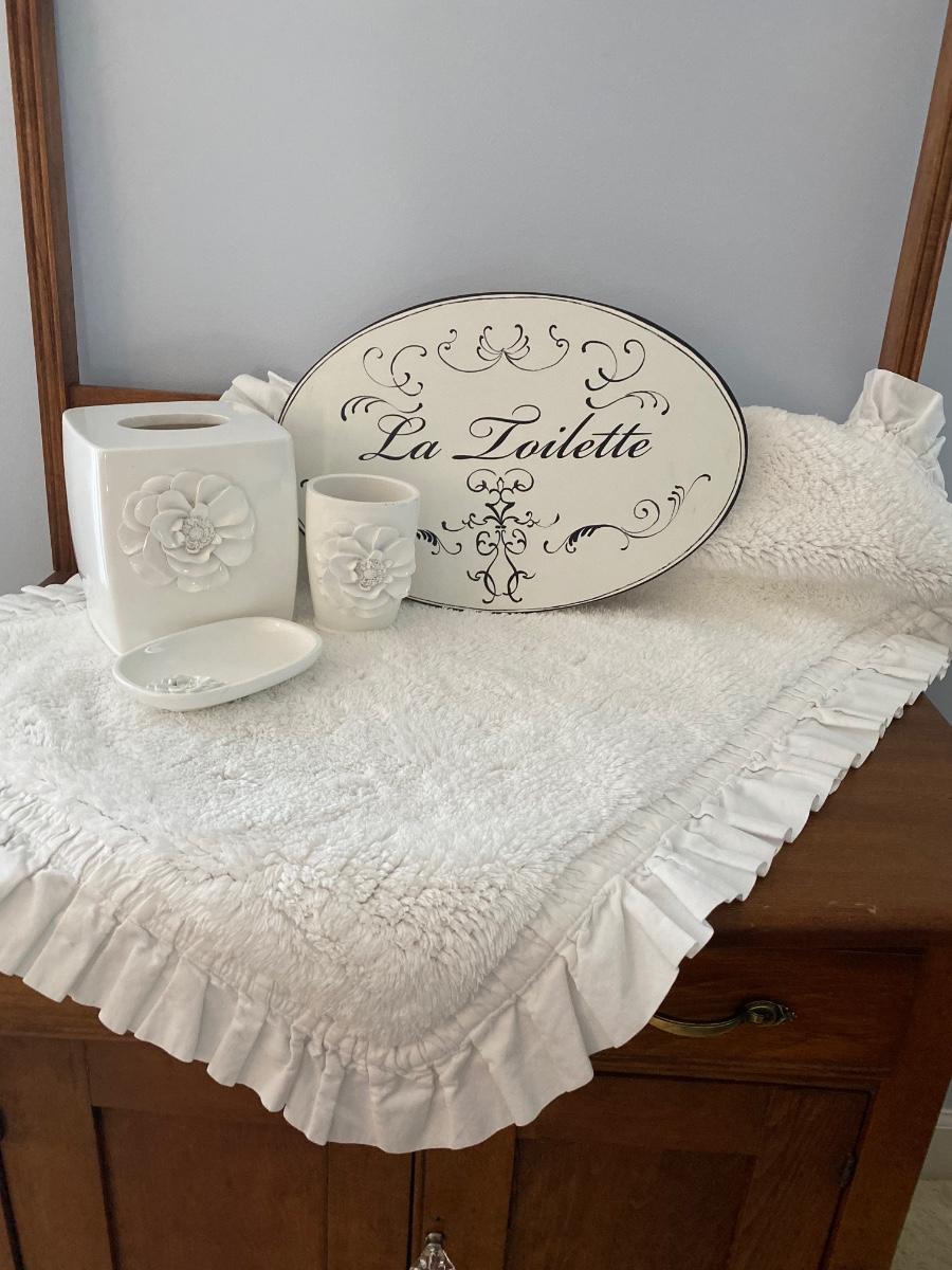 Five piece white powder room decor. Sign, bath mat, tissue box cover, soap dish and sink cup. Please see all pictures as they are the best representation of the items. The pictures show condition, measurements if taken, and what is included in the lot. Due to the large amount that we photograph and the time frame, we are not always able to take measurements. All items unless noted, are pre-owned and have been used. If you purchased furniture, you must bring help. We do not allow one person to carry large furniture out on their own. Bring help, tools and a truck for the safety of our client’s homes, and your personal safety. Any damages that result to the property including walls, and floors due to moving of the furniture will be charged to the buyer. Company policy. Thank you.