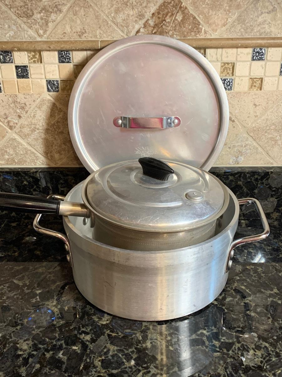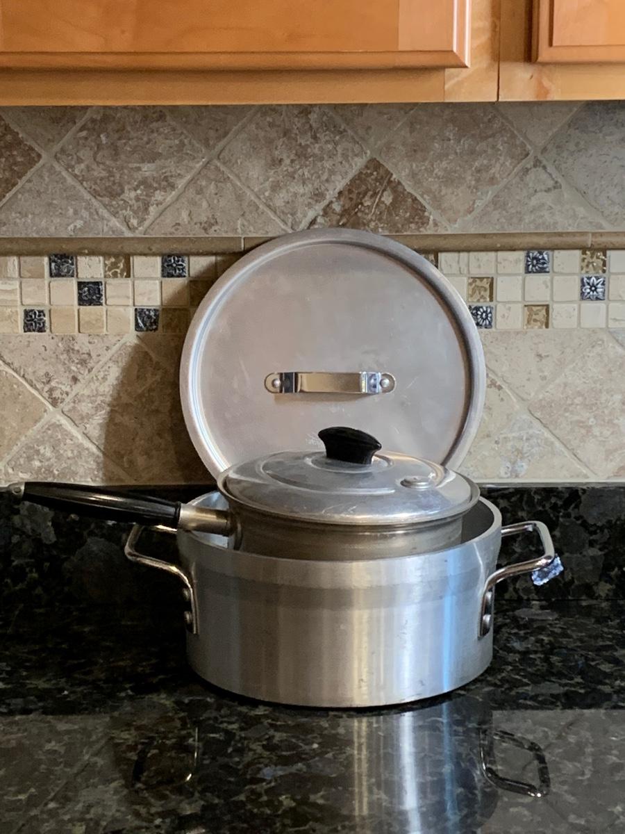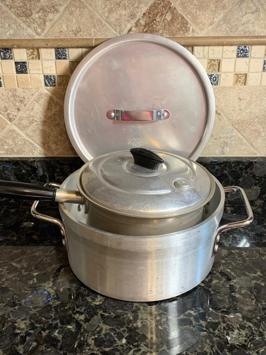 Vintage aluminum cookware, both with lids and ready for cooking.