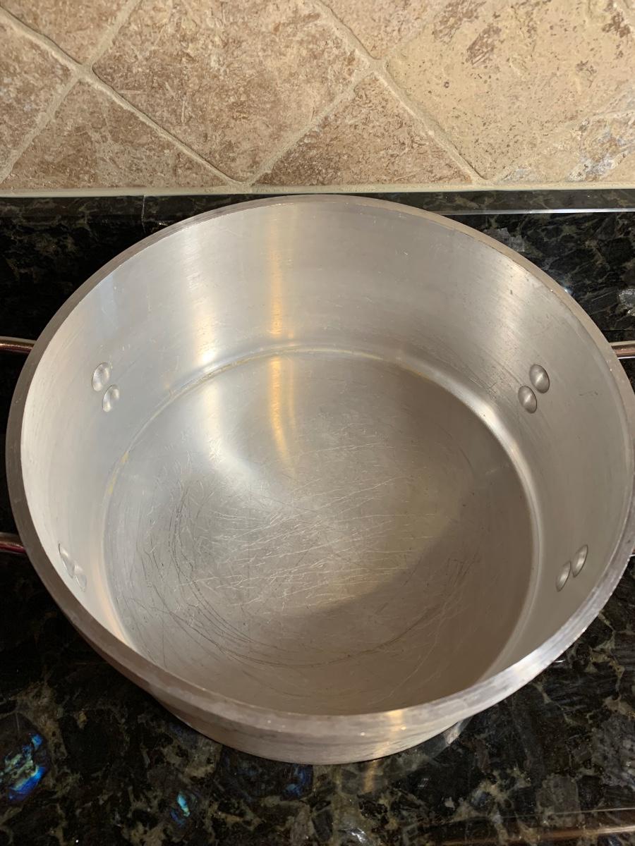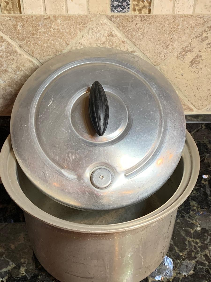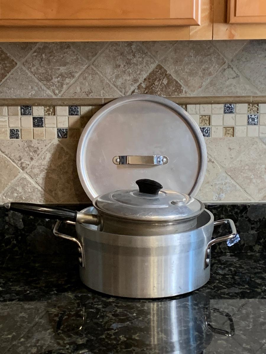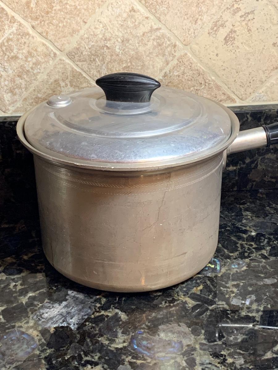 Vintage aluminum cookware, both with lids and ready for cooking.