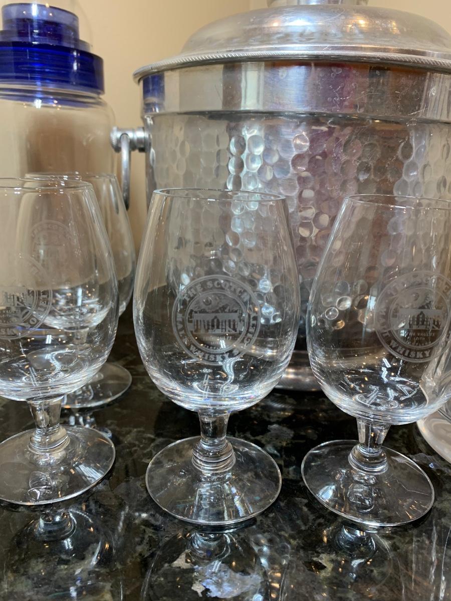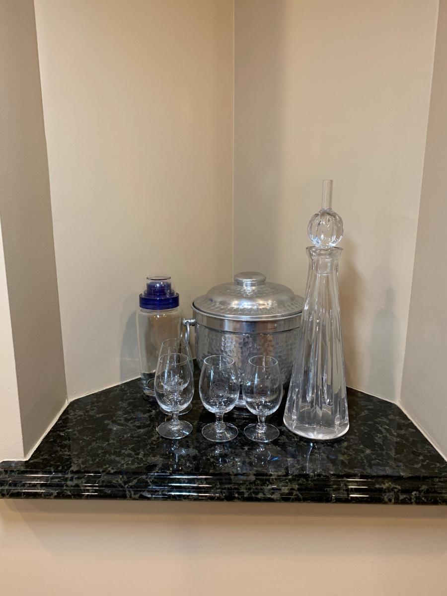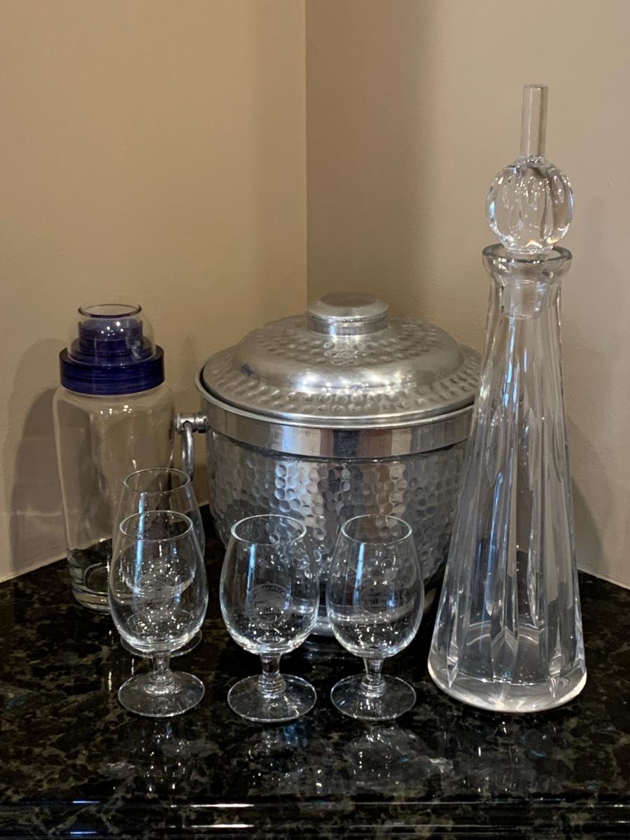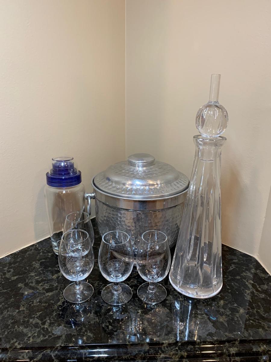 Barware collection including a Made in Italy 501, Hammered Aluminum Ice Bucket, glass mixer, beautiful crystal decanter and more.