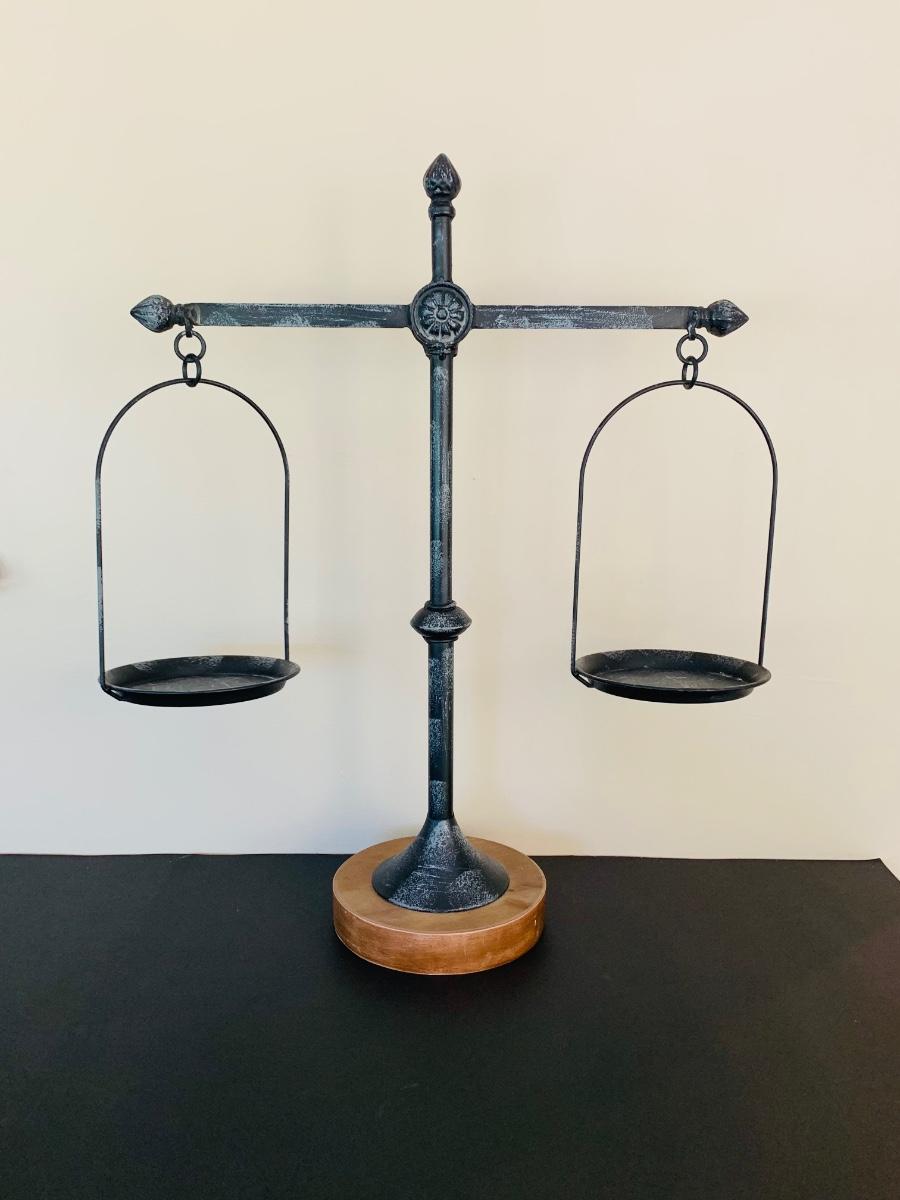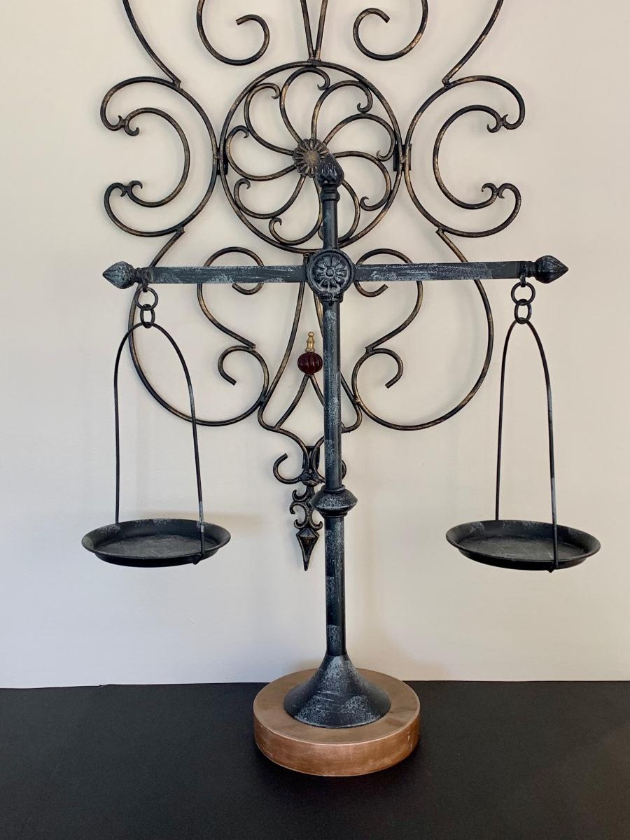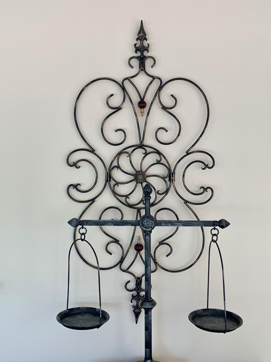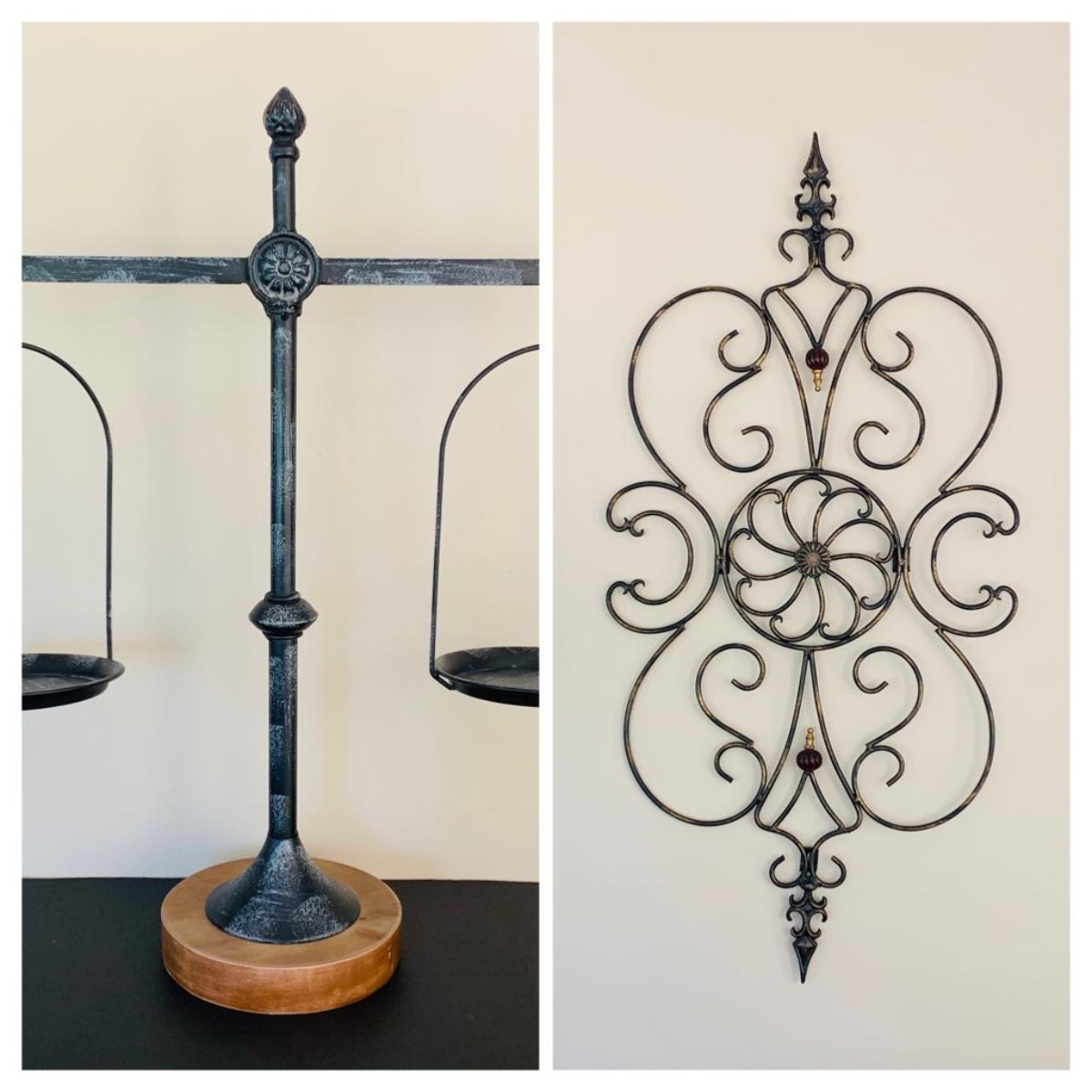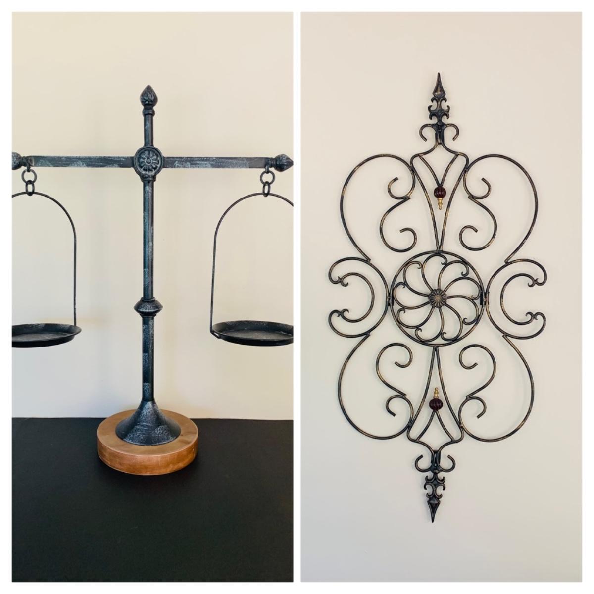 LOT 48R: Scroll Metal Wall Decor & Large Metal Justice Scale Decor