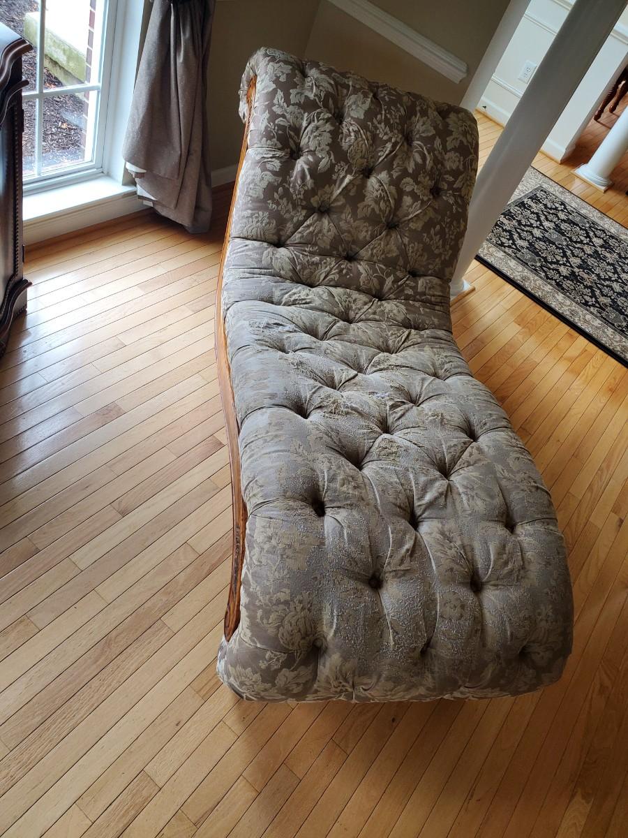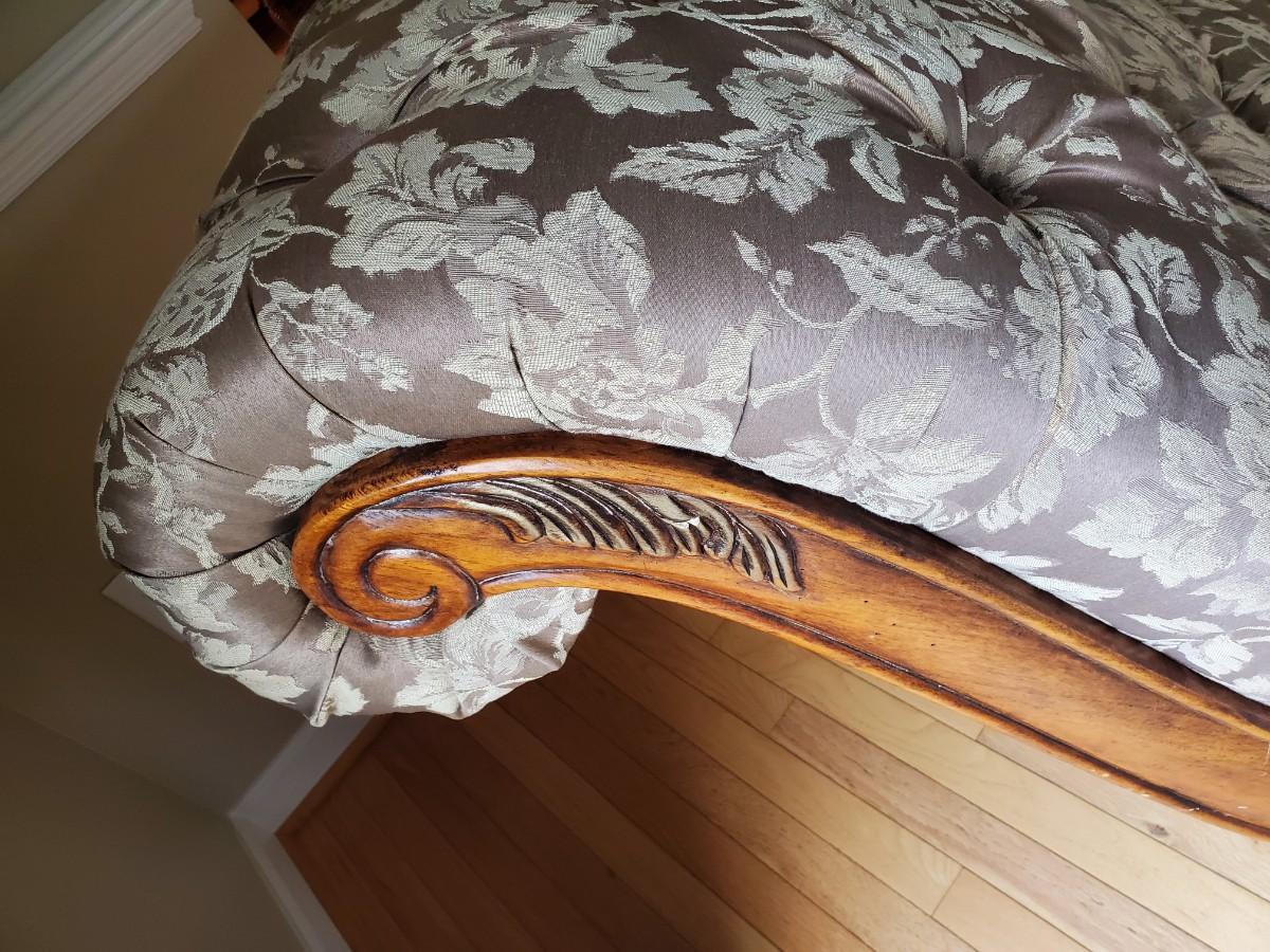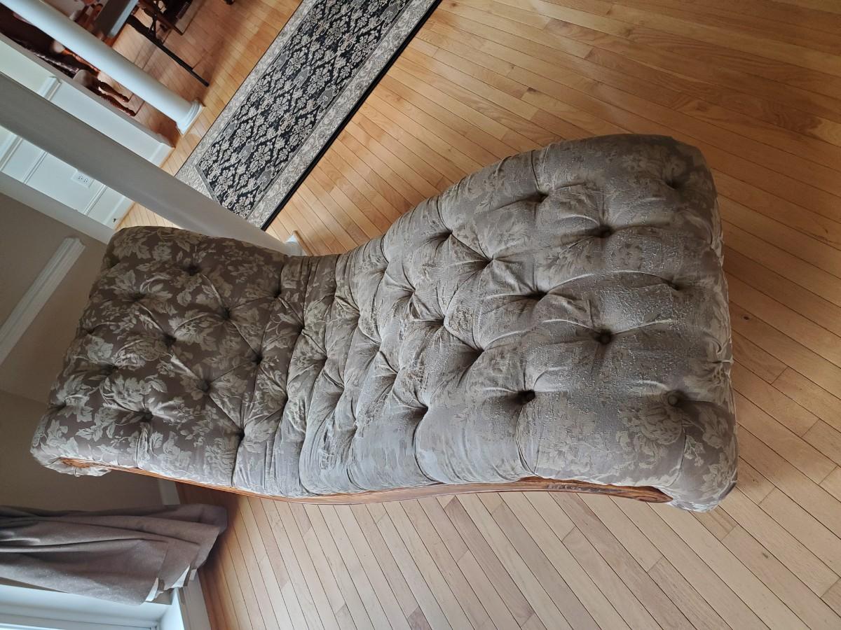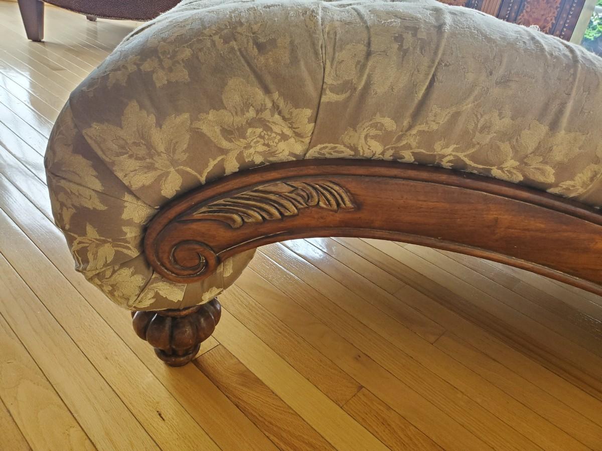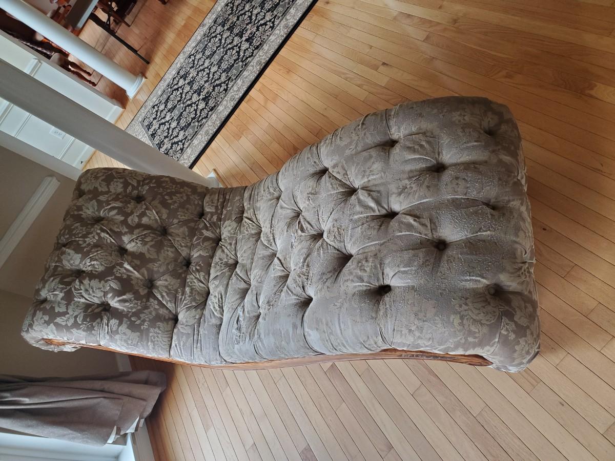 LOT 51G: Chaise Lounge w/Wood Accents and Button Tufting, Needs Reupholstering