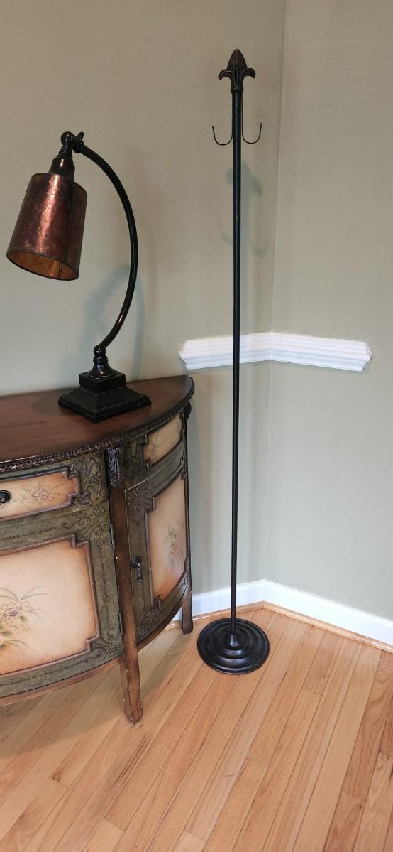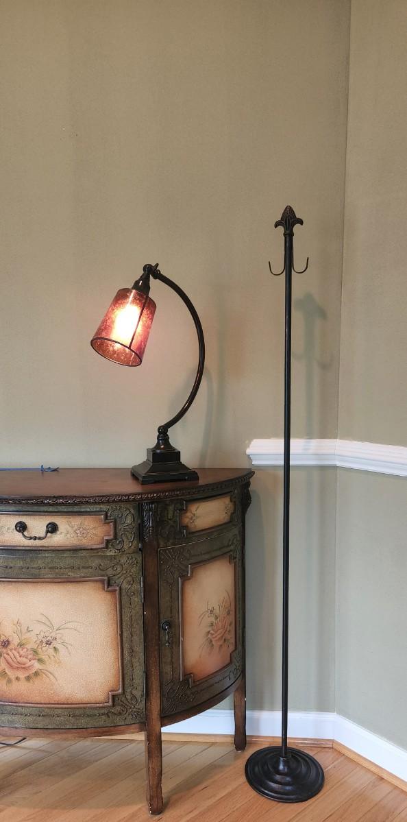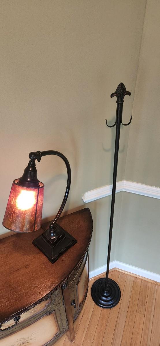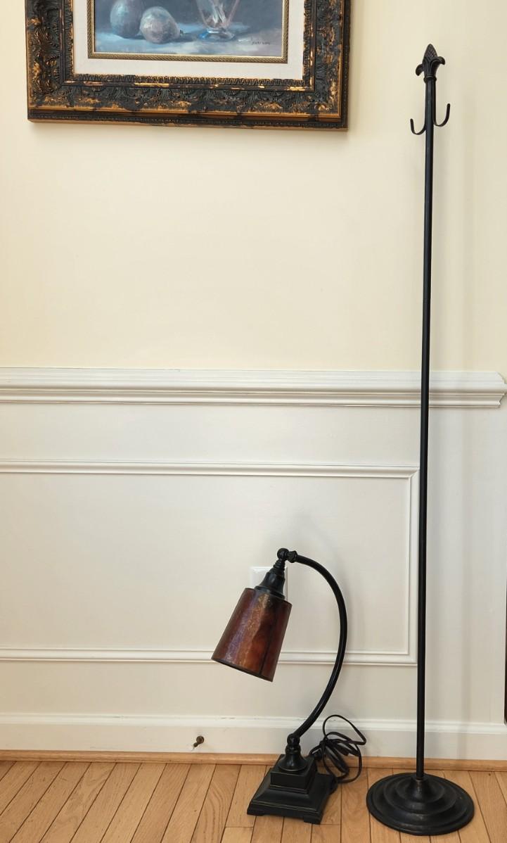 You are bidding on a lamp and a accessory hook. Both are in great condition and feature a rustic flair. The lamp fully spins and adjusts. The lamp is 21" tall and the hook is 60" tall. Please see all pictures as they are the best representation of the items. The pictures show condition, measurements if taken, and what is included in the lot. Due to the large amount that we photograph and the time frame, we are not always able to take measurements. All items unless noted, are pre-owned and have been used. If you purchased furniture, you must bring help. We do not allow one person to carry large furniture out on their own. Bring help, tools and a truck for the safety of our client’s homes, and your personal safety. Any damages that result to the property including walls, and floors due to moving of the furniture will be charged to the buyer. Company policy. Thank you.