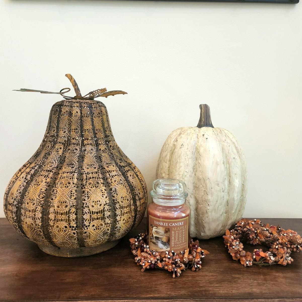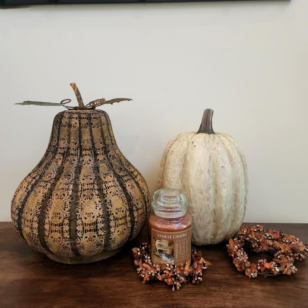 LOT 95RP: Collection of Six Fall Holiday Decor Items: Yankee Candle, Metal Gourd & More