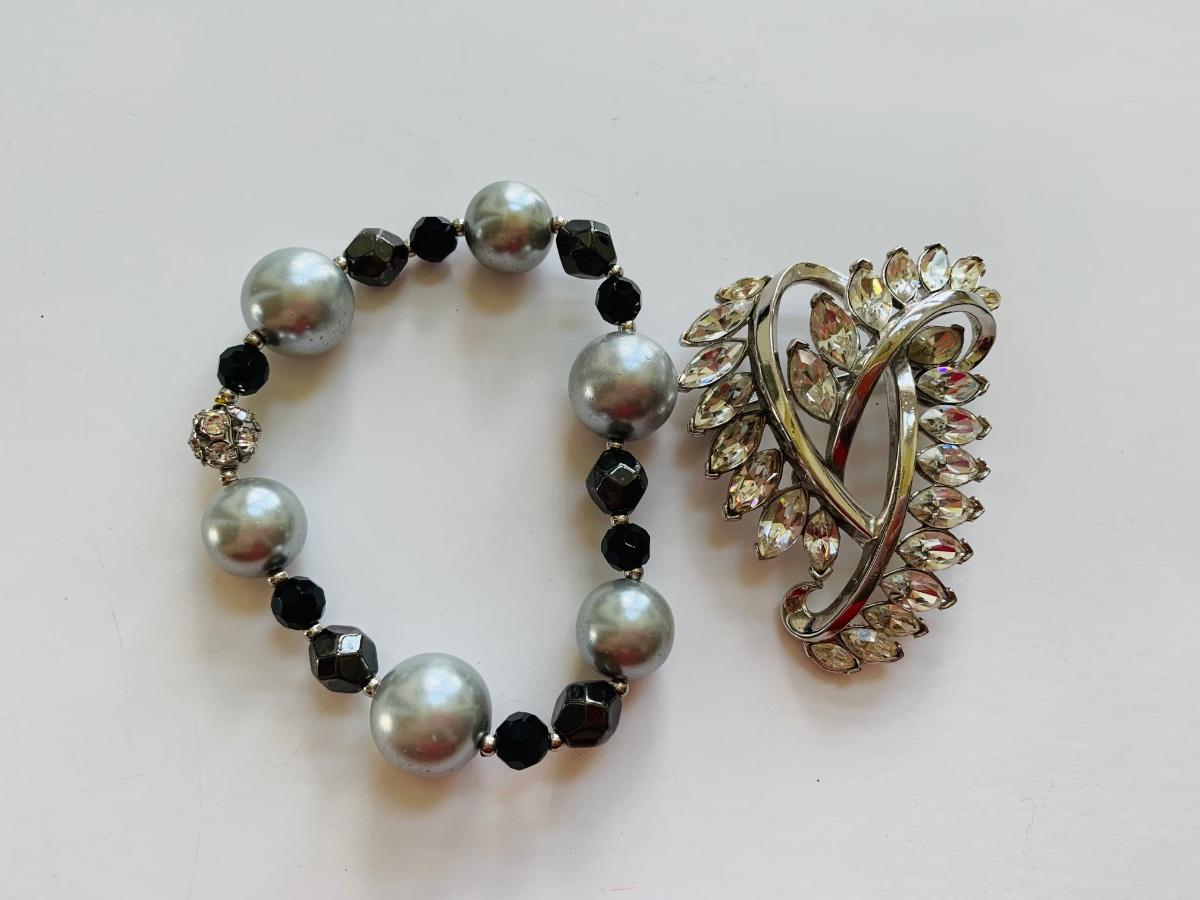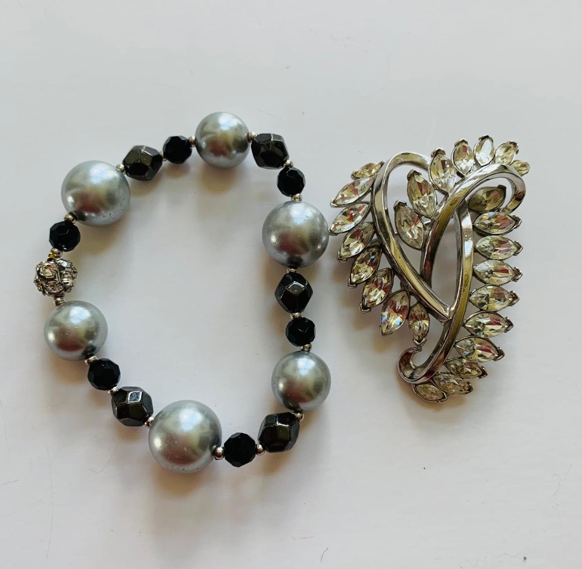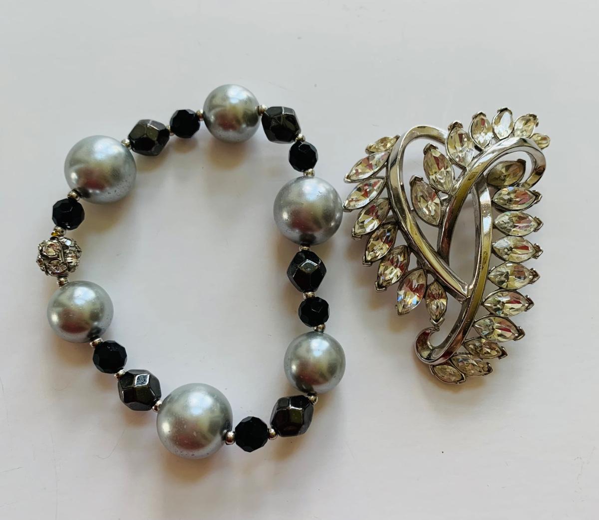 LOT 112R: Trifari Brooch & Beaded & Faux Pearl  Stretch Bracelet