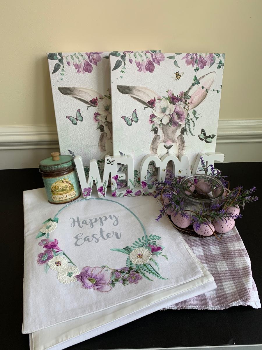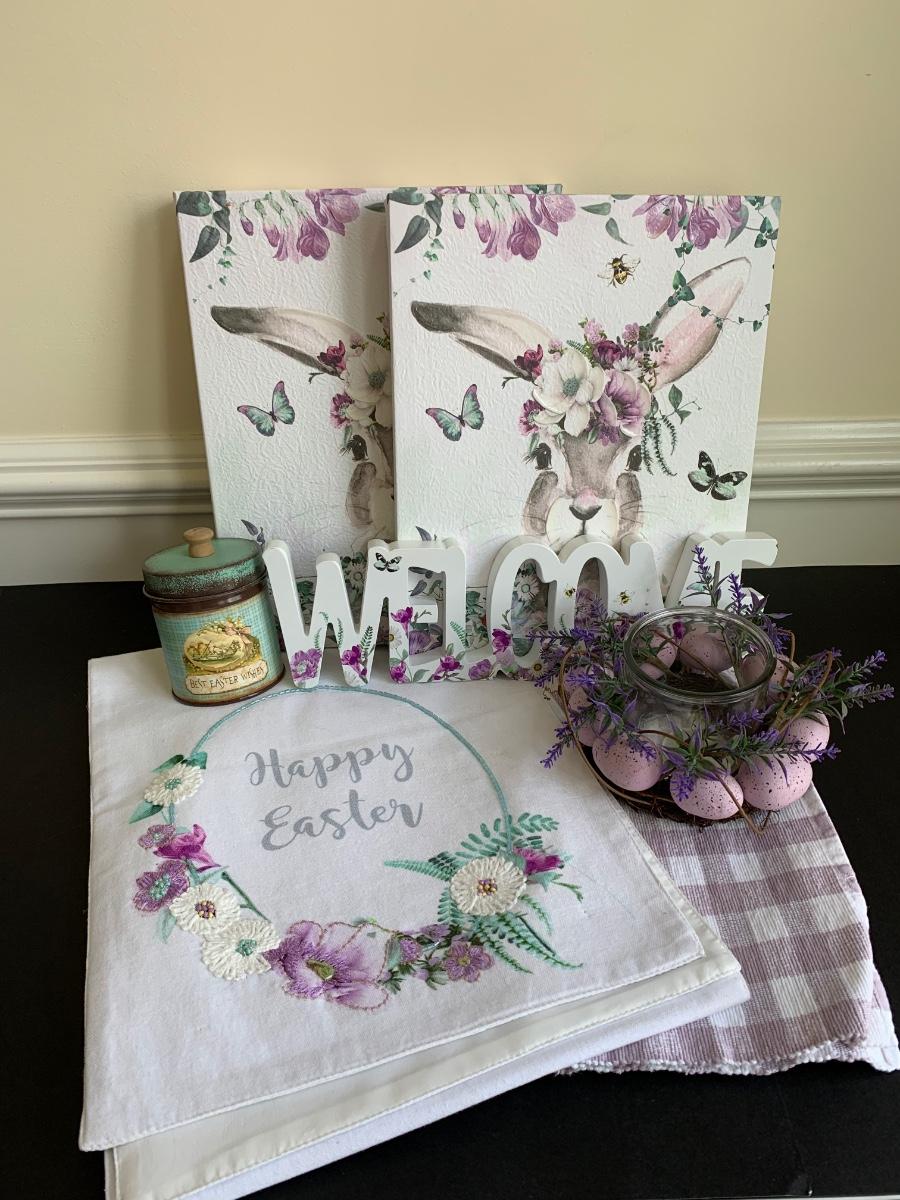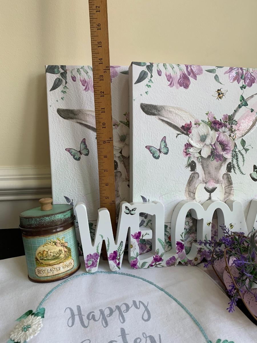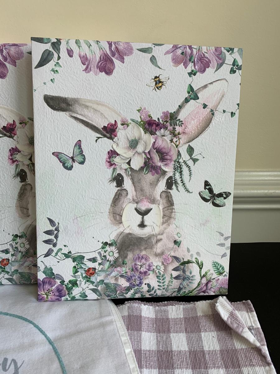 8 Spring placemats, 2 spring bunnies with flowers between their ears prints on canvas, floral candle rings w/eggs and more.