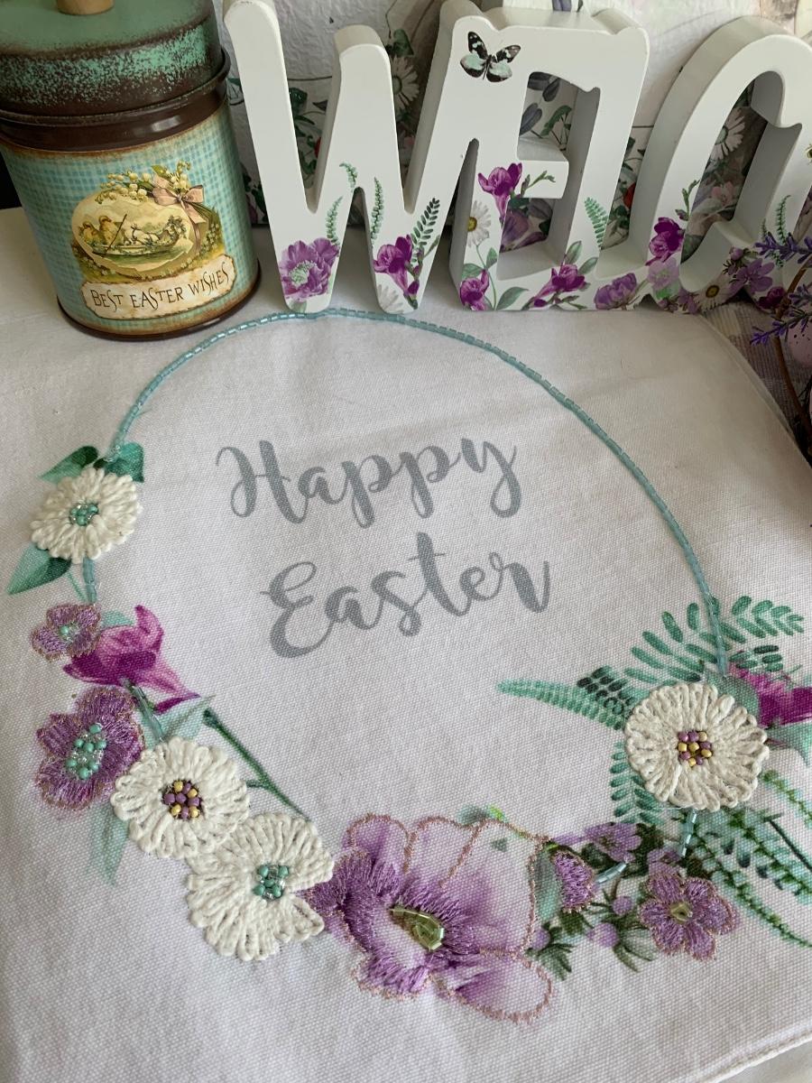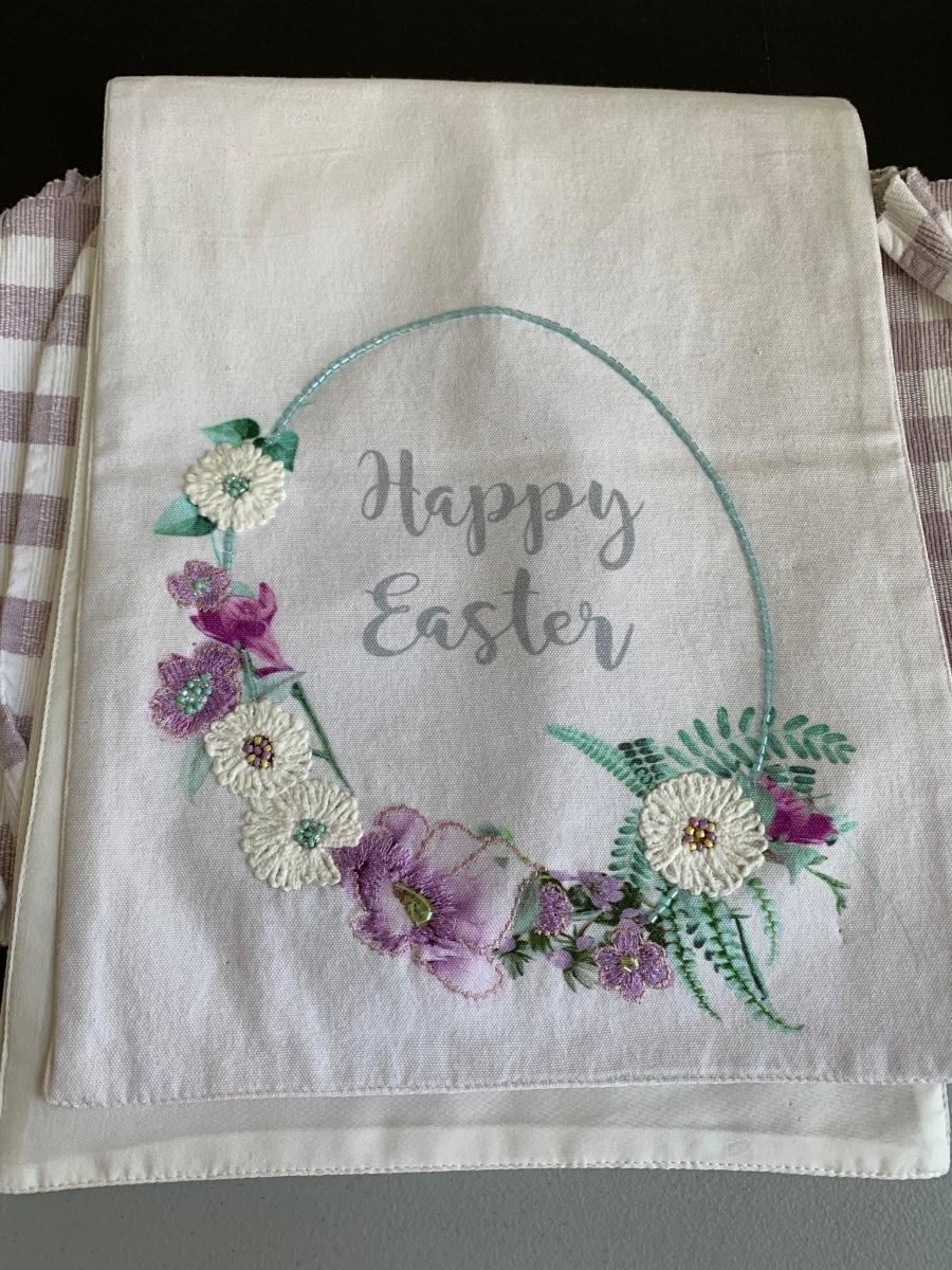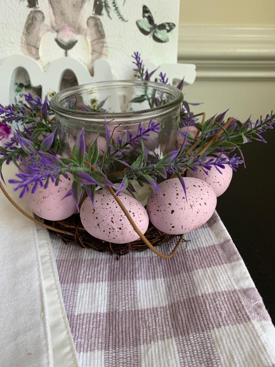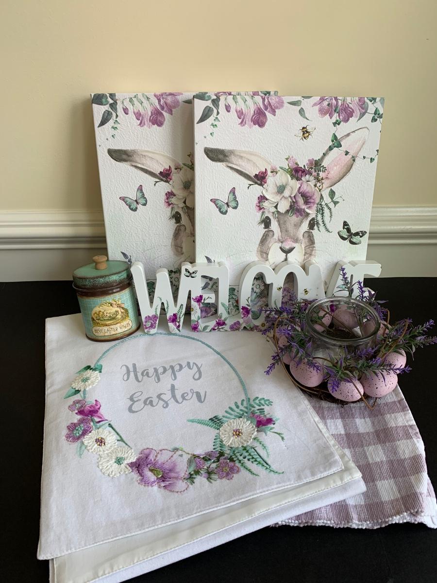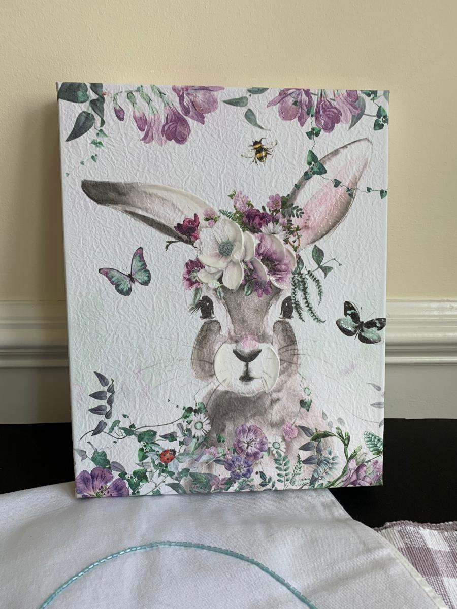 8 Spring placemats, 2 spring bunnies with flowers between their ears prints on canvas, floral candle rings w/eggs and more.