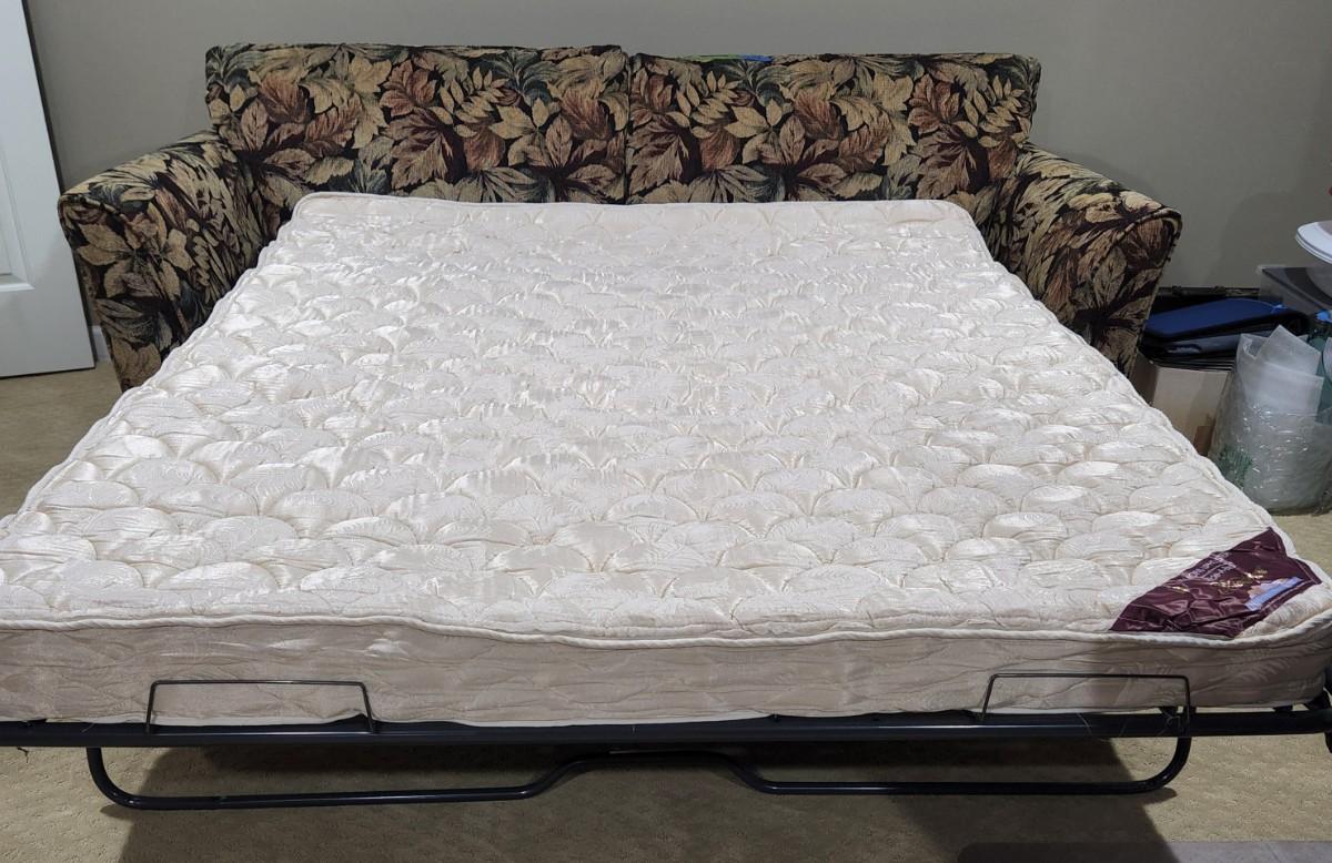 Sofa measures approx. 85"W x 35"D x 35"H. Ottoman measures approx. 37"W x 25"D x 19"H. This sofa has a great contemporary leaf design pattern and features an easy to pull out full-sized Simmons mattress. Great for guests and relatives for the holidays. This sofa does have normal wear. Please see all pictures as they are the best representation of the items. The pictures show condition, measurements if taken, and what is included in the lot. Due to the large amount that we photograph and the time frame, we are not always able to take measurements. All items unless noted, are pre-owned and have been used. If you purchased furniture, you must bring help. We do not allow one person to carry large furniture out on their own. Bring help, tools and a truck for the safety of our client’s homes, and your personal safety. Any damages that result to the property including walls, and floors due to moving of the furniture will be charged to the buyer. Company policy. Thank you.