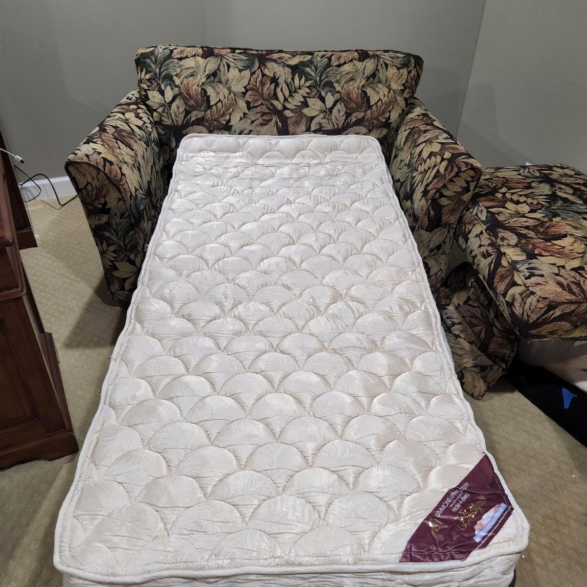 Measurements approx. 57"W x 35"D x 35"H. Super comfy twin sofa bed that pulls out with ease. Normal wear. Please see all pictures as they are the best representation of the items. The pictures show condition, measurements if taken, and what is included in the lot. Due to the large amount that we photograph and the time frame, we are not always able to take measurements. All items unless noted, are pre-owned and have been used. If you purchased furniture, you must bring help. We do not allow one person to carry large furniture out on their own. Bring help, tools and a truck for the safety of our client’s homes, and your personal safety. Any damages that result to the property including walls, and floors due to moving of the furniture will be charged to the buyer. Company policy. Thank you.