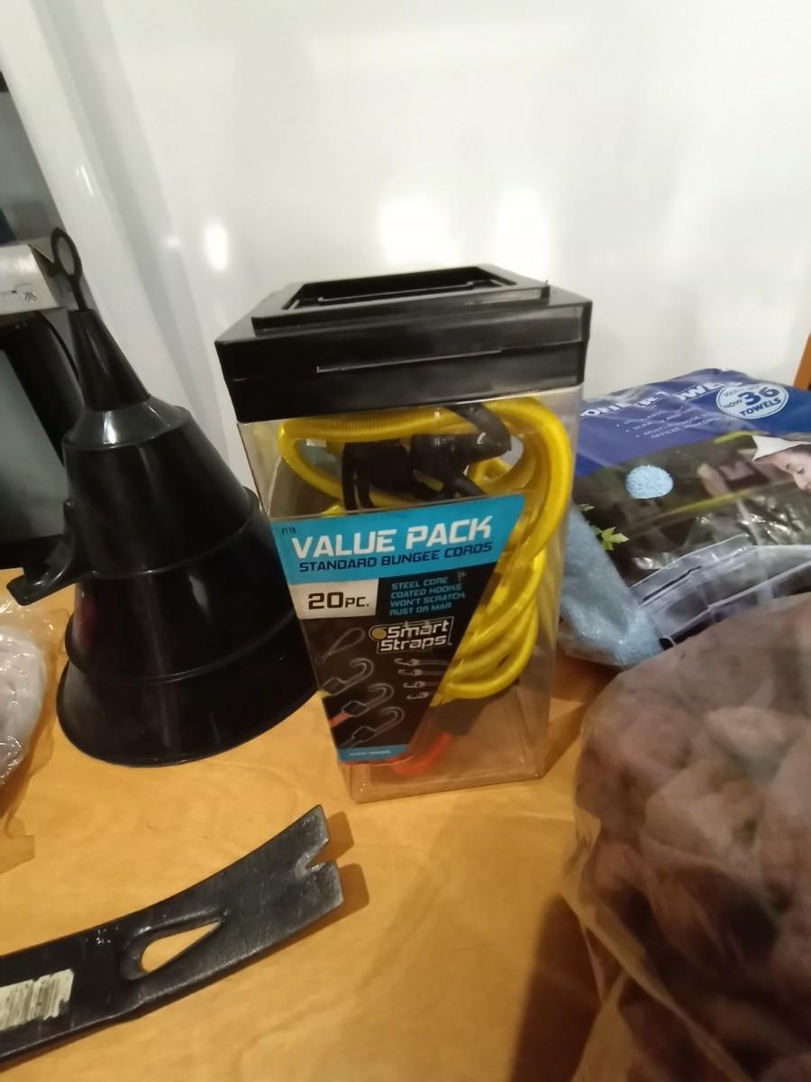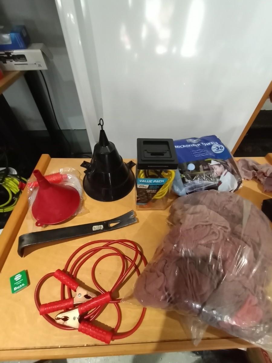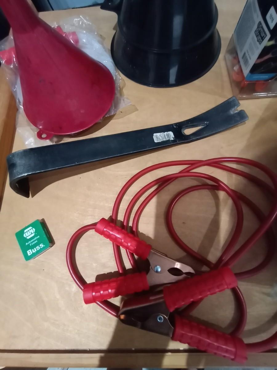JUMPER CABLES, FUNNELS, BAG OF MICROFIBER TOWELS, PRY BAR AND MORE