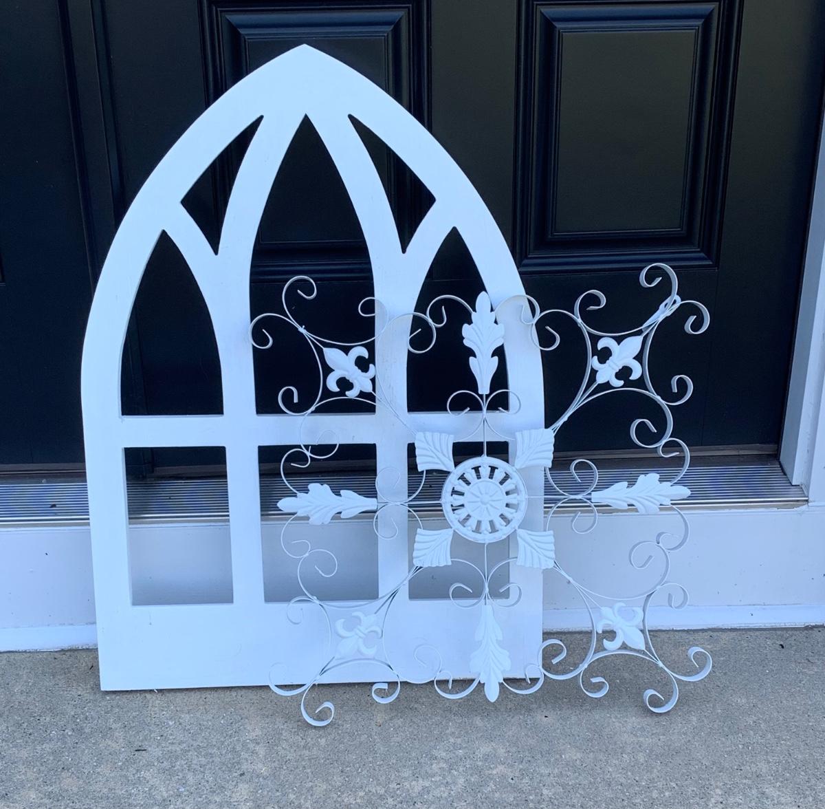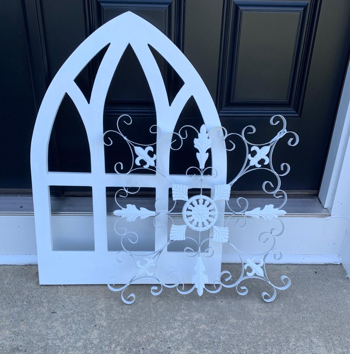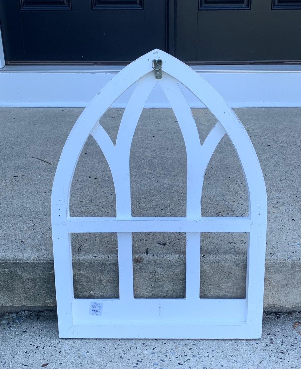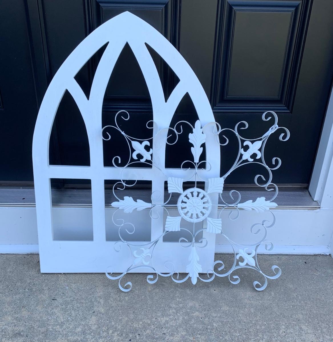 Lot 129-00R  Pier One Wood Arched Cathedral Window Decor & Metal  Medallion Wall Art