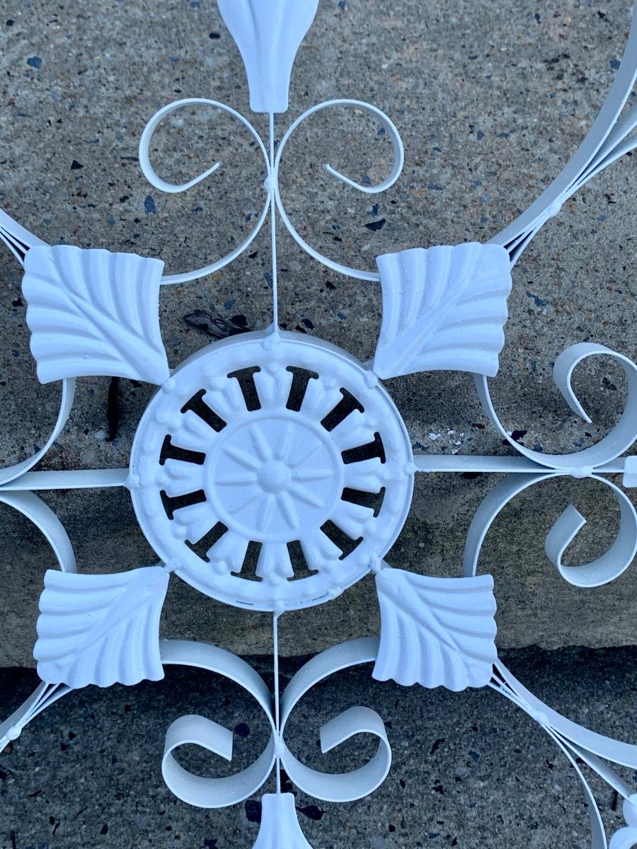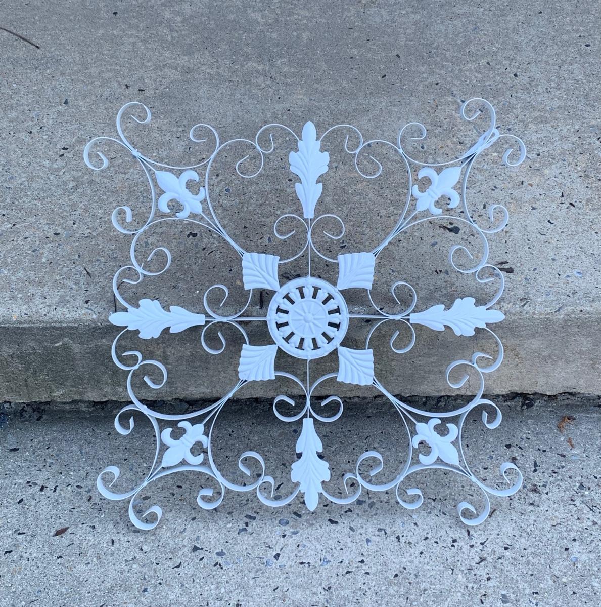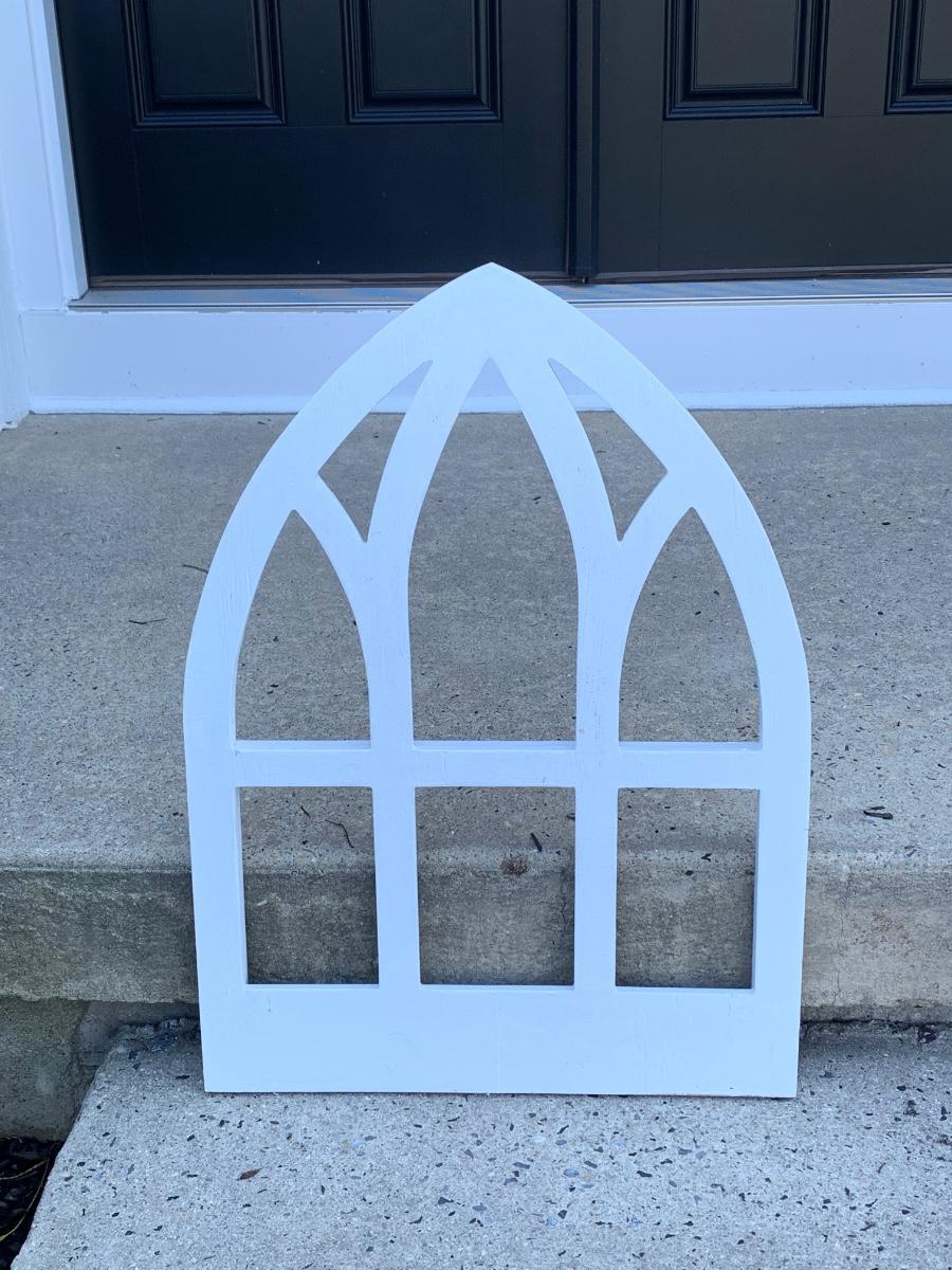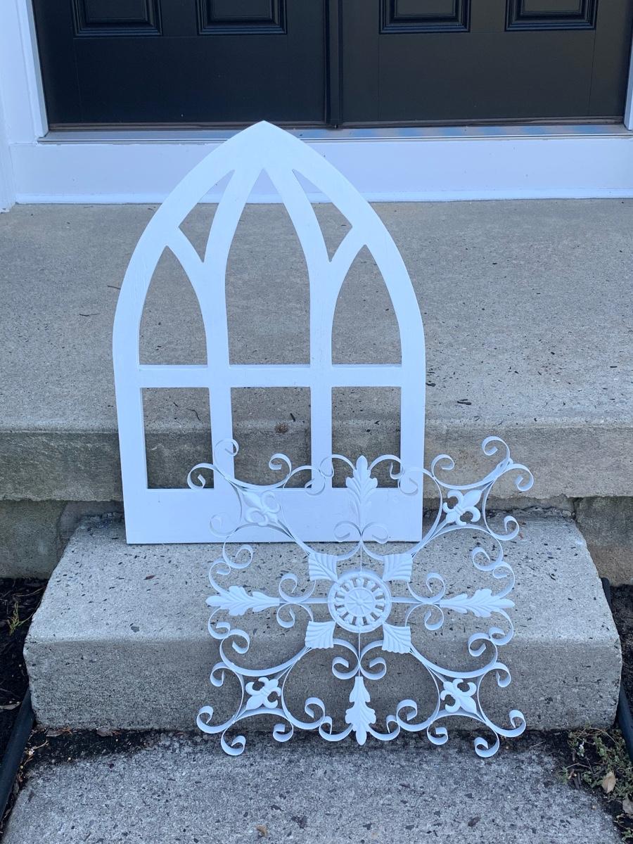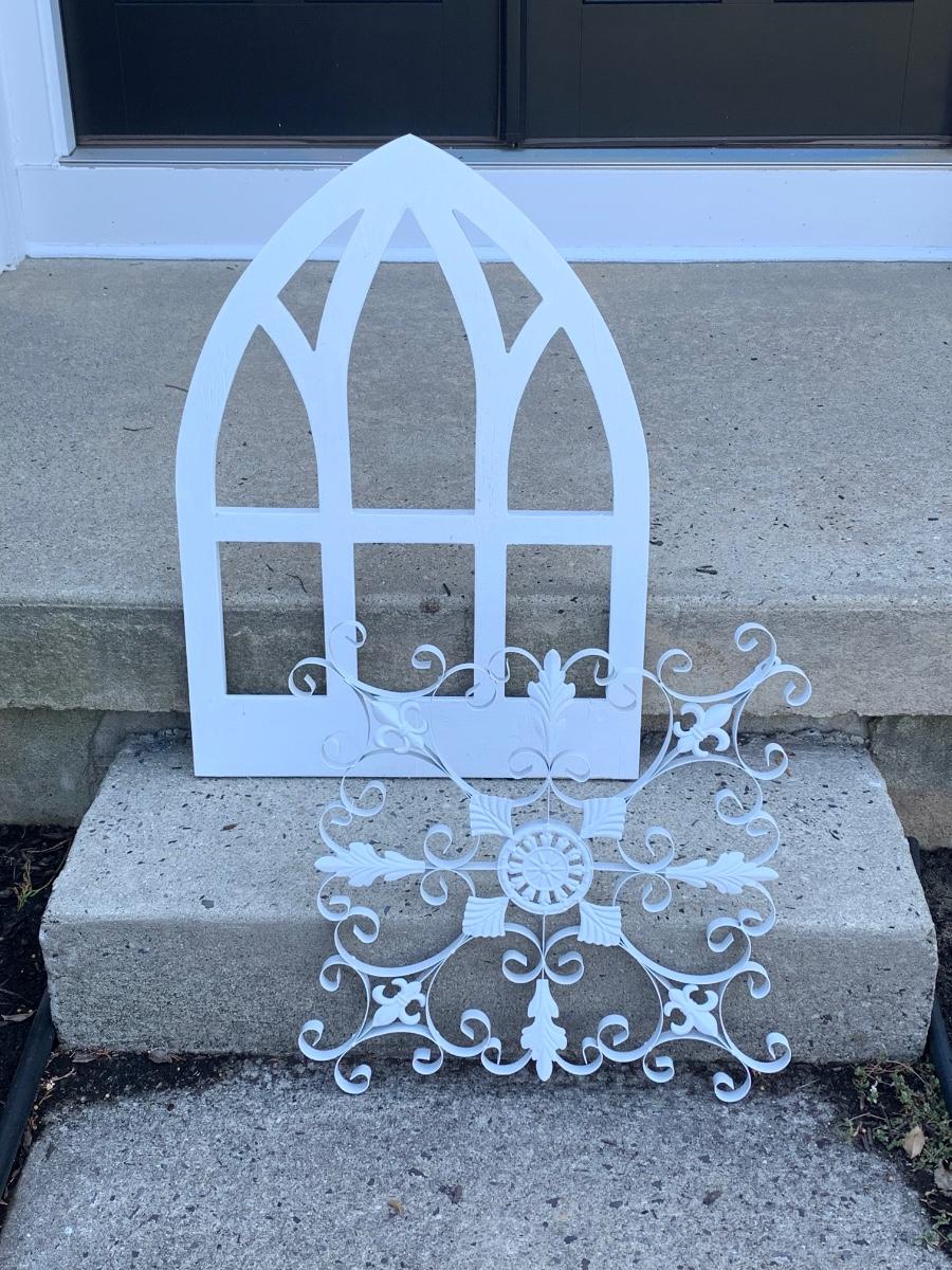 Lot 129-00R  Pier One Wood Arched Cathedral Window Decor & Metal  Medallion Wall Art