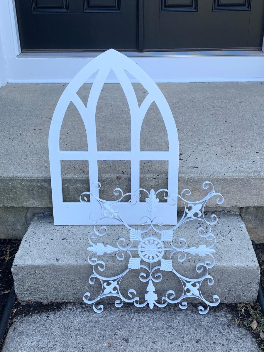 Lot 129-00R Pier One Wood Arched Cathedral Window Decor & Metal Medallion Wall Art
