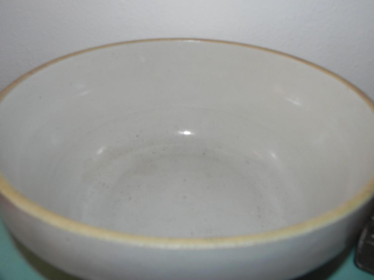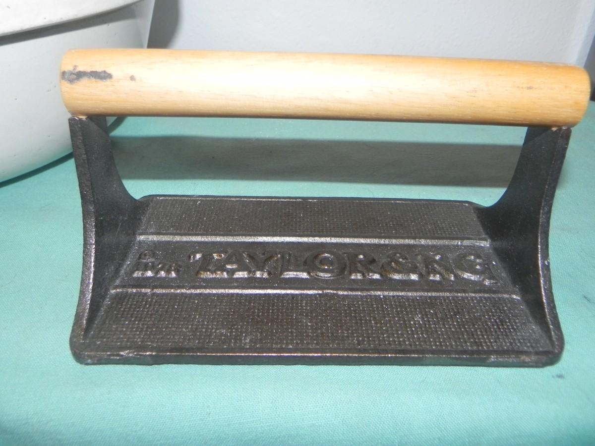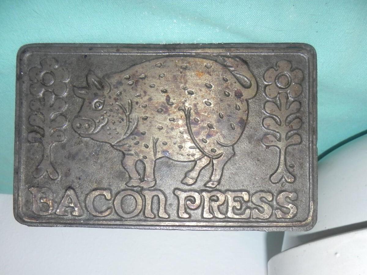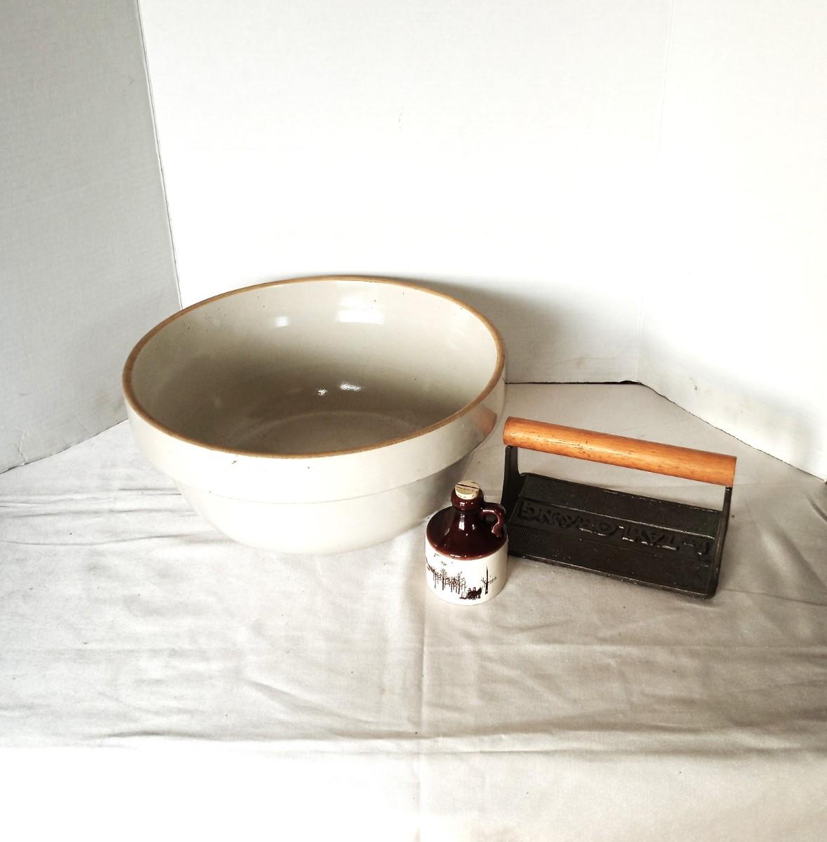 LARGE CLAY BOWL-CLAY JUG AND CASTIRON BACON PRESS