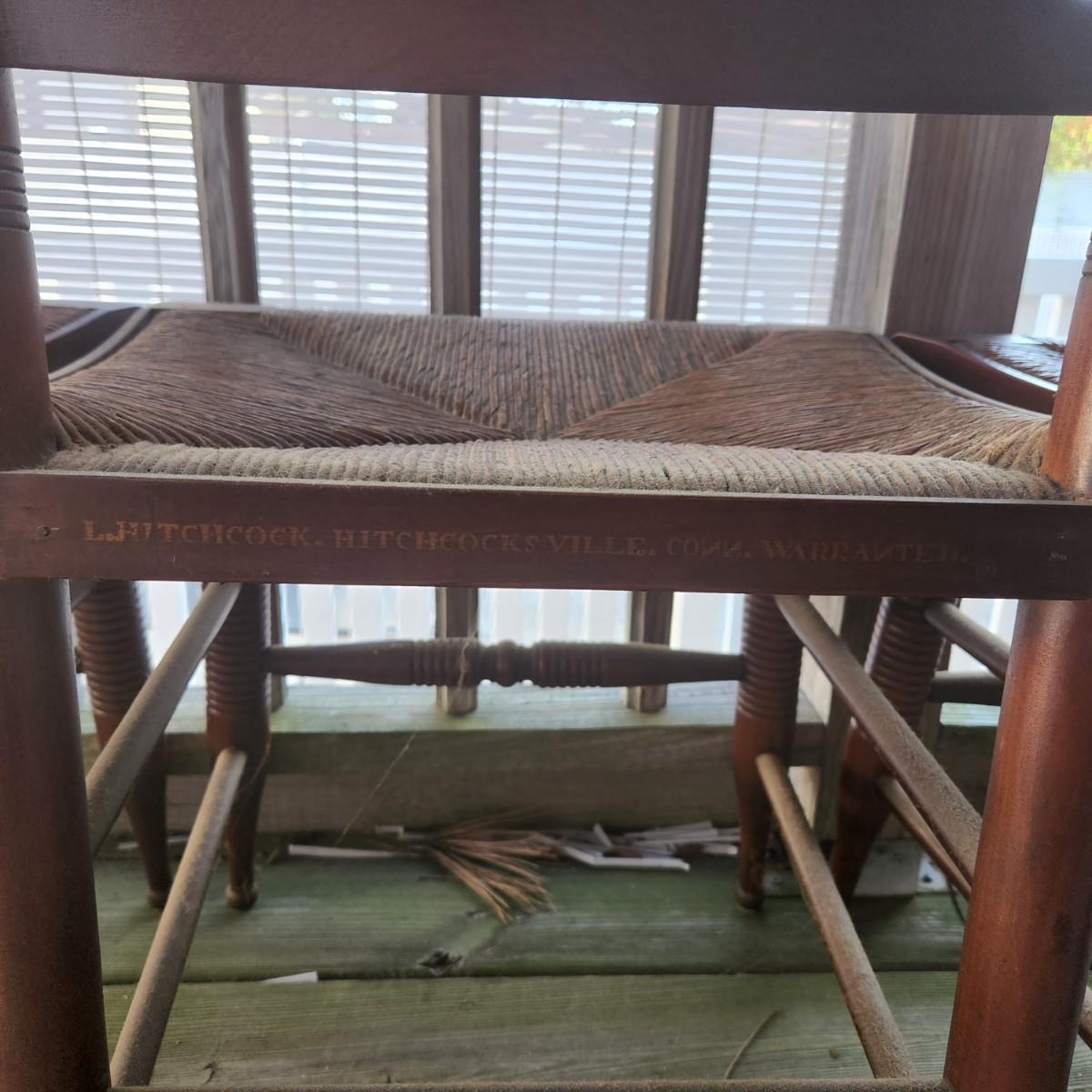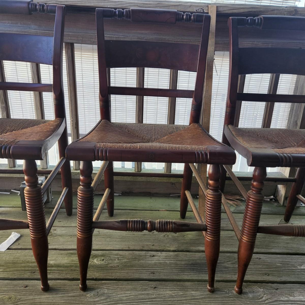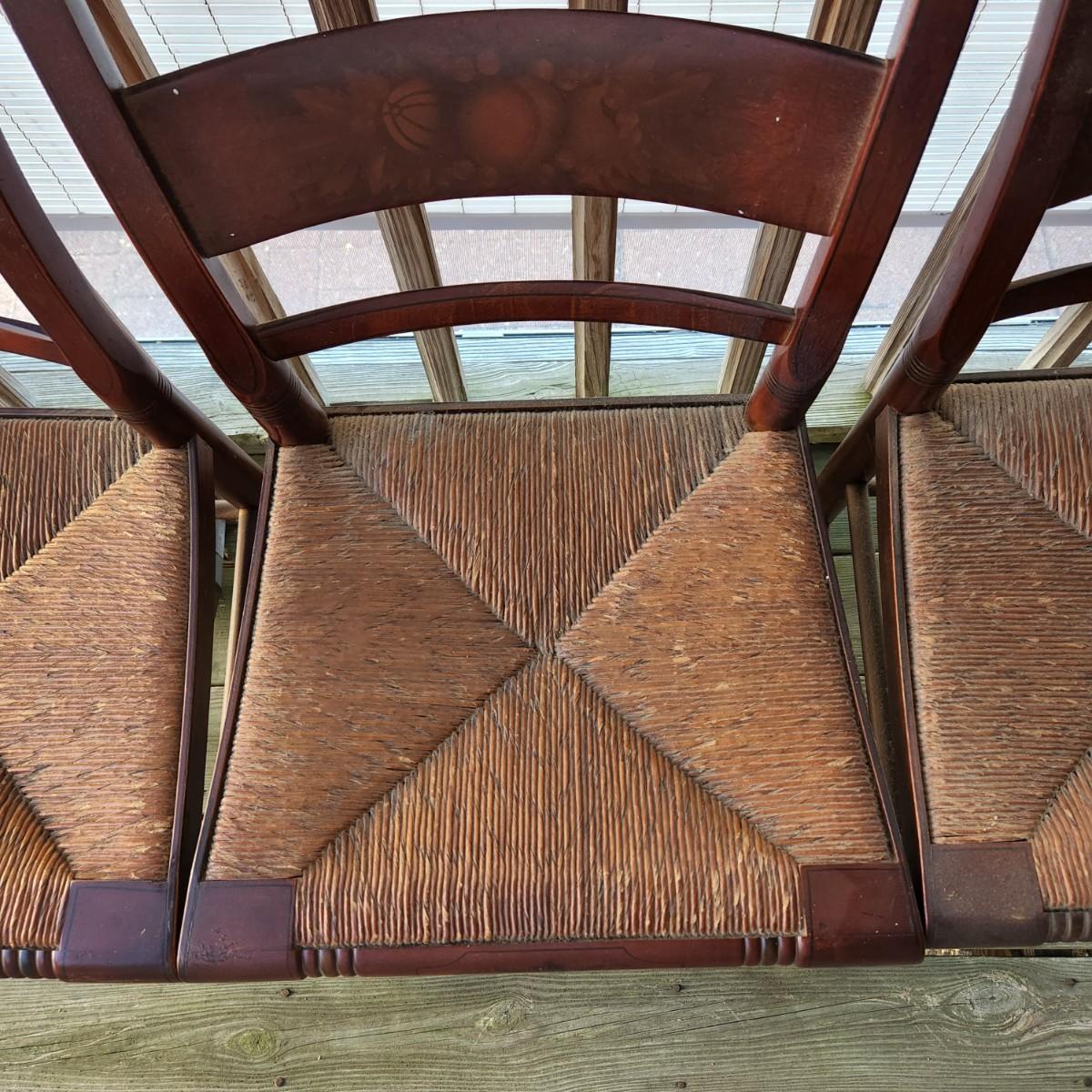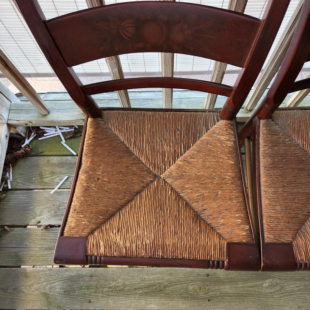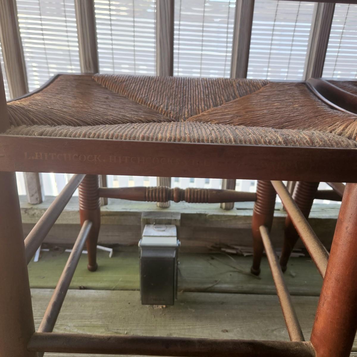 This is a beautiful set of Hitchcock chairs. They do show age however they are in really good overall condition. Some of the painted stenciling that they're known for has faded over time but they are still in great condition and very sturdy. They are believed to be solid maple wood.