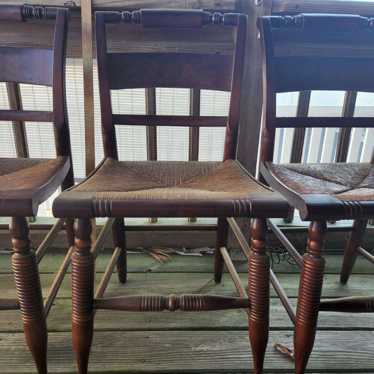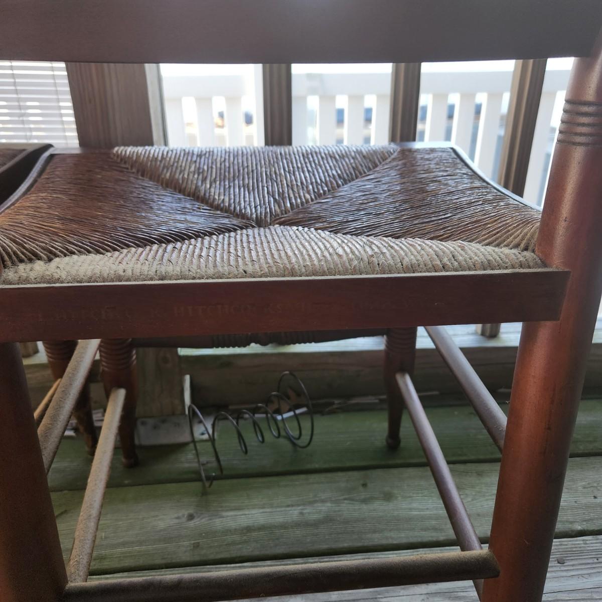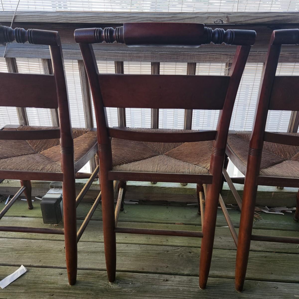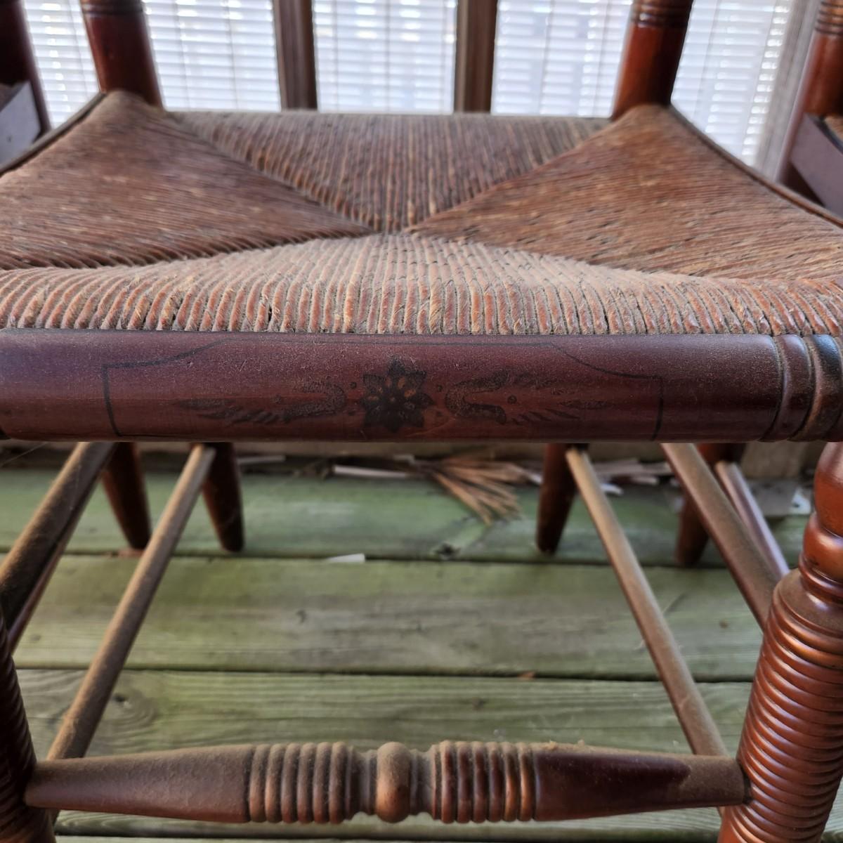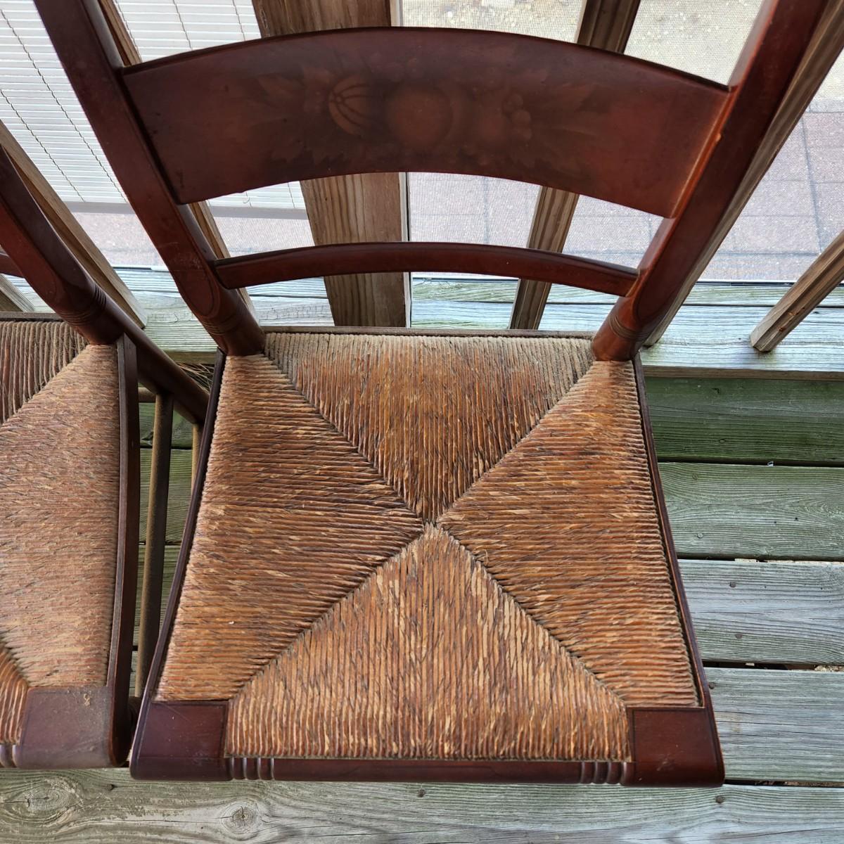 This is a beautiful set of Hitchcock chairs. They do show age however they are in really good overall condition. Some of the painted stenciling that they're known for has faded over time but they are still in great condition and very sturdy. They are believed to be solid maple wood.