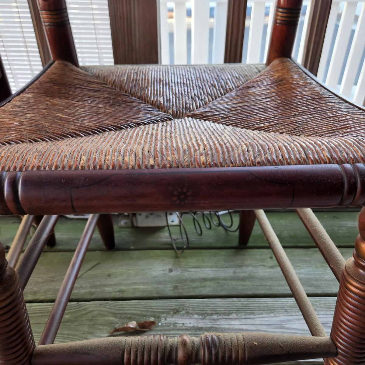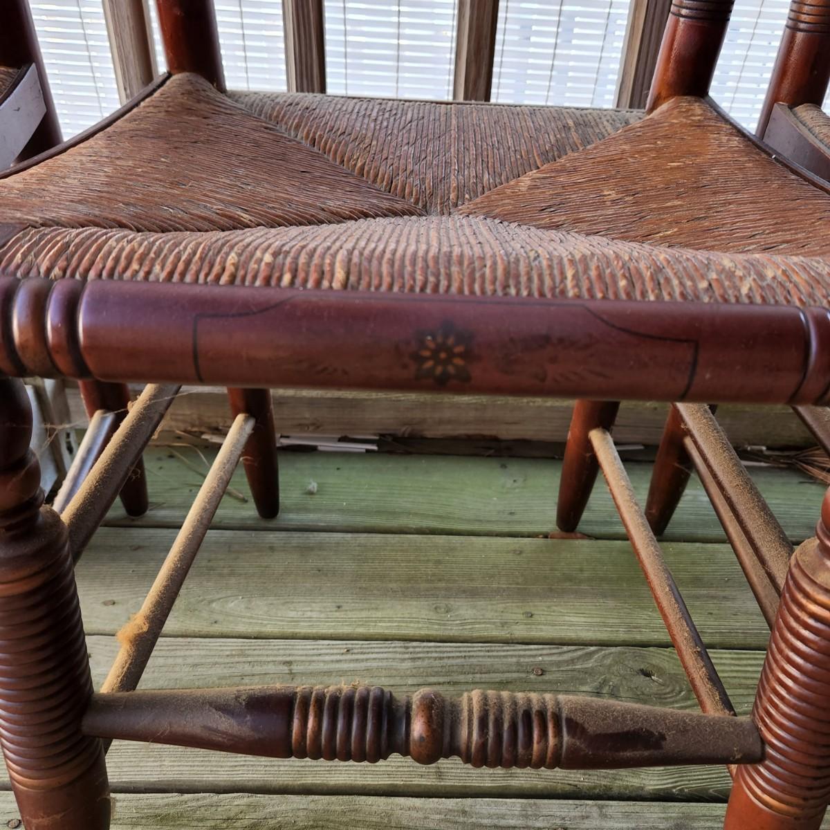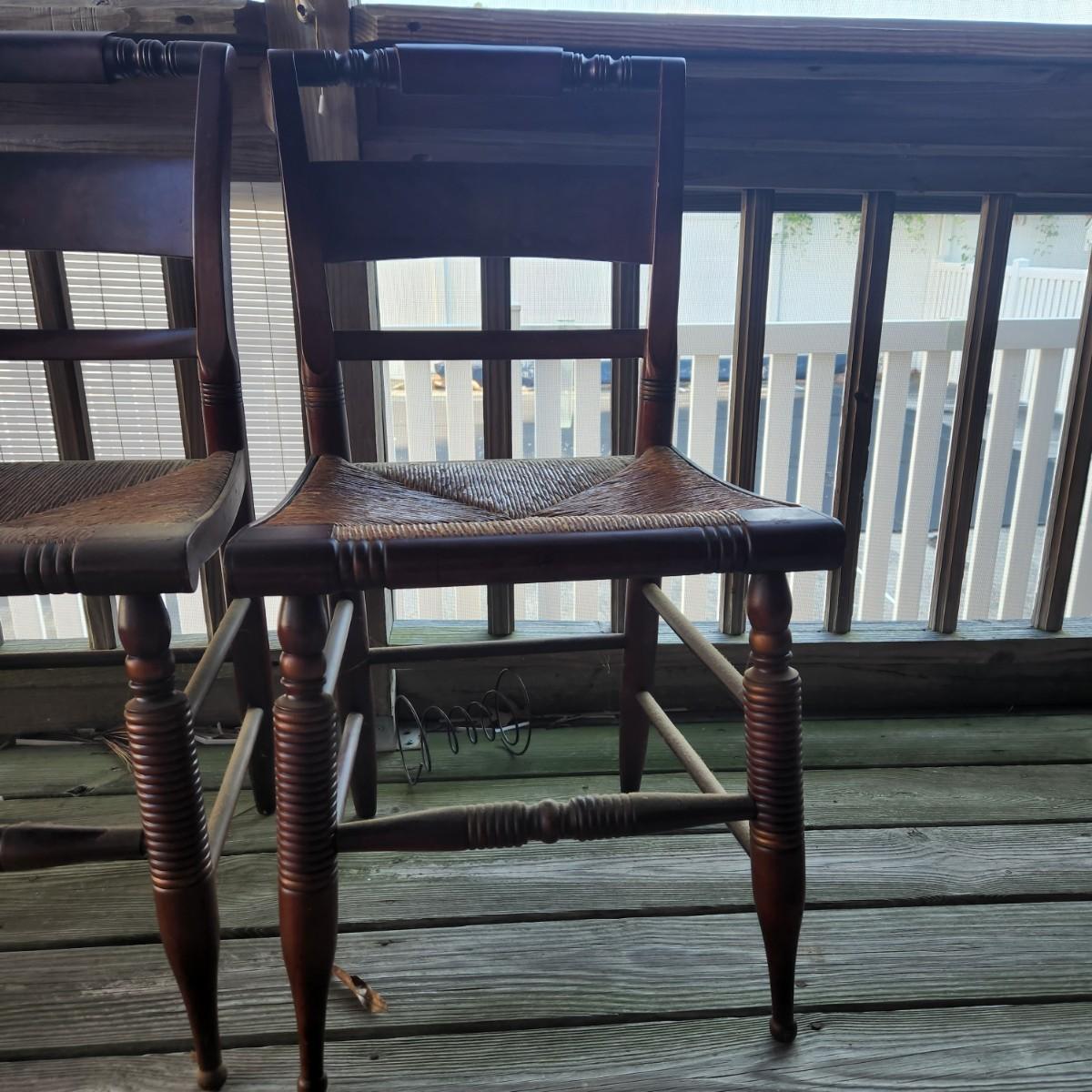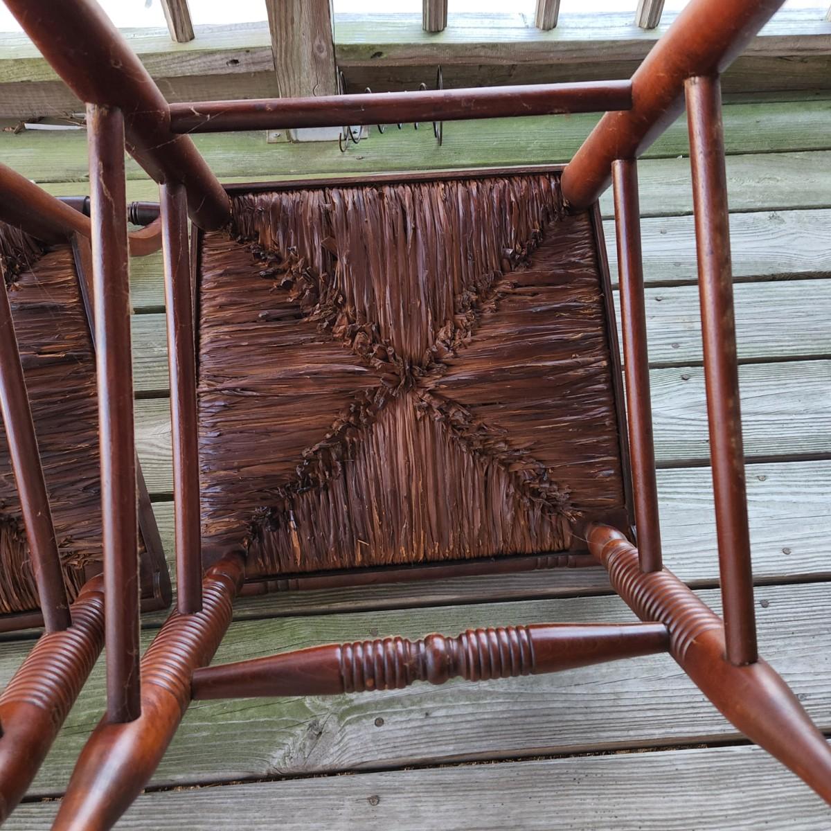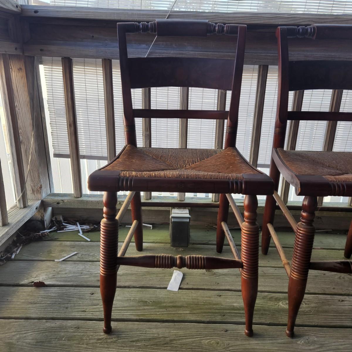 This is a beautiful set of Hitchcock chairs. They do show age however they are in really good overall condition. Some of the painted stenciling that they're known for has faded over time but they are still in great condition and very sturdy. They are believed to be solid maple wood.