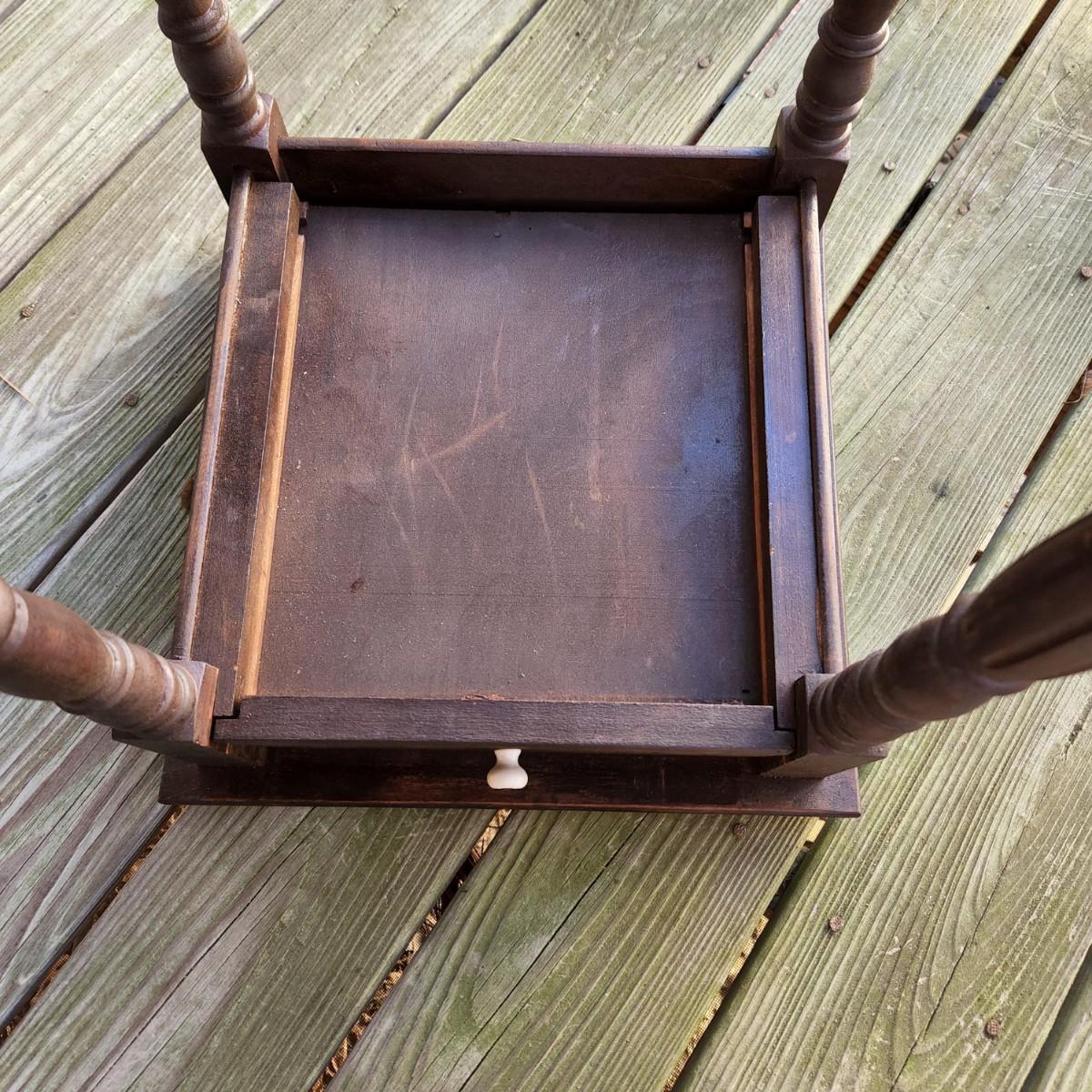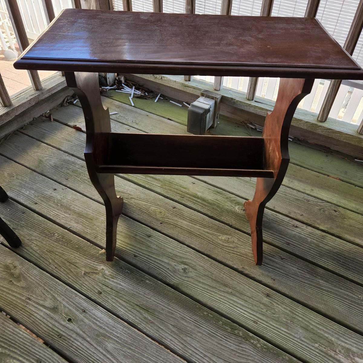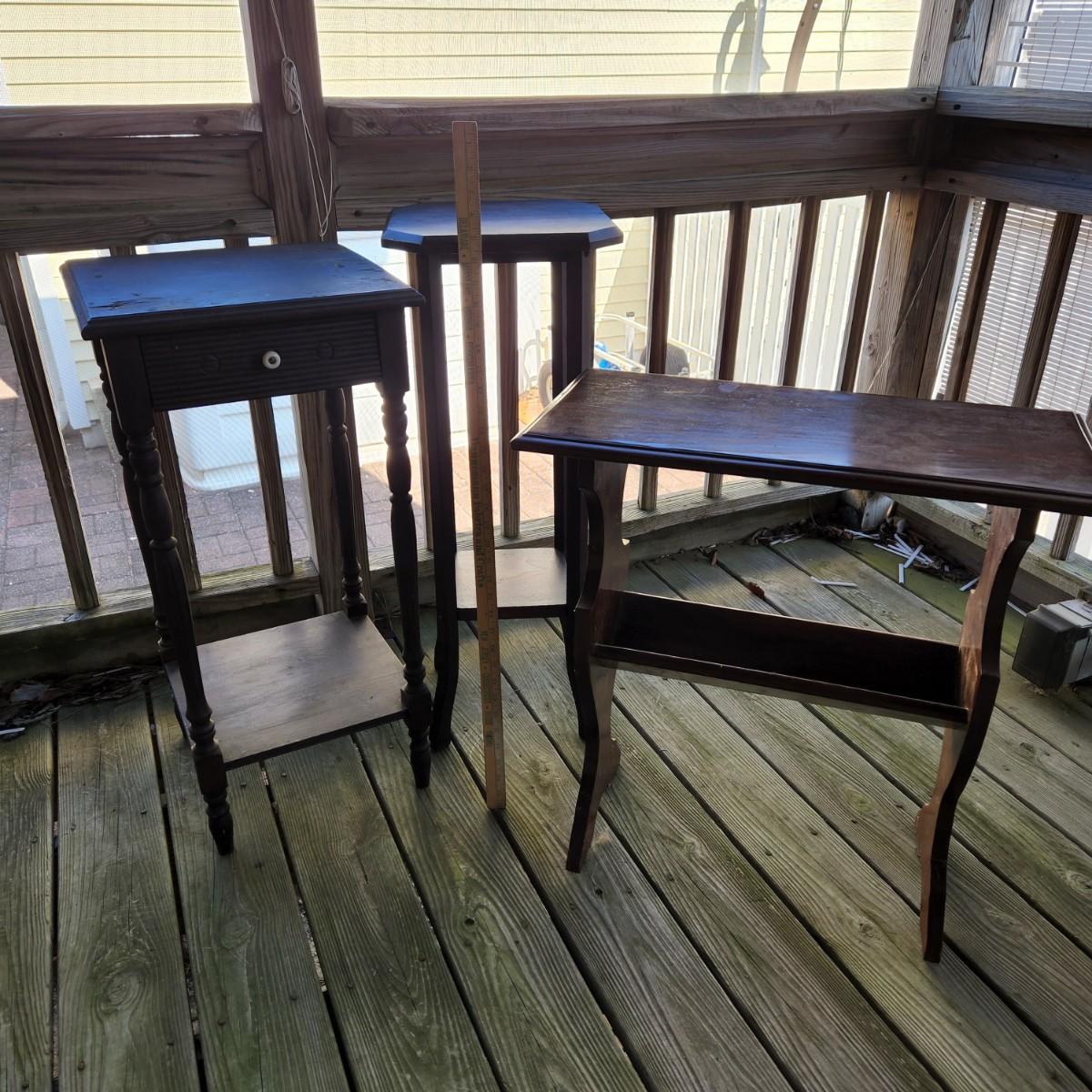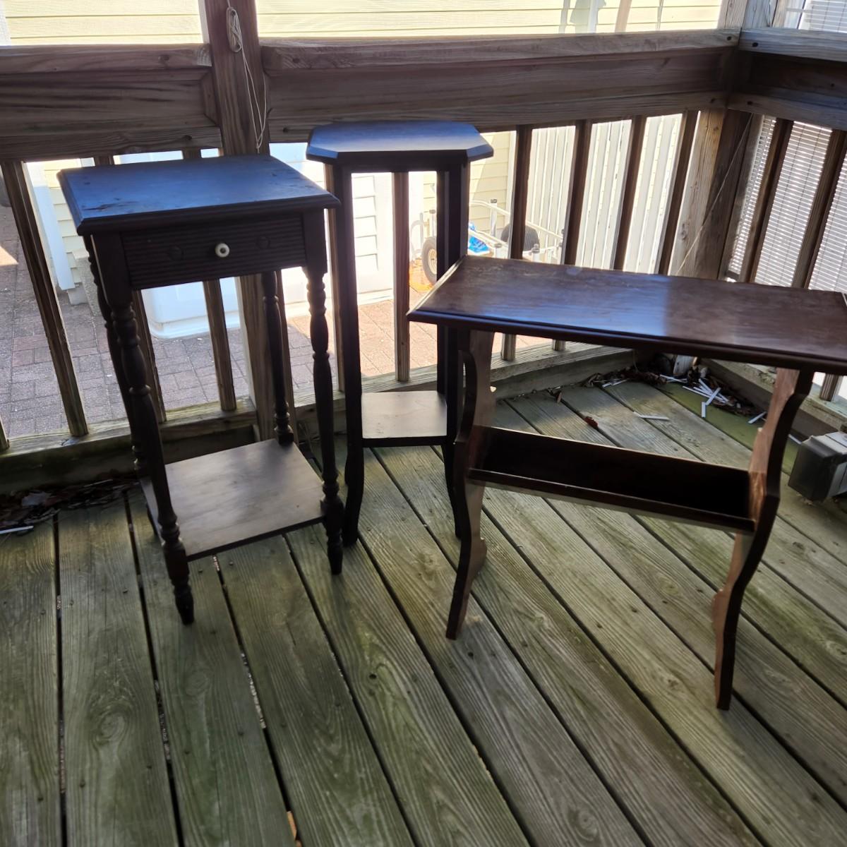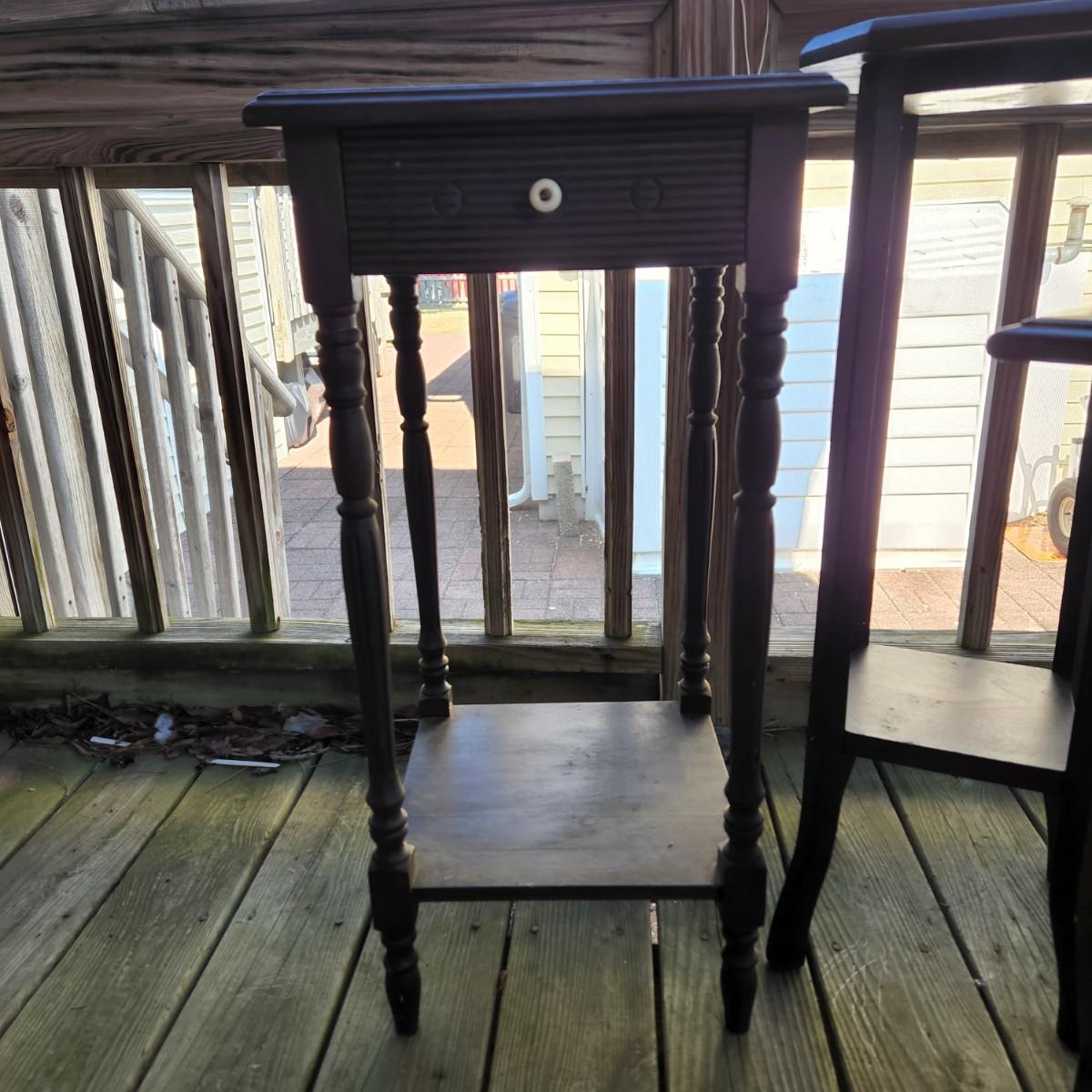 You are getting to antique side tables, believed to be walnut wood, one table has a porcelain knob and really nice detail work. The magazine rack could be a solid maple wood piece however it looks like it was maybe refinished and stain. All tables are in great condition but could use some TLC.