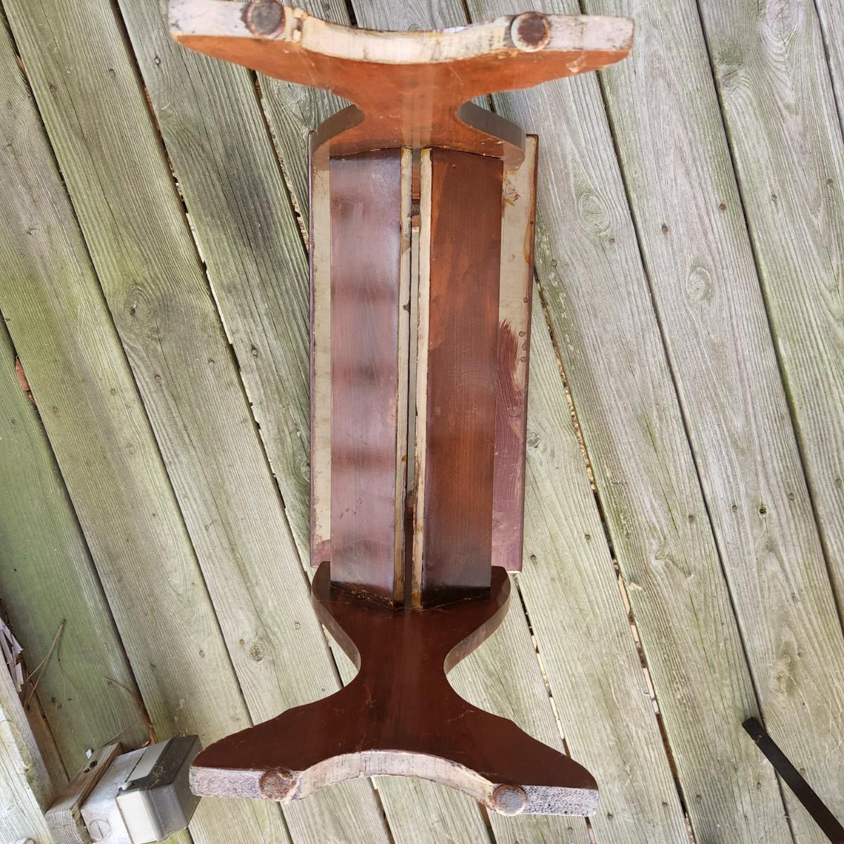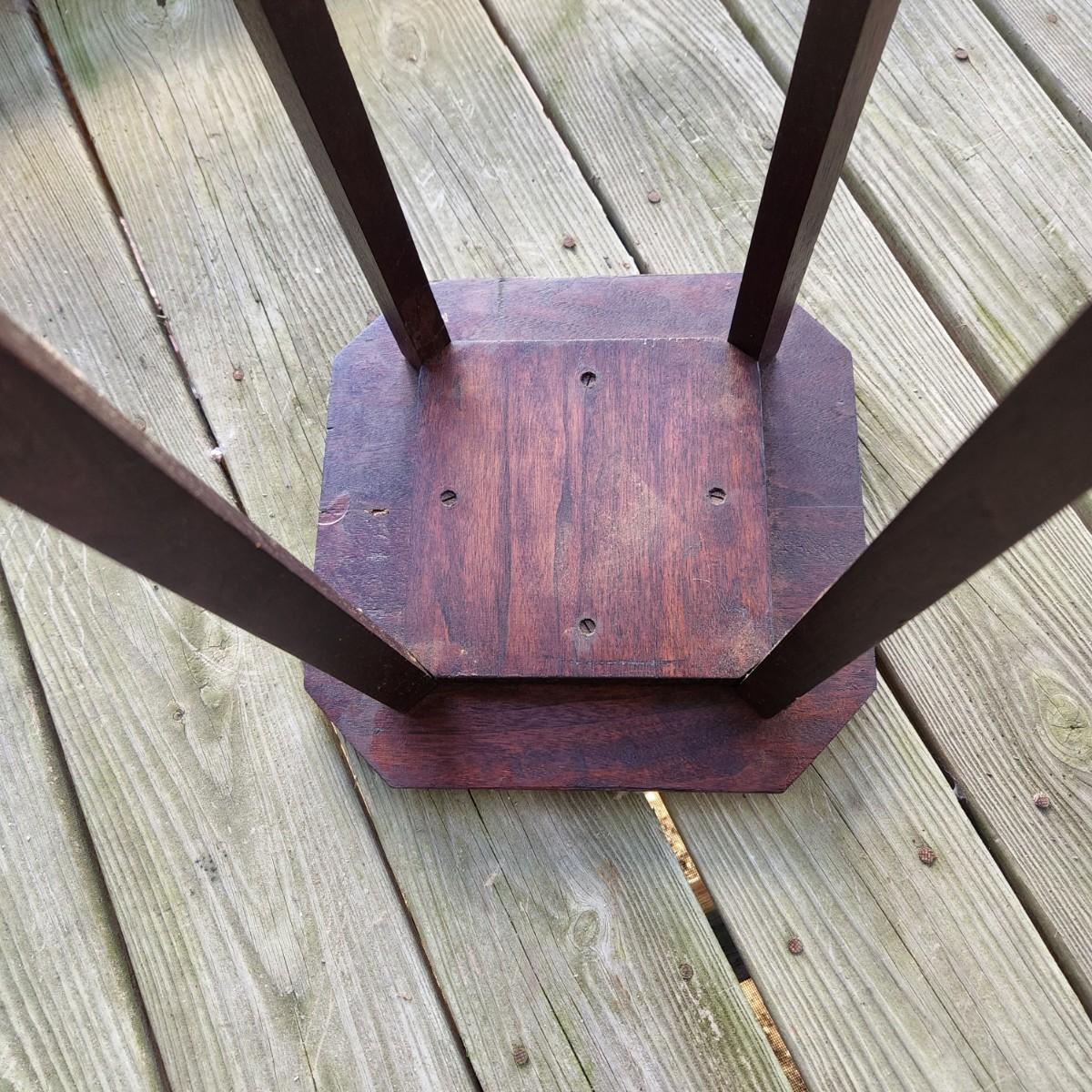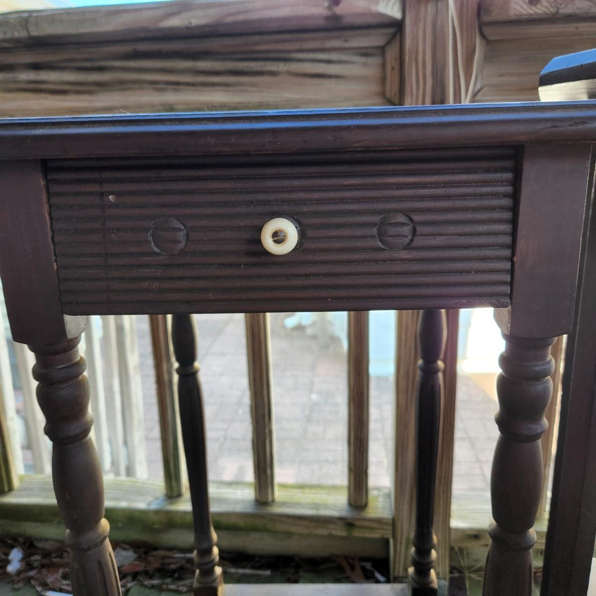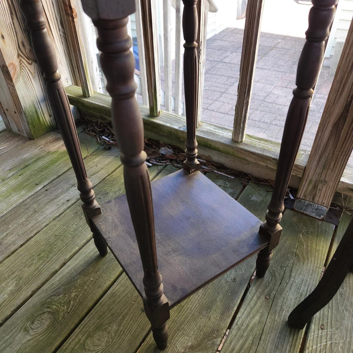 You are getting to antique side tables, believed to be walnut wood, one table has a porcelain knob and really nice detail work. The magazine rack could be a solid maple wood piece however it looks like it was maybe refinished and stain. All tables are in great condition but could use some TLC.