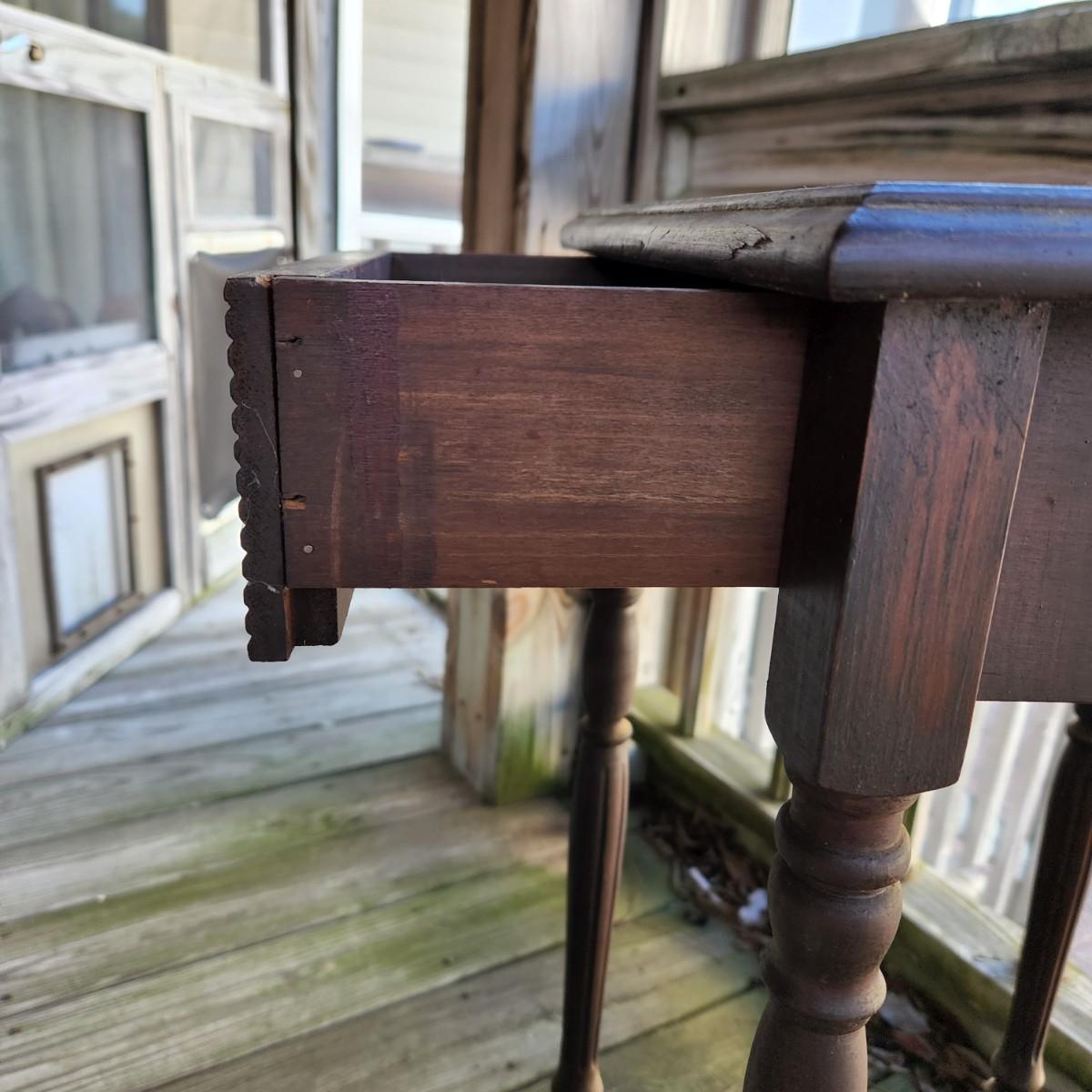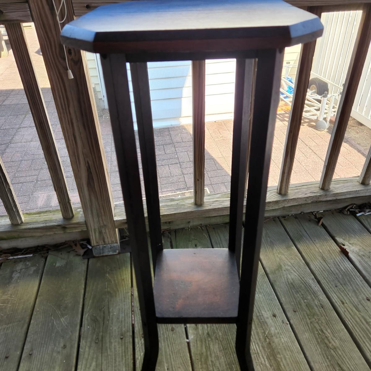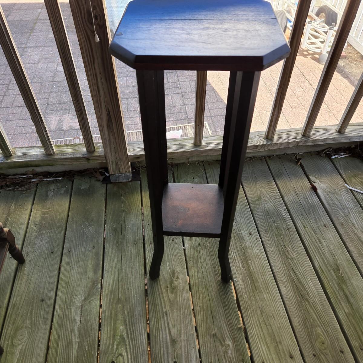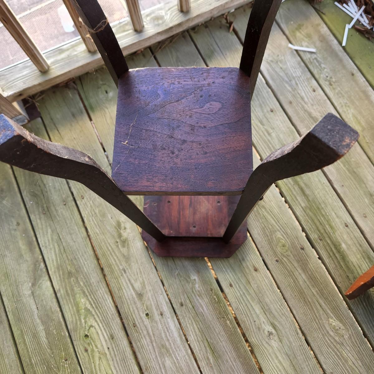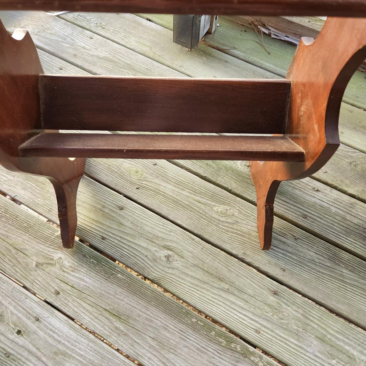 You are getting to antique side tables, believed to be walnut wood, one table has a porcelain knob and really nice detail work. The magazine rack could be a solid maple wood piece however it looks like it was maybe refinished and stain. All tables are in great condition but could use some TLC.