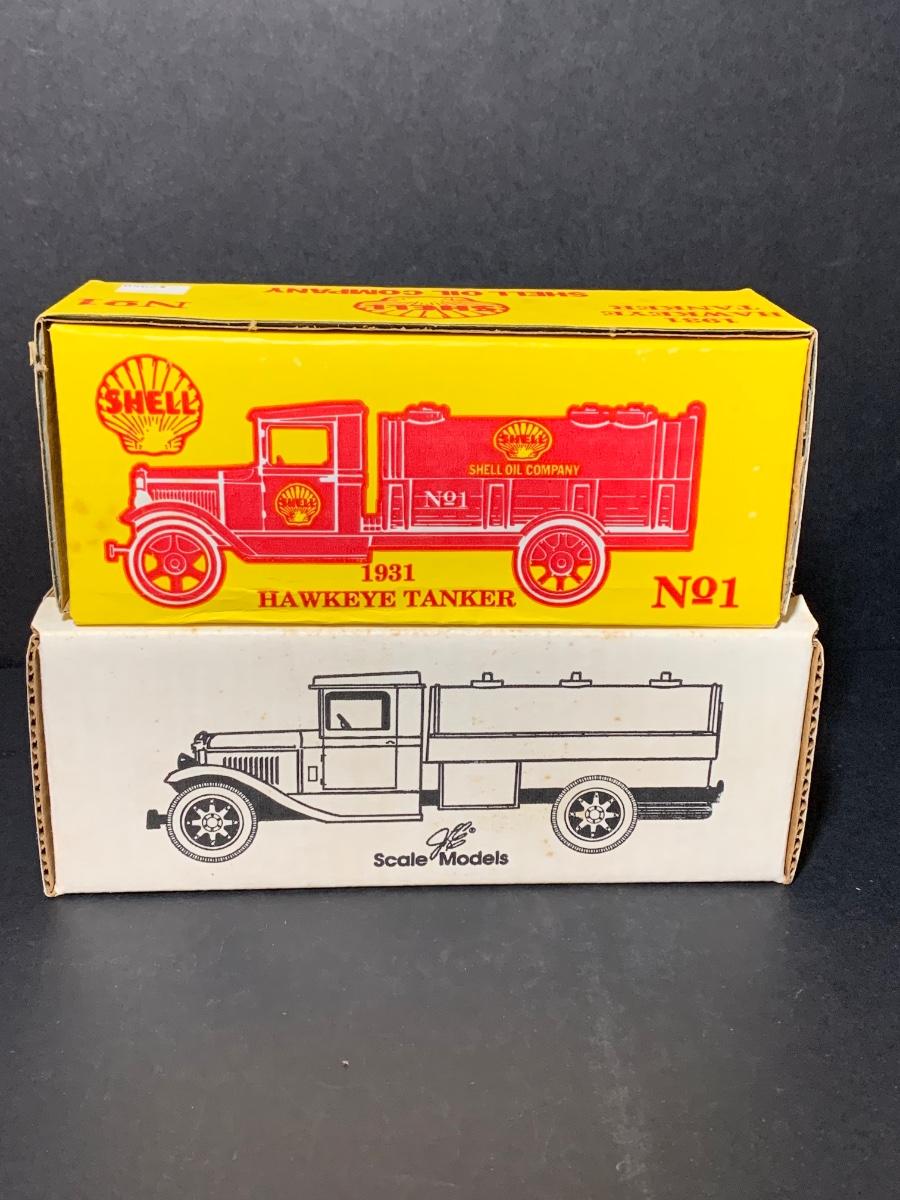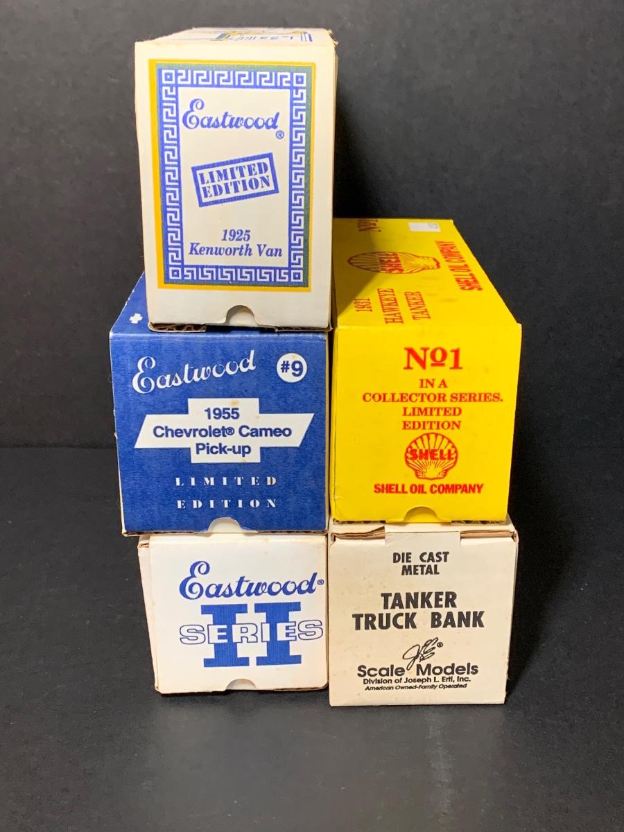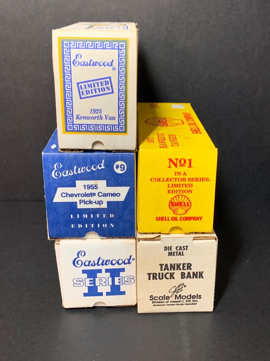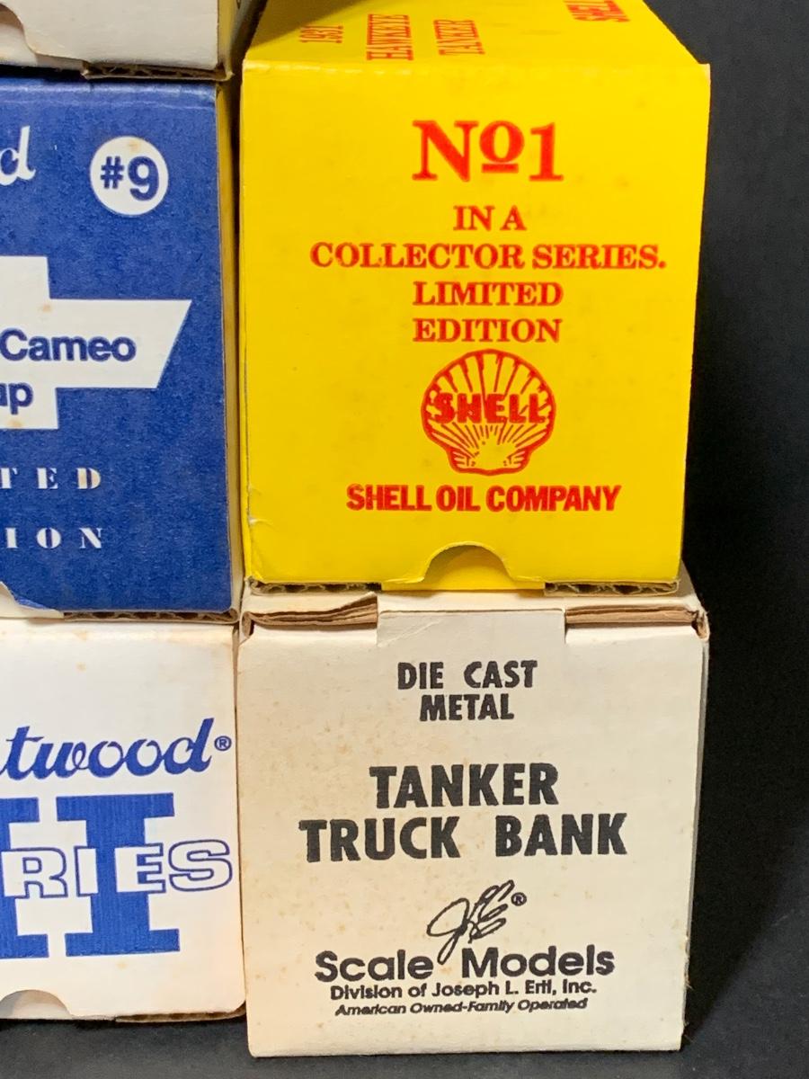 LOT 177R: Ertl Die Cast Metal Collectibles: Cameo Pick-Up, East Wood, Shell & Tanker Truck Bank