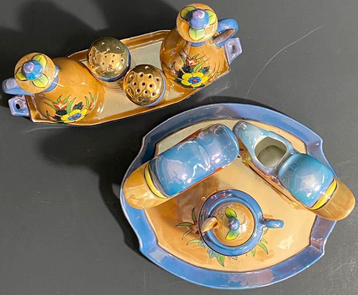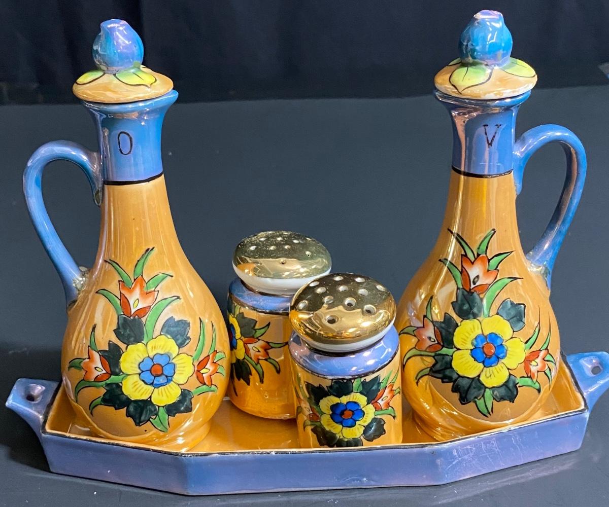 LOT: 5  Vintage Condiment Sets w/Vinegar & Oil Cruet Set, Salt-Pepper & More