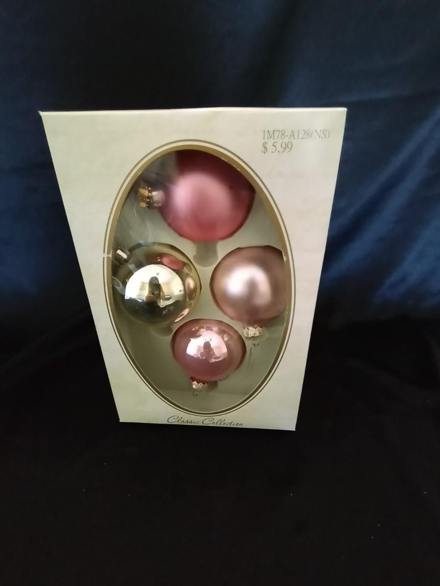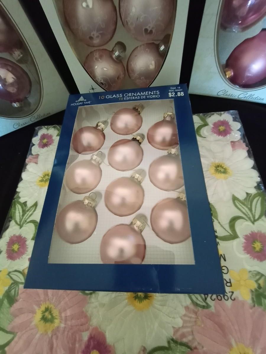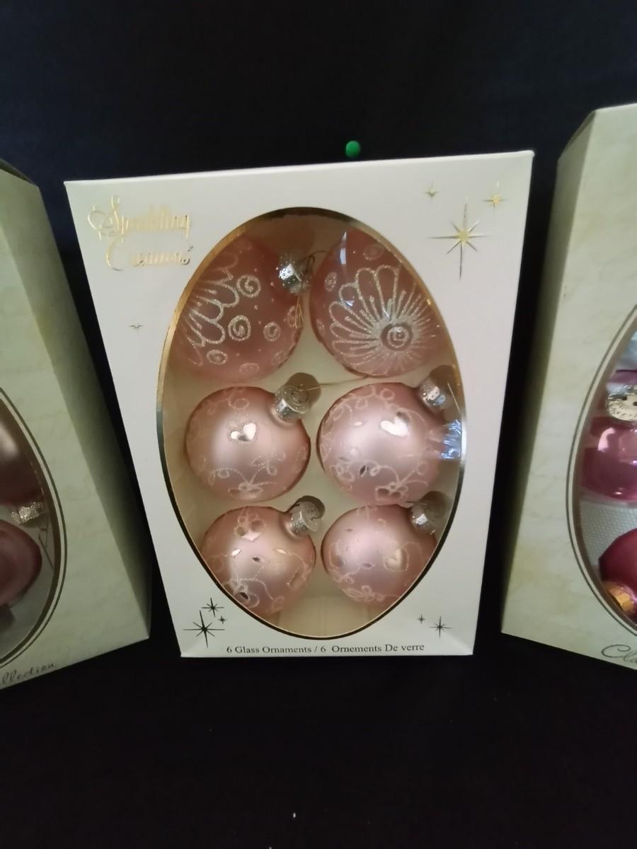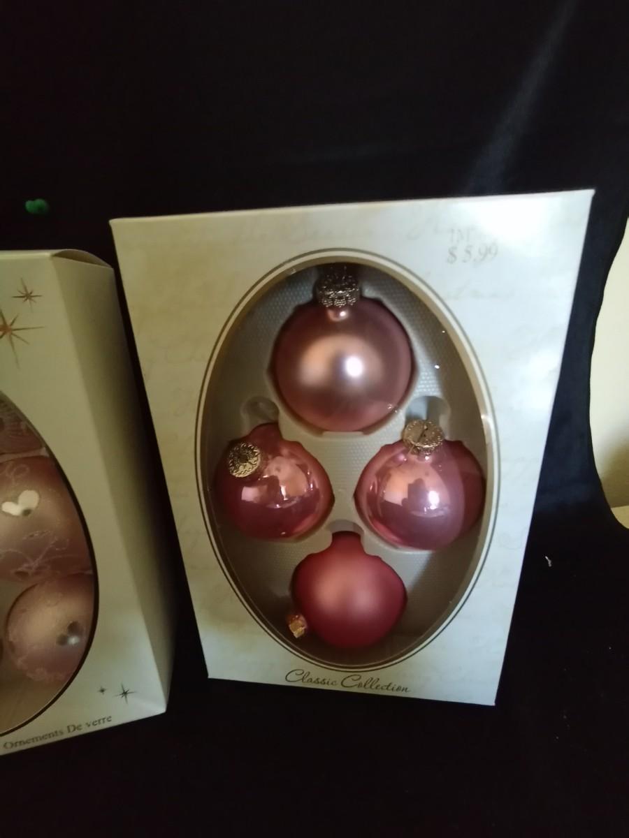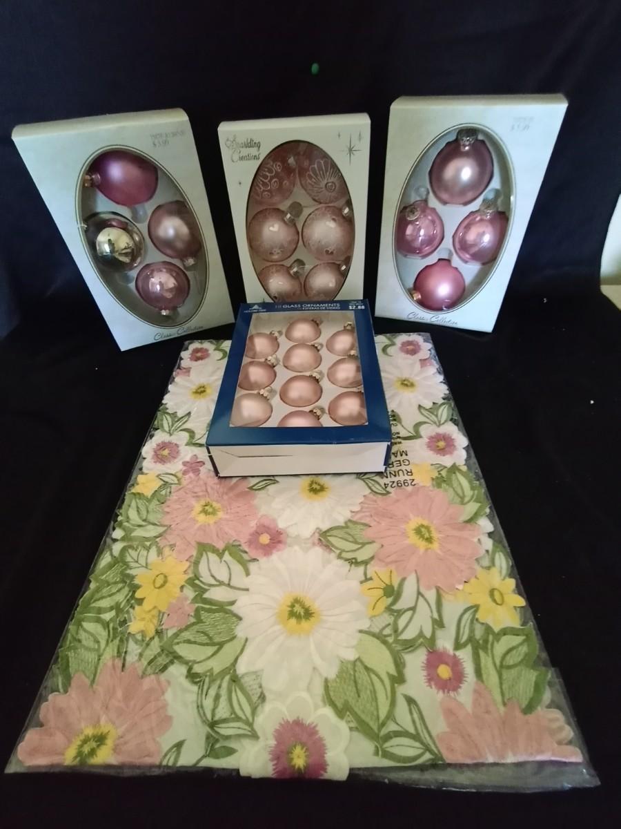 4 BOXES OF PINK GLASS ORNAMENTS AND TABLE RUNNER