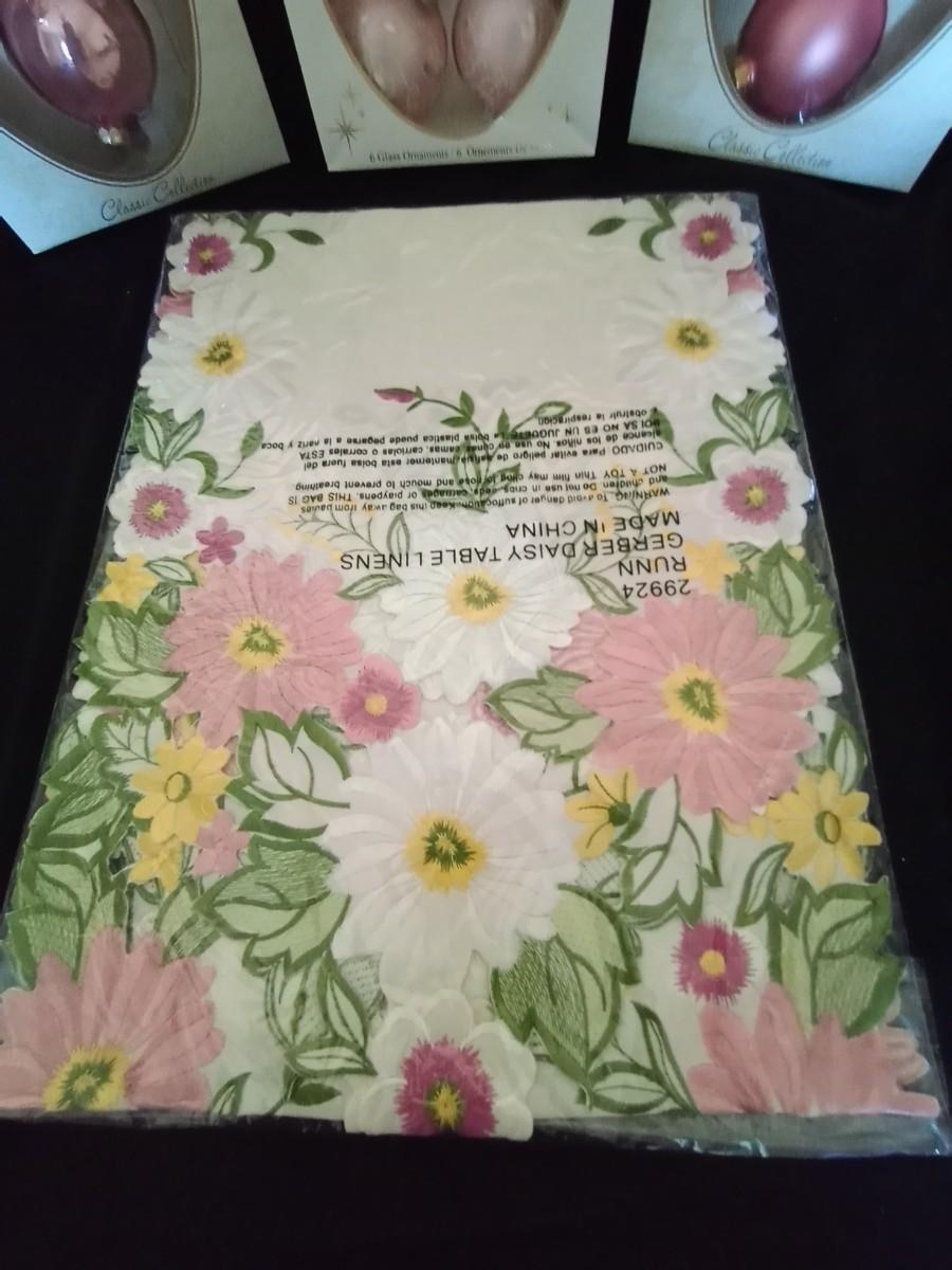 LOT 404 PINK GLASS ORNAMENTS AND TABLE RUNNER