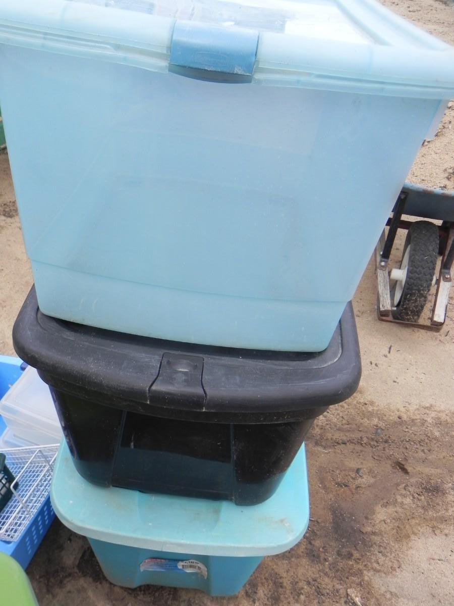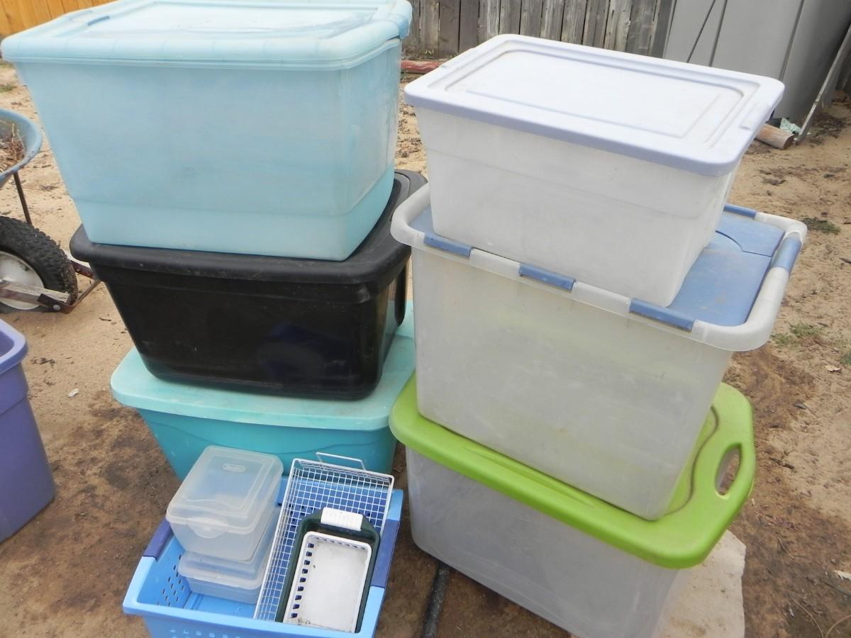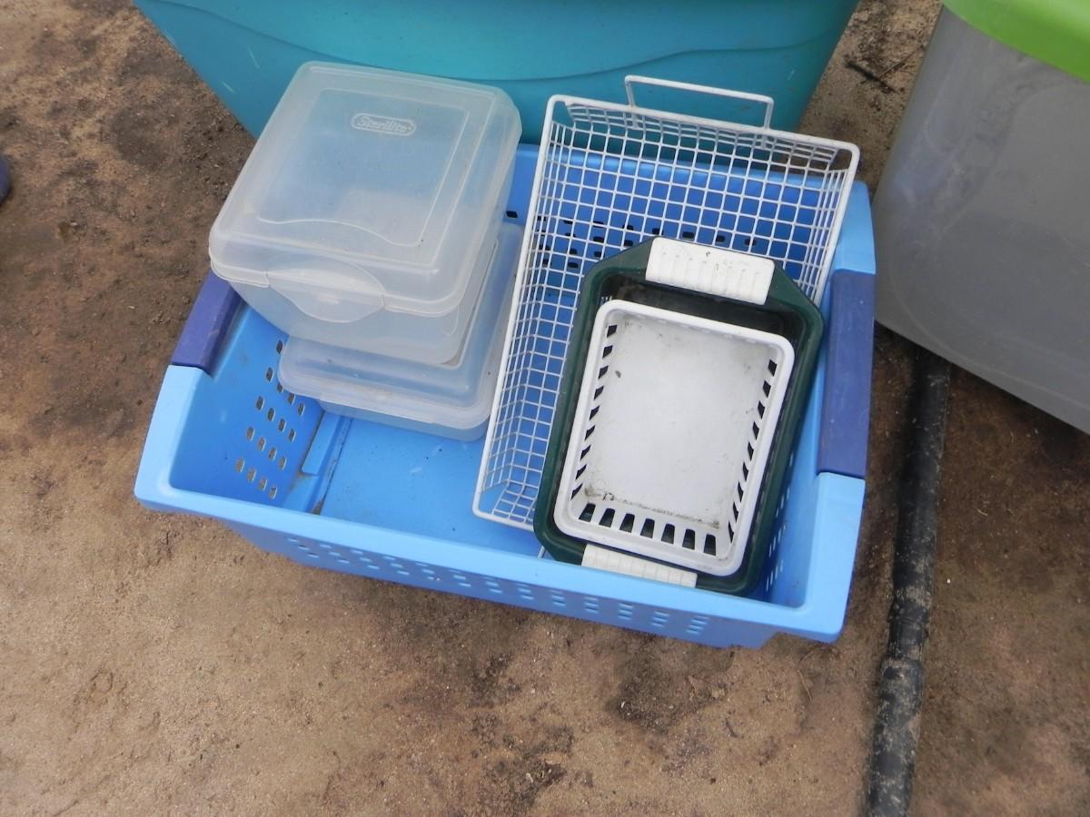VARIETY OF STORAGE CONTAINERS- 62 QUART, 40 GALLON, SMALL PLASTIC TRAYS & BASKETS AND SMALLER CONTAINERS WITH LIDS