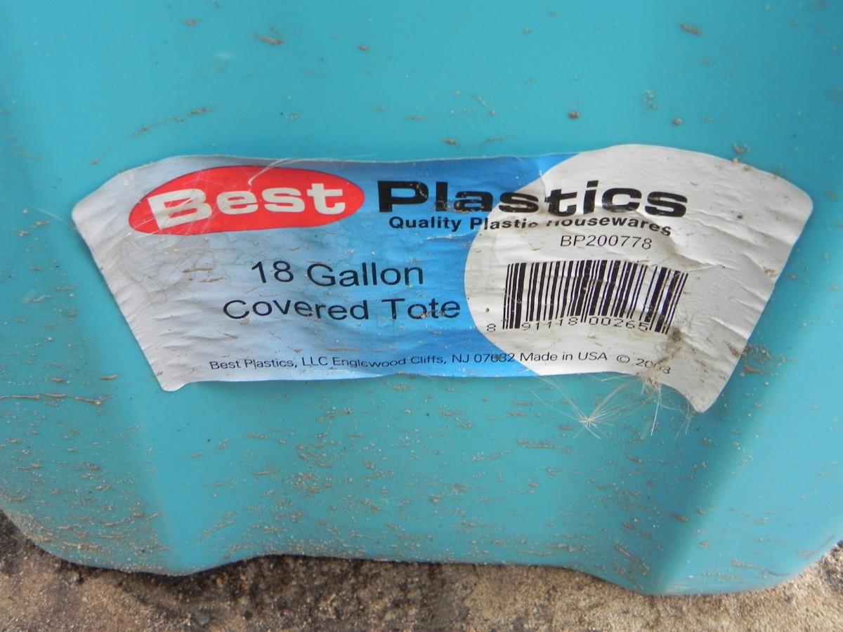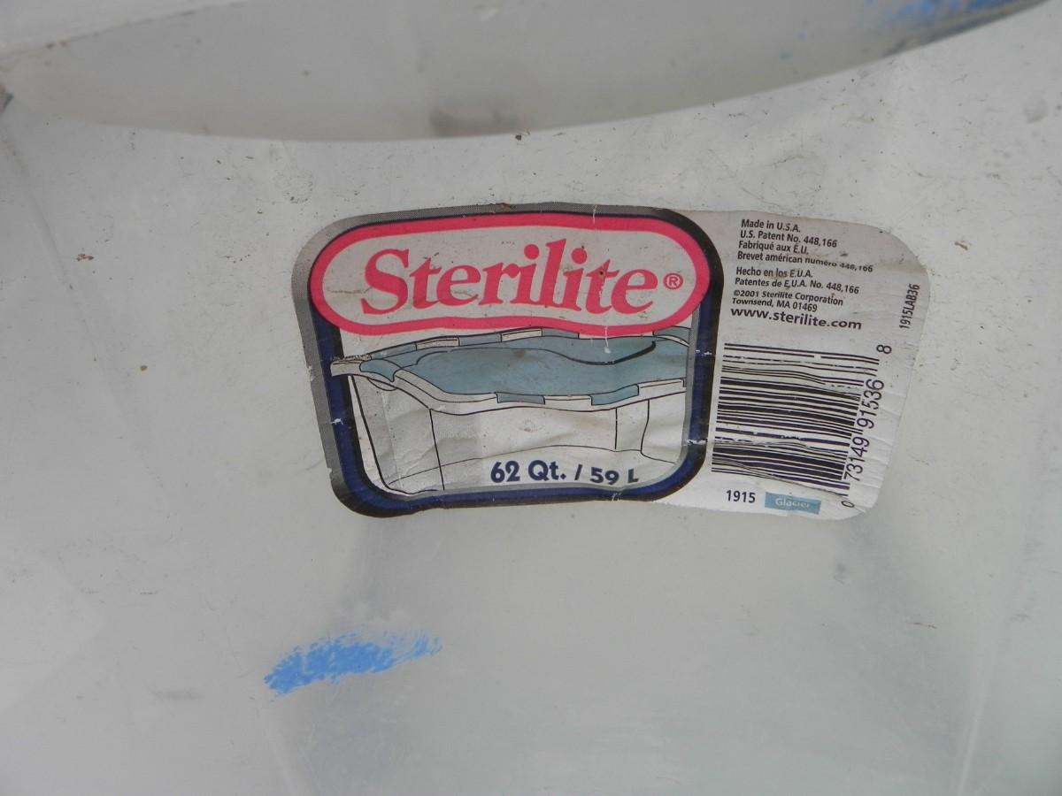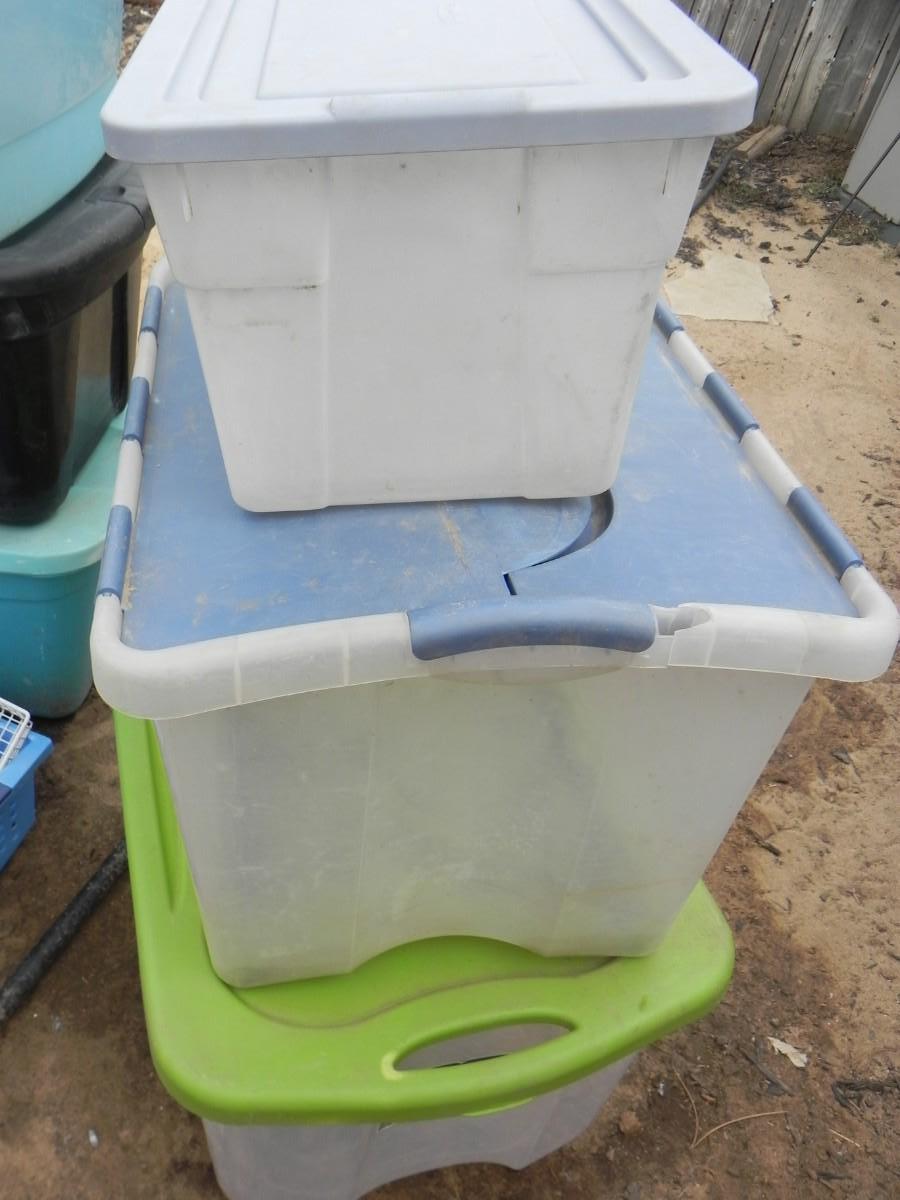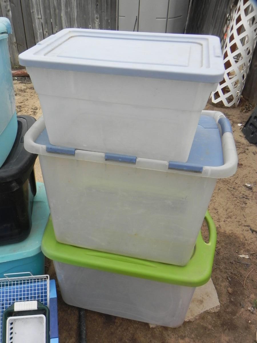VARIETY OF STORAGE CONTAINERS- 62 QUART, 40 GALLON, SMALL PLASTIC TRAYS & BASKETS AND SMALLER CONTAINERS WITH LIDS