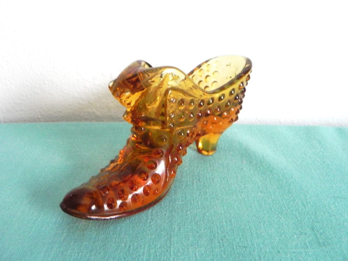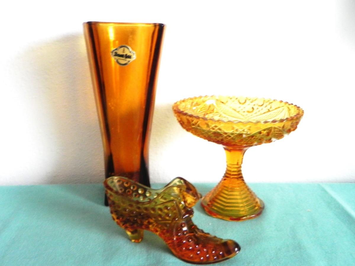 VINTAGE DESET GOLD VASE-AMBER FENTON SHOE- STEMMED CANDY DISH