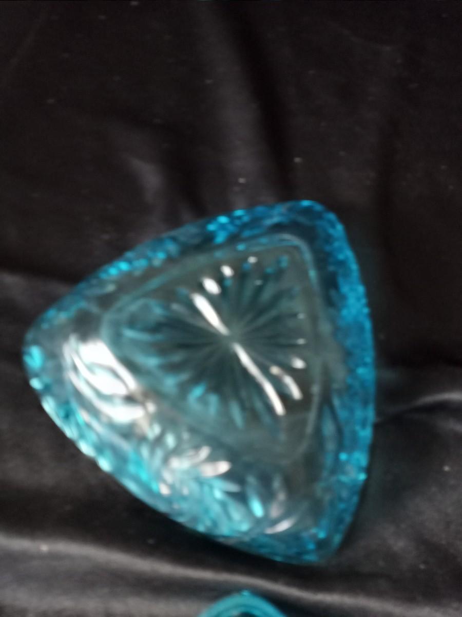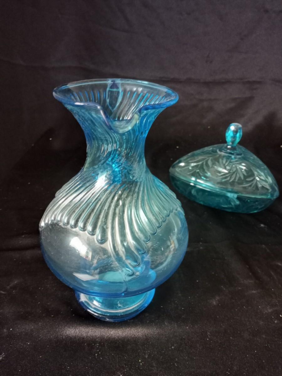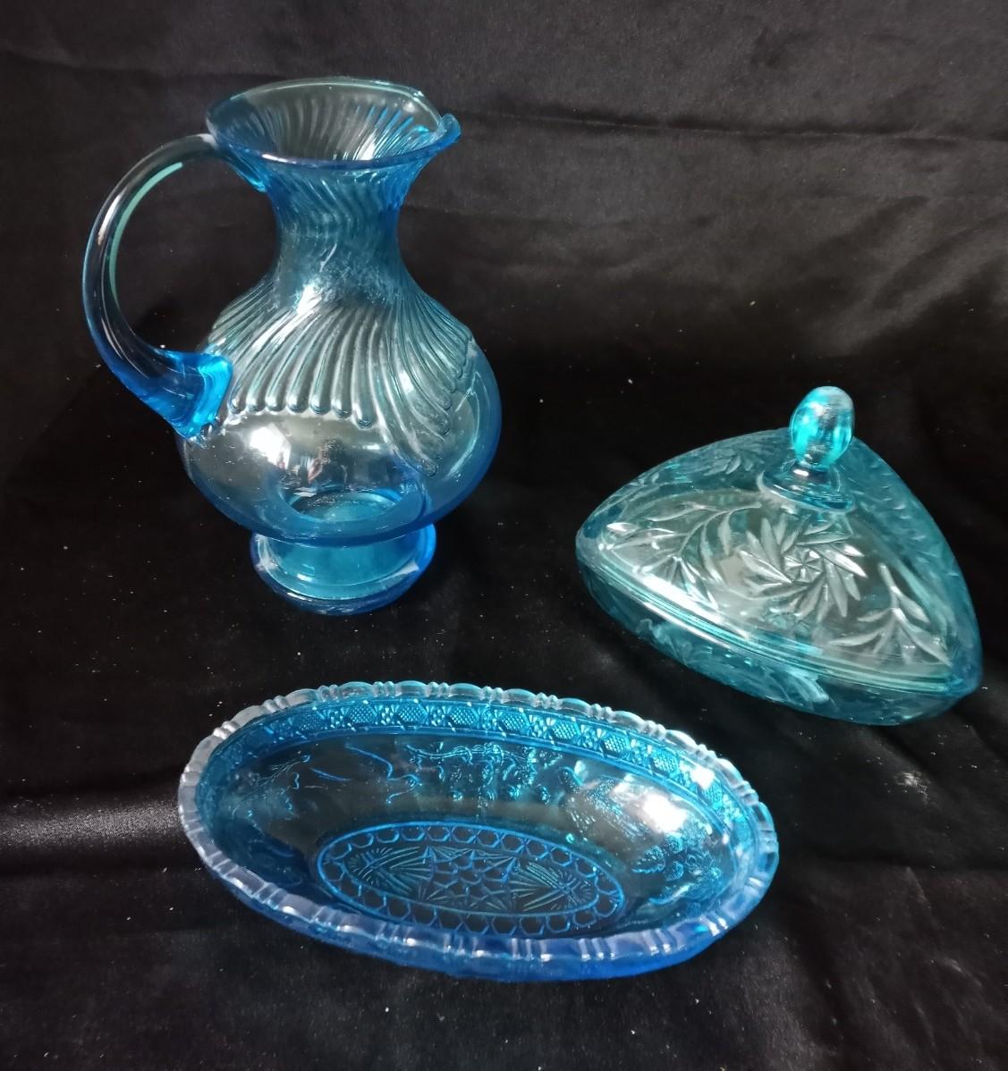 BLUE GLASS PITCHER APPROX. 10" TALL AND 2 CANDY DISHES ONE HAS A LID