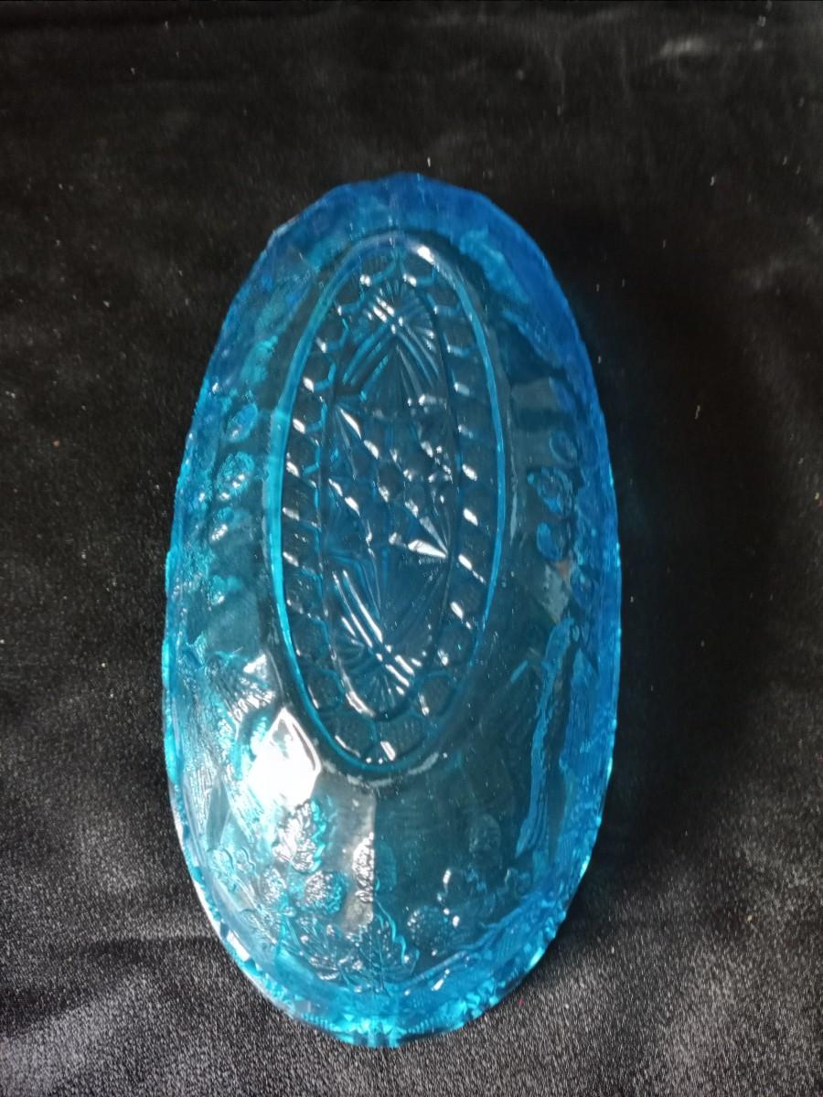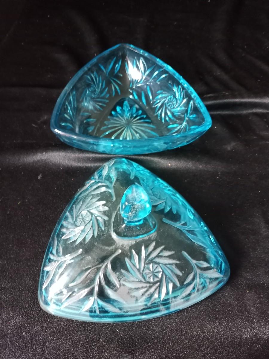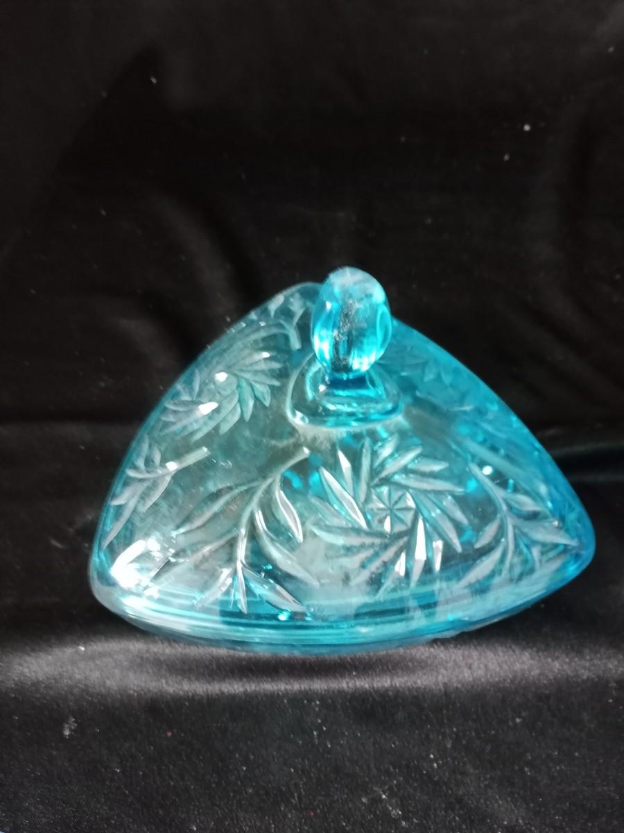 BLUE GLASS PITCHER APPROX. 10" TALL AND 2 CANDY DISHES ONE HAS A LID