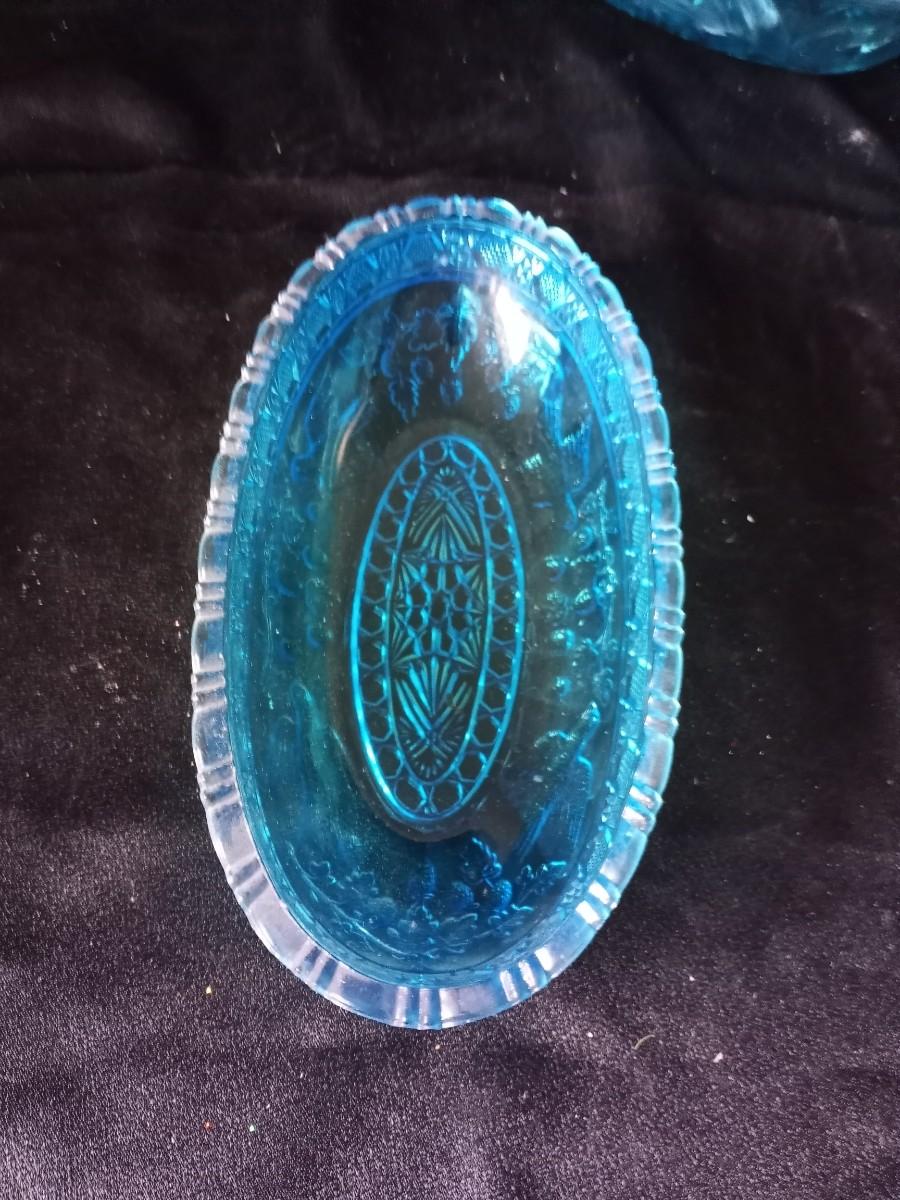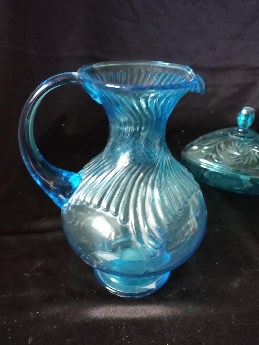 LOT 140 BLUE GLASS PITCHERAND CANDY DISHES