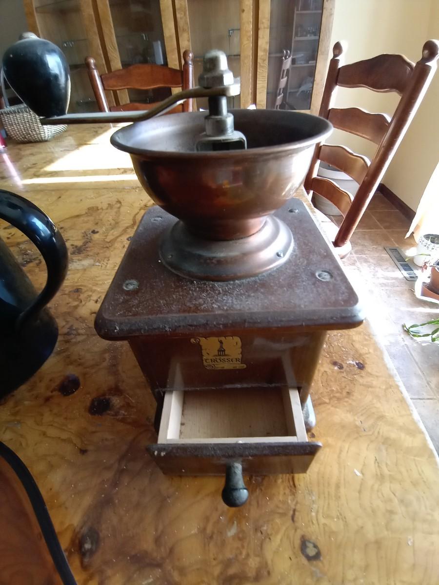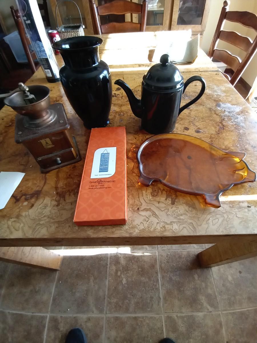 COFFEE GRINDER-TEAPOT-VASE-TIARA GLASS PIG PLATTER AND NOVELTY SIGN
