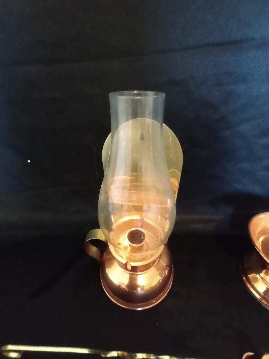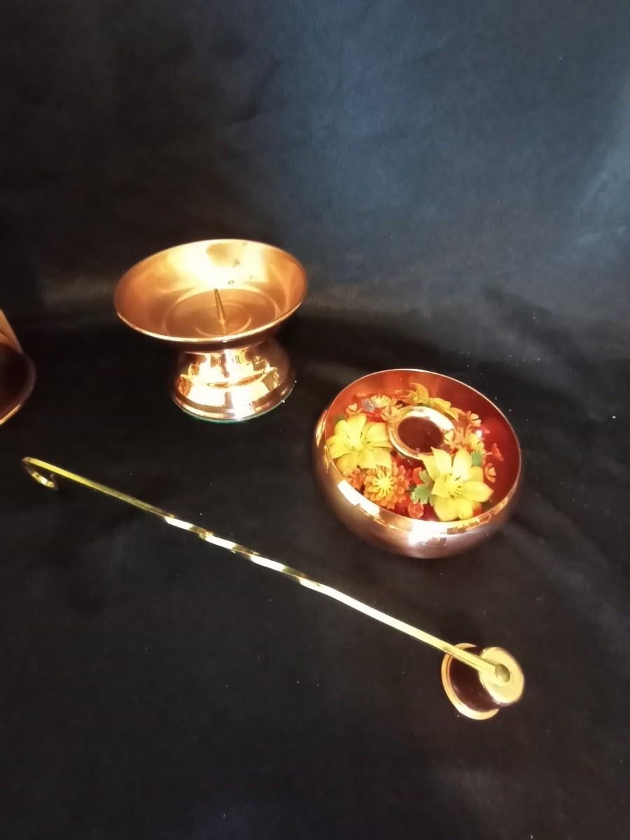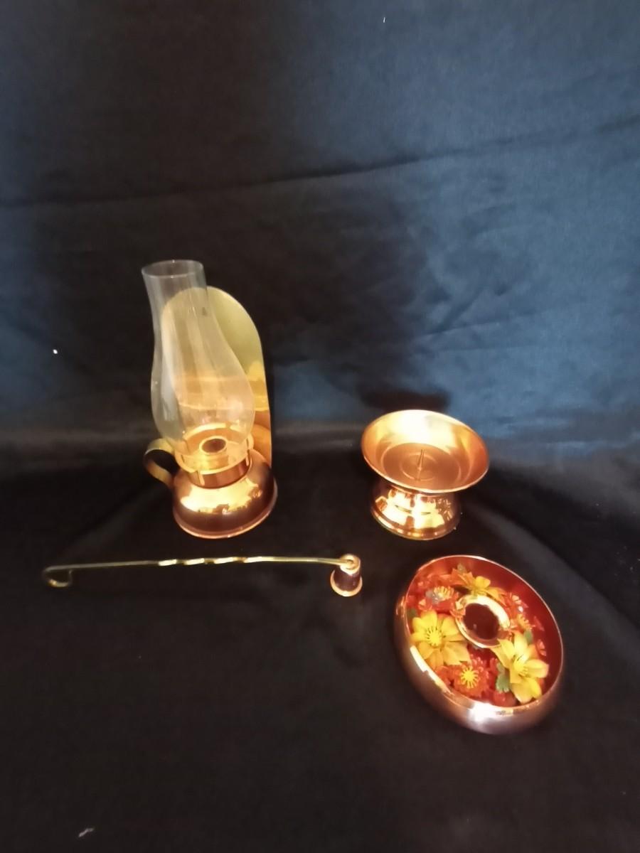 LOT 442  COPPER CRAFT LANTERN, CANDLE SNUFFER, 2 DISHES