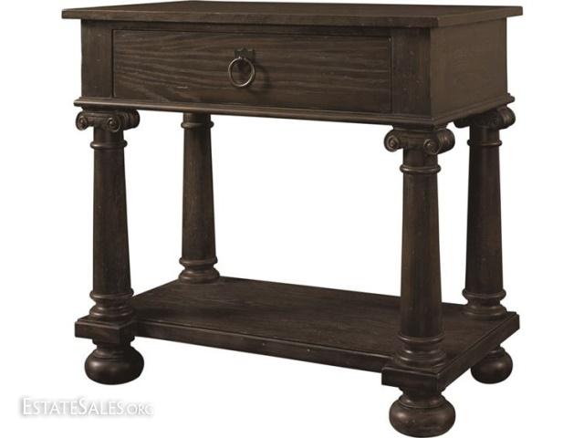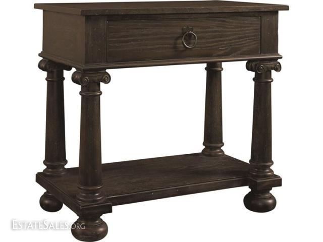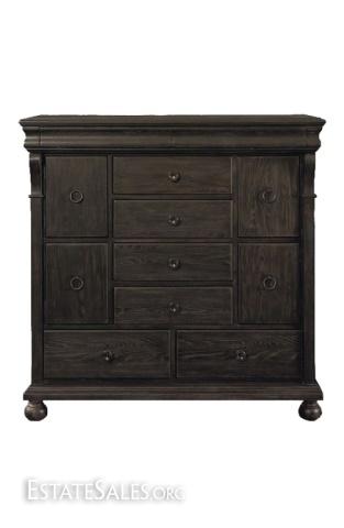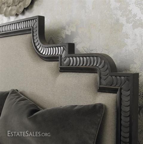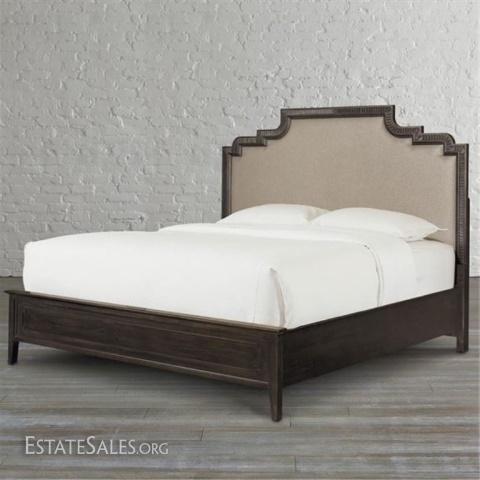 LOT 75C: 4 PC BASSETT EMPORIUM QUEEN BEDROOM SET, INCLUDES BED, 2 NIGHTSTANDS, DRESSER / CHIFFEROBE. SMOKED OAK FINISH, WITH PUMICE GRAY UPHOLSTERED HEADBOARD, IONIC COLUMNS AND CLASSIC REVIVAL STYLE HARDWARE WITH DIRECTOIRE SHIELD BACK PLATES IN DARK ANTIQUE BRASS FINISH, VERY GOOD GENTLY USED CONDITION, MATTRESS AND BEDDING NOT INCLUDED IN LOT., SKU208.07