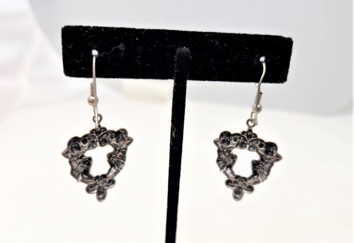 Art Nouveau style sterling silver pierced earrings - about 2" long - florid angels/cherubs design. Lightweight.