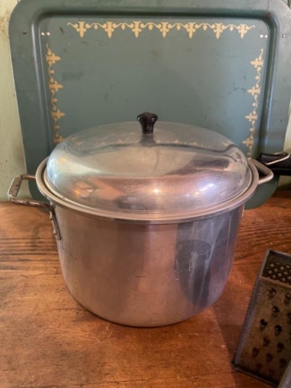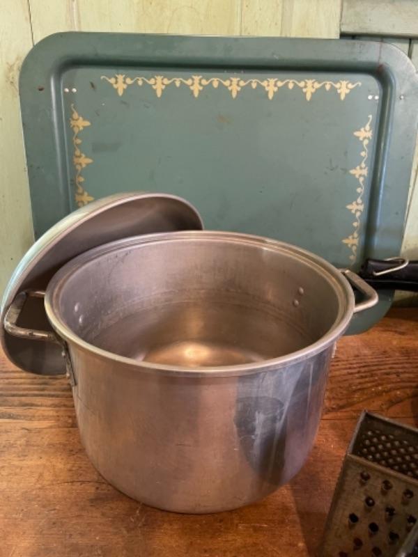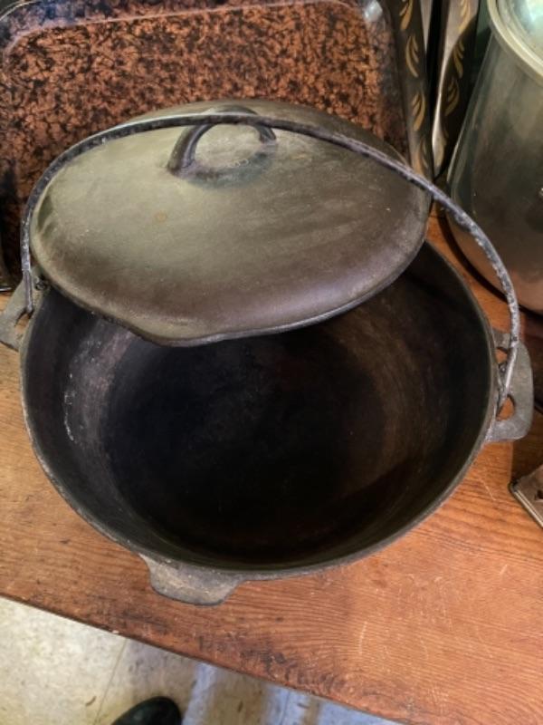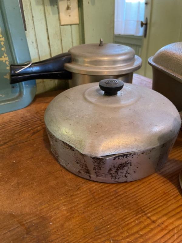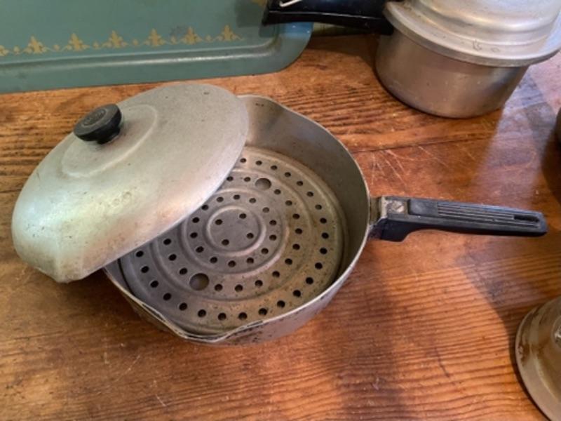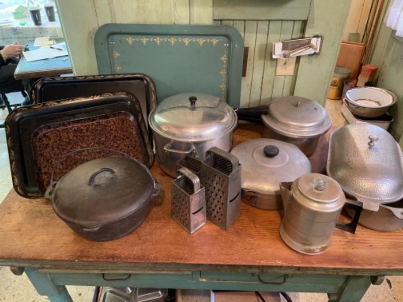 Lot 75K. Assortment of pots, pans, trays, pressure cooker, Dutch oven (Wagner Ware)--$85