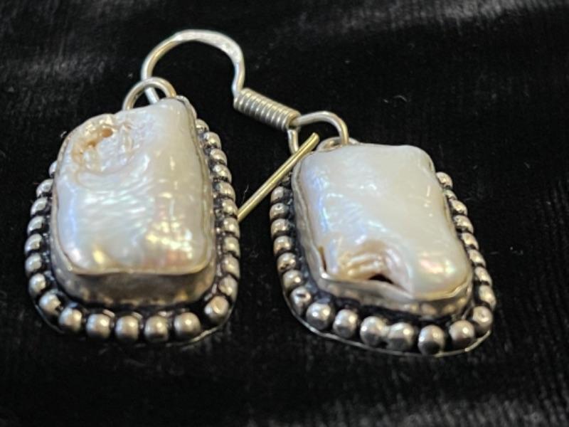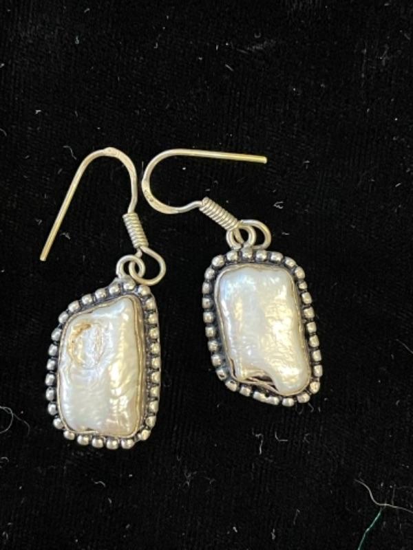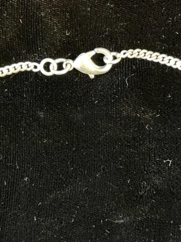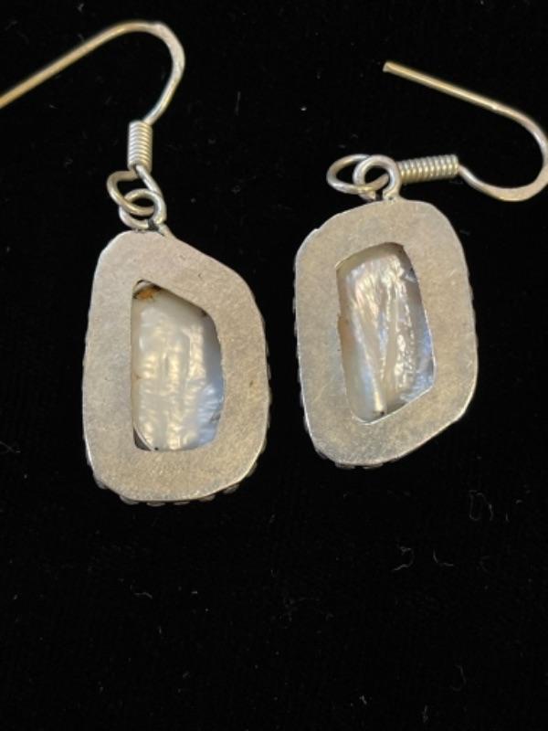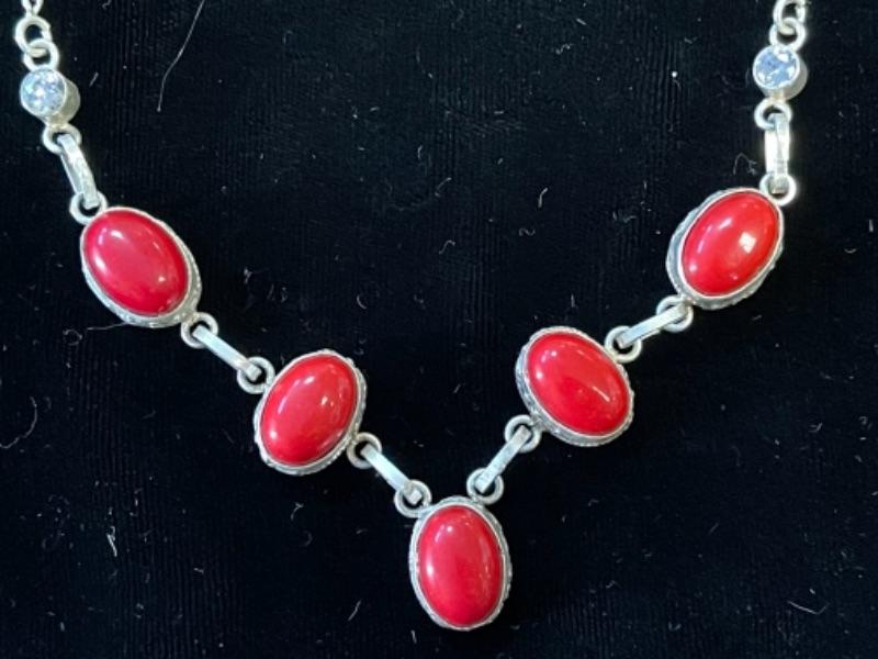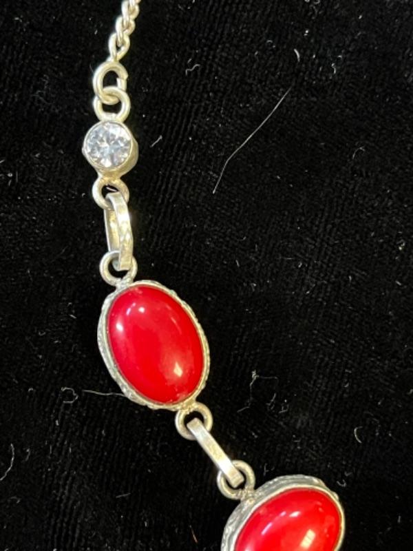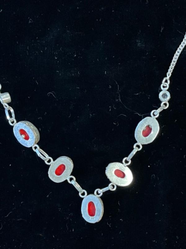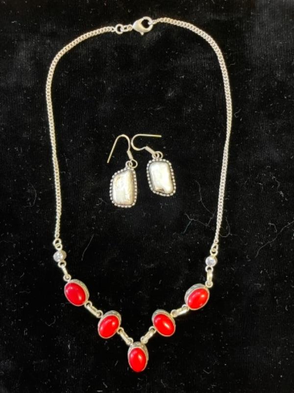 Lot 75LD. Sterling silver necklace and earrings; necklace with red stones set in silver and flanked by rhinestones; one pair of earrings with opalescent stone set in sterling silver--$85
