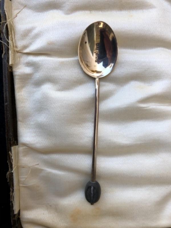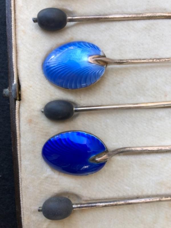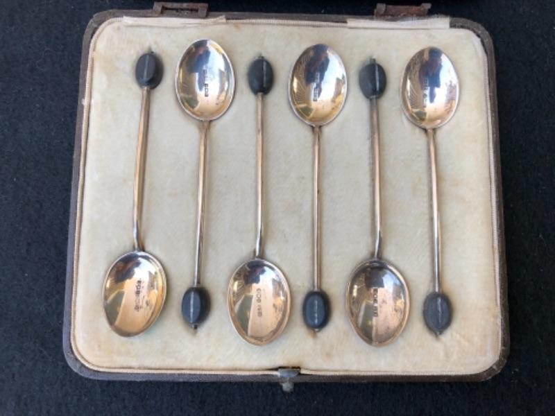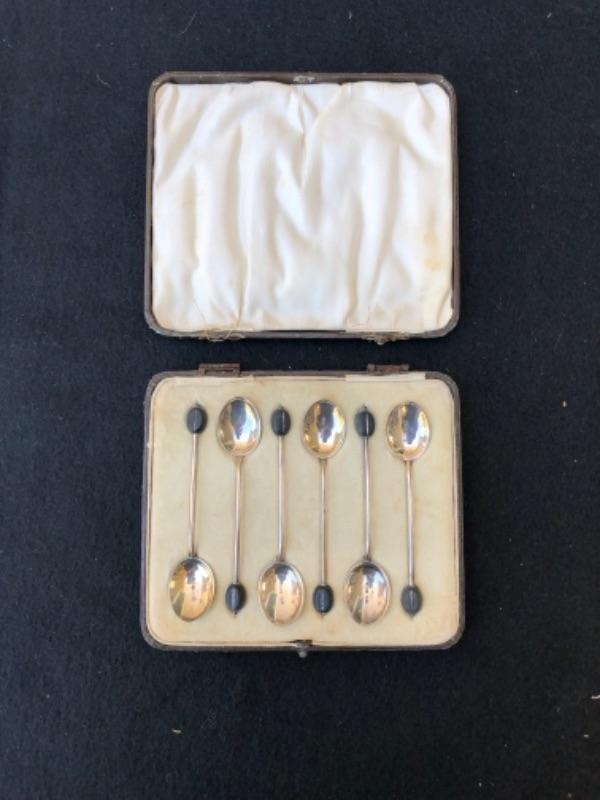Lot 75S. Six English Antique Birmingham Sterling Silver Demitasse Spoons in case, made in England, black bean shape on end of spoon, enameled shell shape Art Deco Style “” $27.50