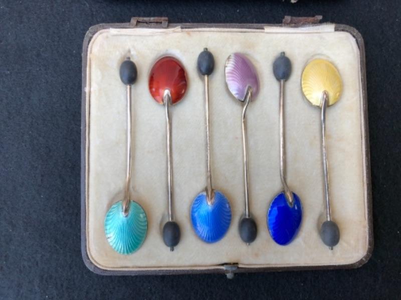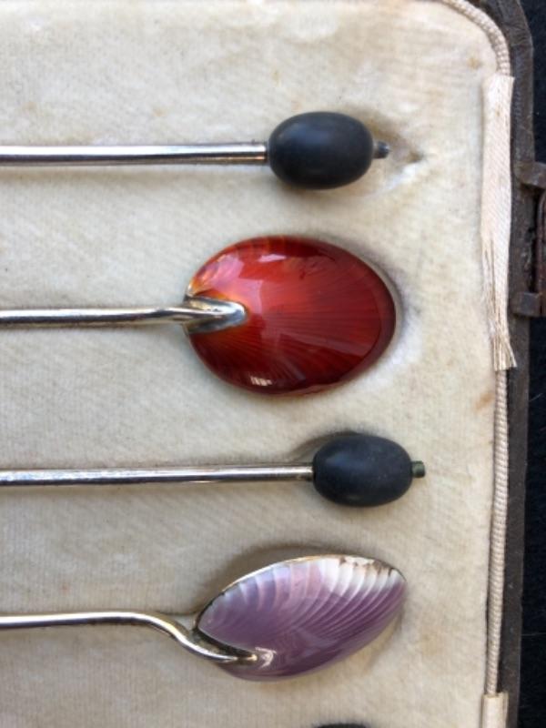 Lot 75S. Six English Antique Birmingham Sterling Silver Demitasse Spoons in case, made in England, black bean shape on end of spoon, enameled shell shape on back of spoon in 6 colors, branded H.C.D., Art Deco Style, Case hinges are detached